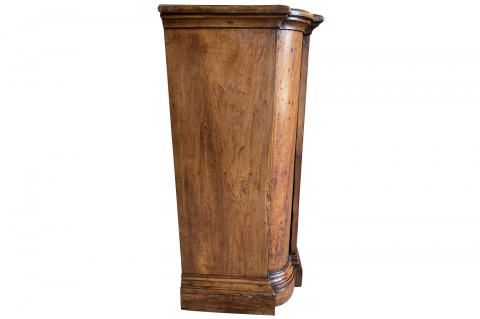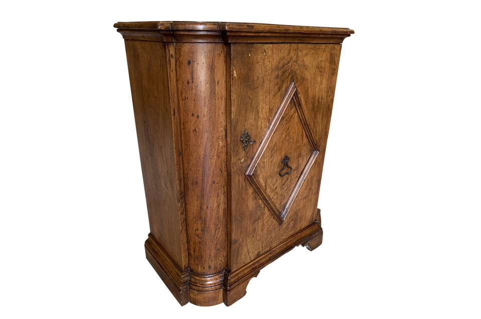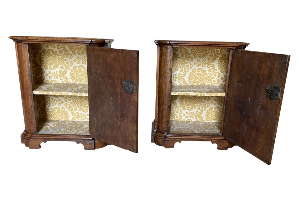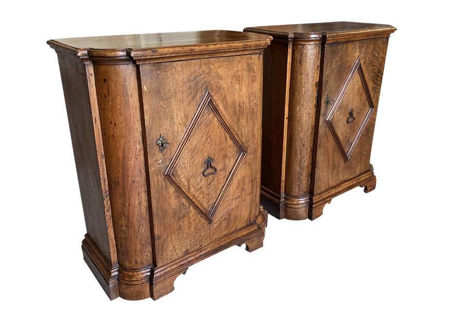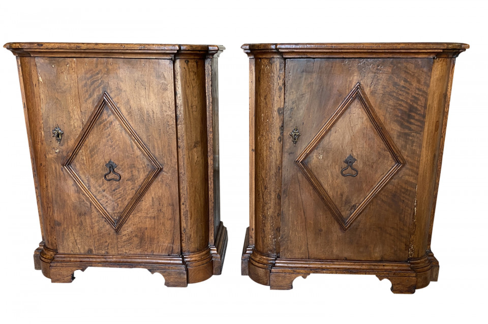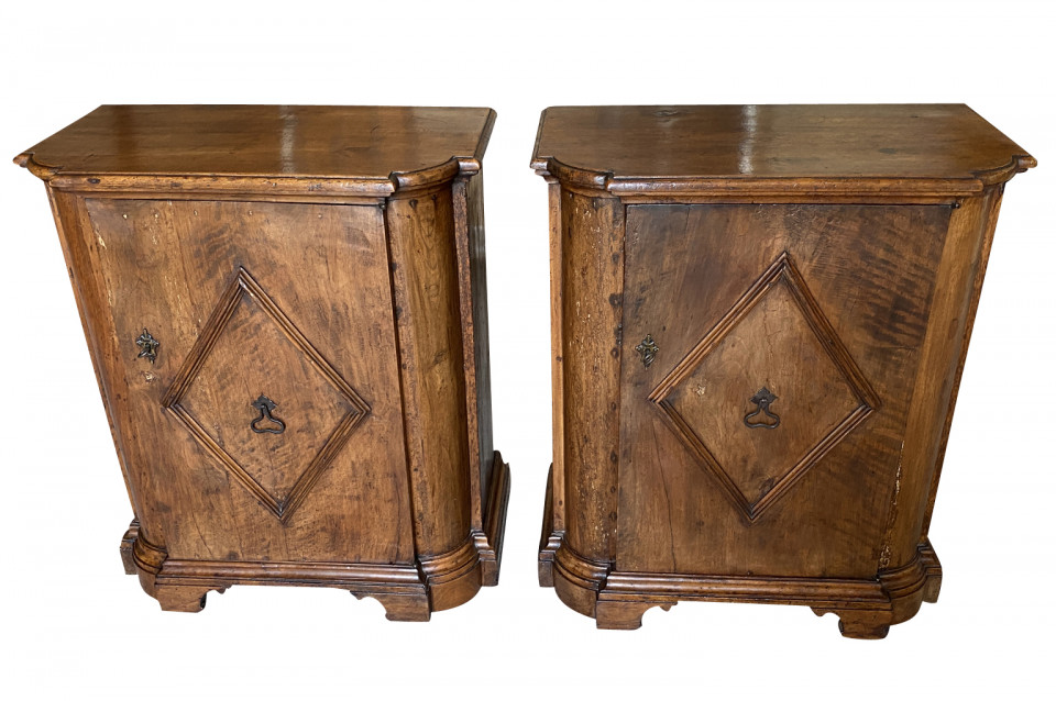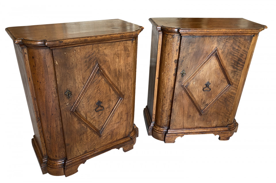 A very handsome early 19th century Pair Of Credenzino from the Tuscany region of Italy. Soundly constructed from stunning walnut - with scantonata form, molded door panels resting on bracket feet. Beautiful patina and graining.
