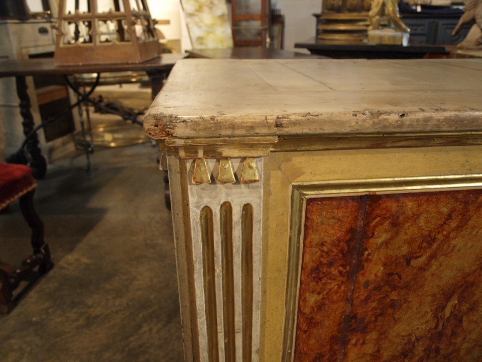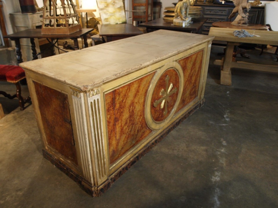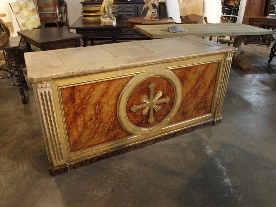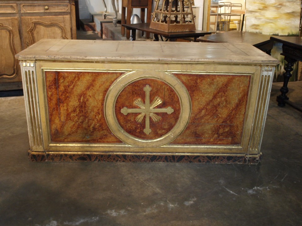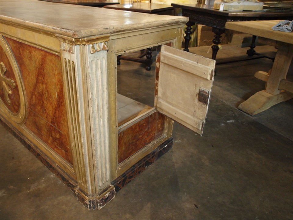 A stunning 18th century Altar from Spain. Constructed from polychromed and gilt wood with wonderful faux marble and water gilding detail. Fabulous as a counter or island.