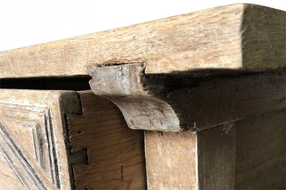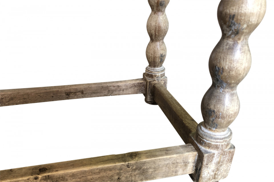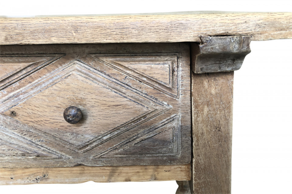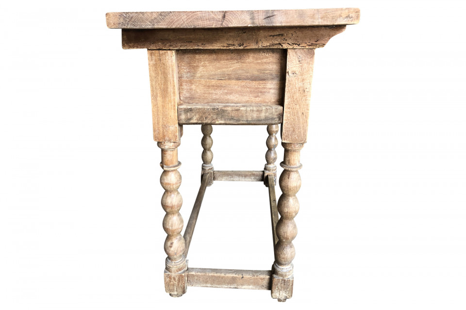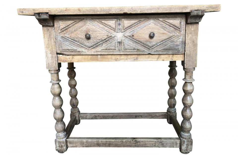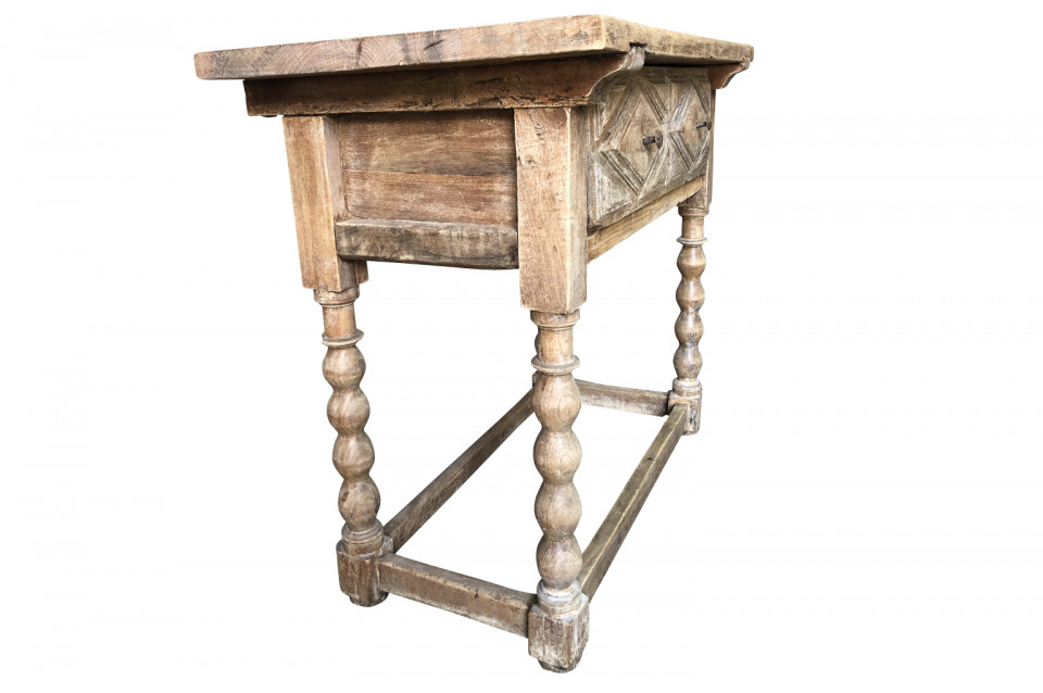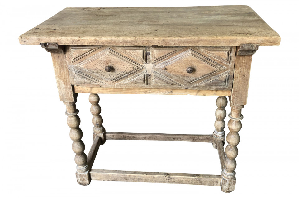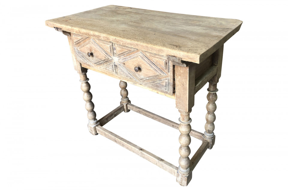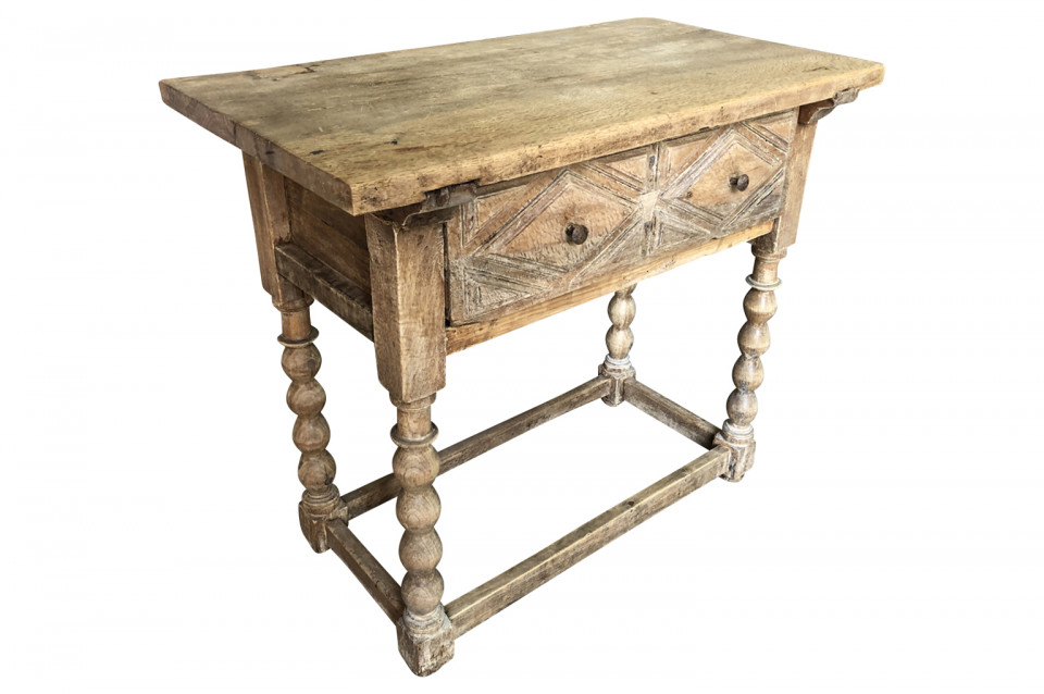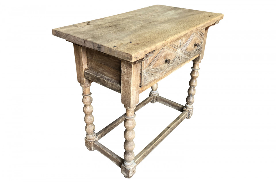 A charming early 19th century Spanish Louis XIII style side table soundly constructed from washed chestnut with a single drawer, turned legs and a solid board top.