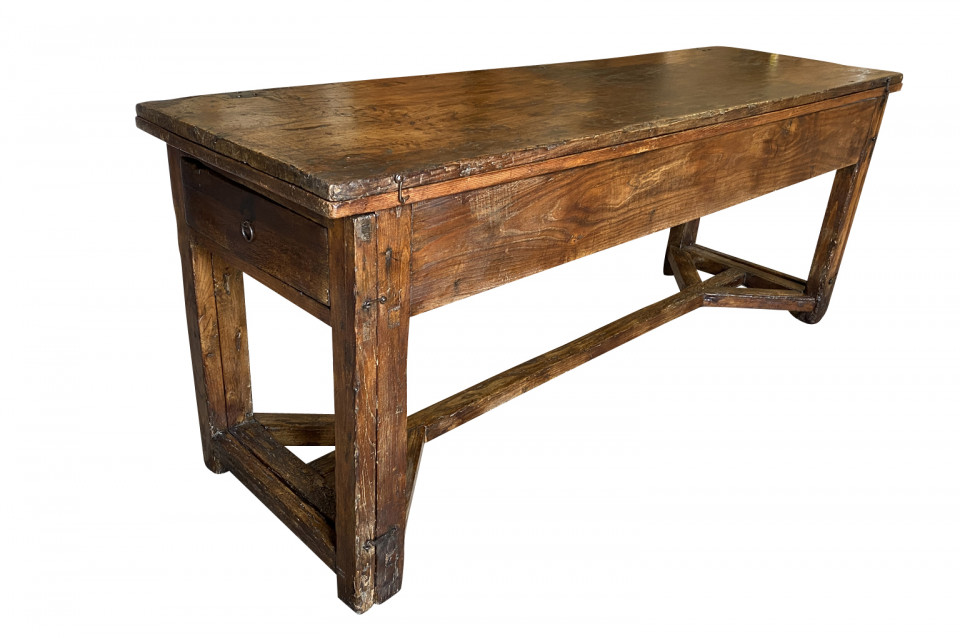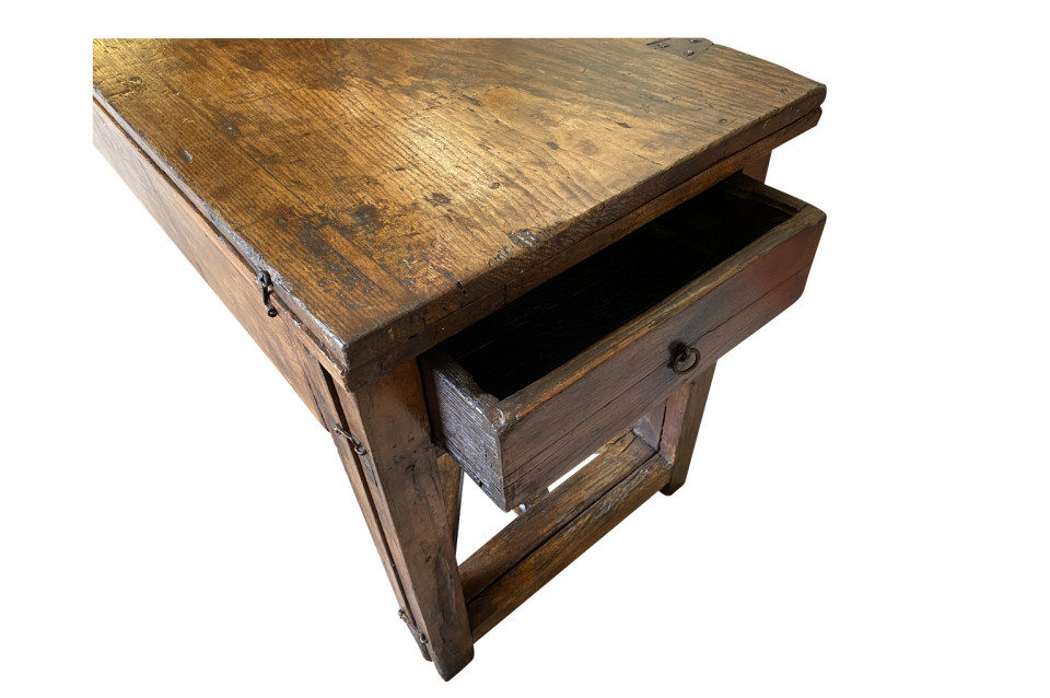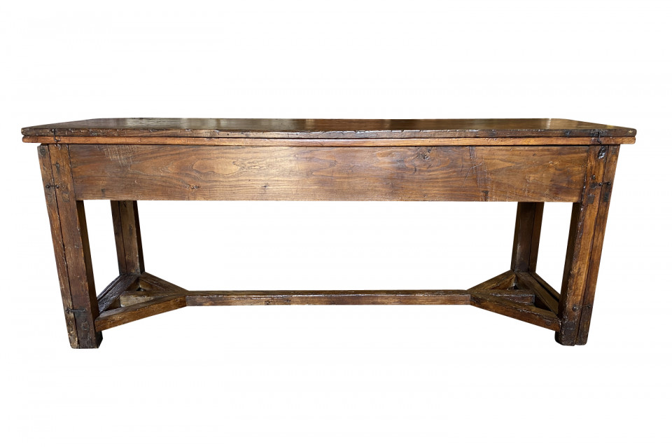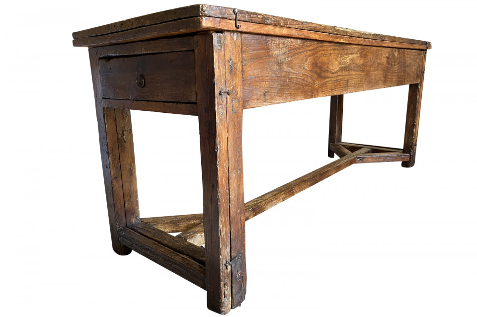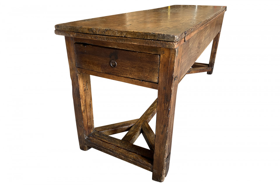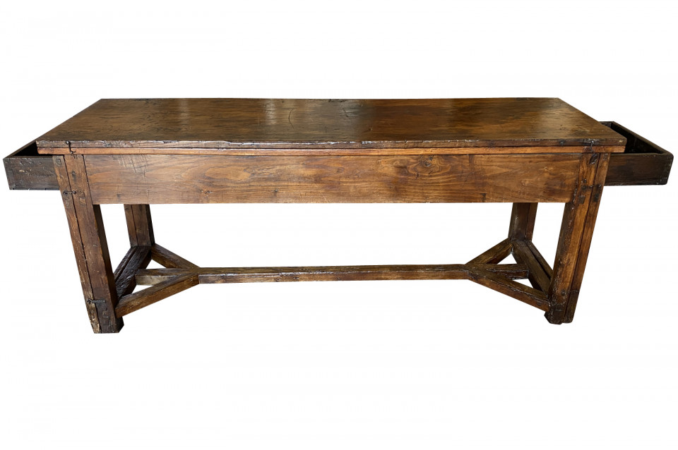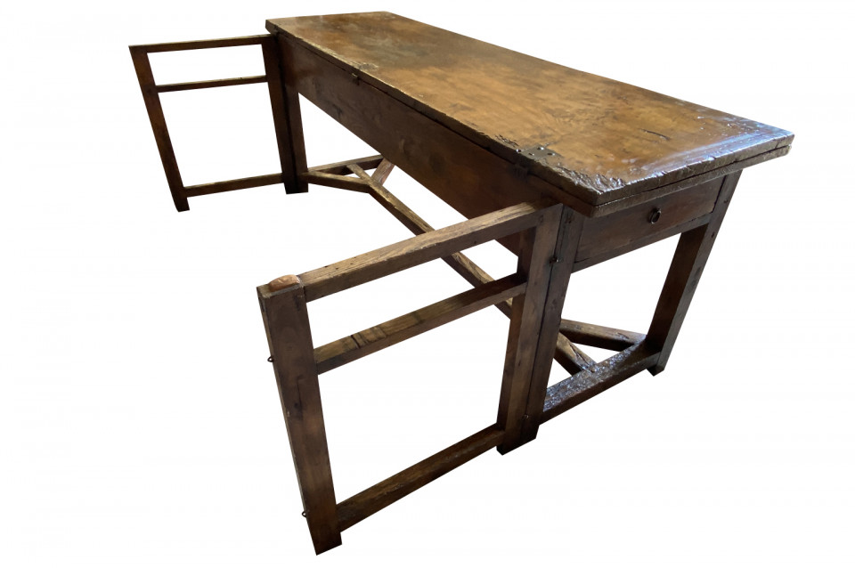 An exceptional and intriguing Reflectoire Table from the Ardeche region of France. Beautifully constructed from handsome chestnut. This very interesting table converts from a narrow console table with 2 drawers to a larger work table. Terrific as a serving piece - or opened when additional dining seating is needed. Super patina. The table measures when closed 32 3/4" H X 81 5/8" L X 24 7/8" D. When opened, the table measures 31 5/8" H X 81 5/8" L X 49 7/8" D.