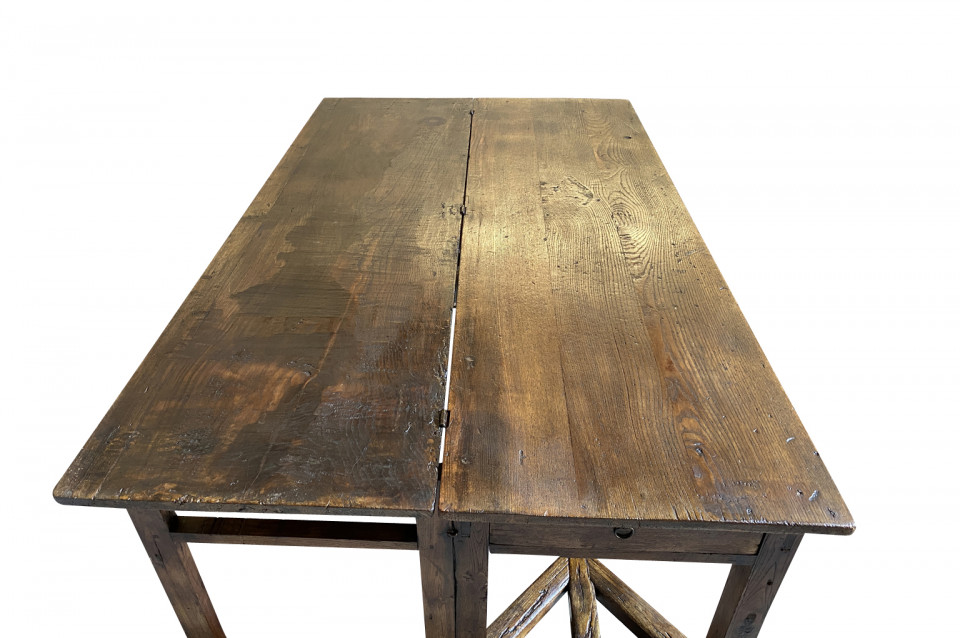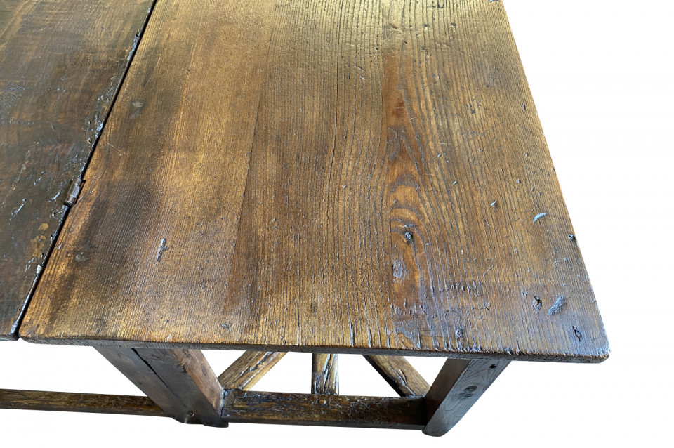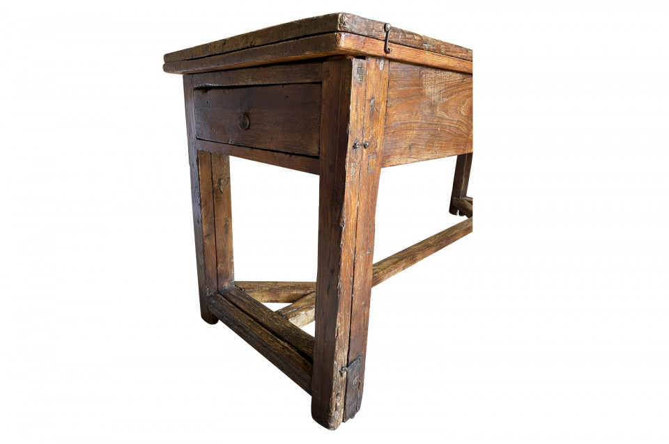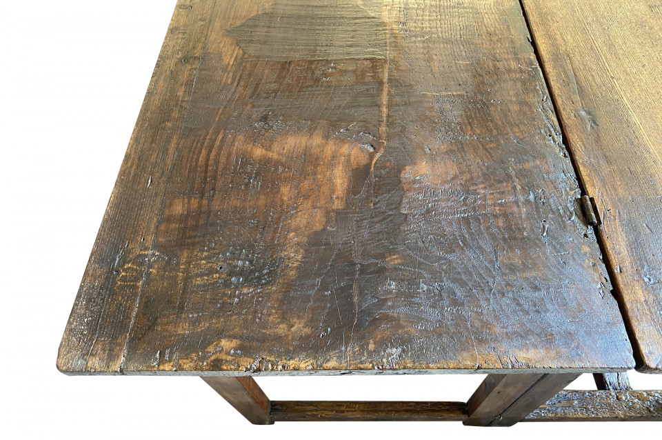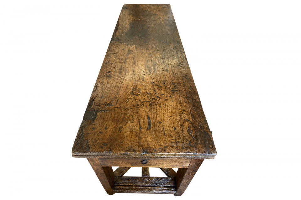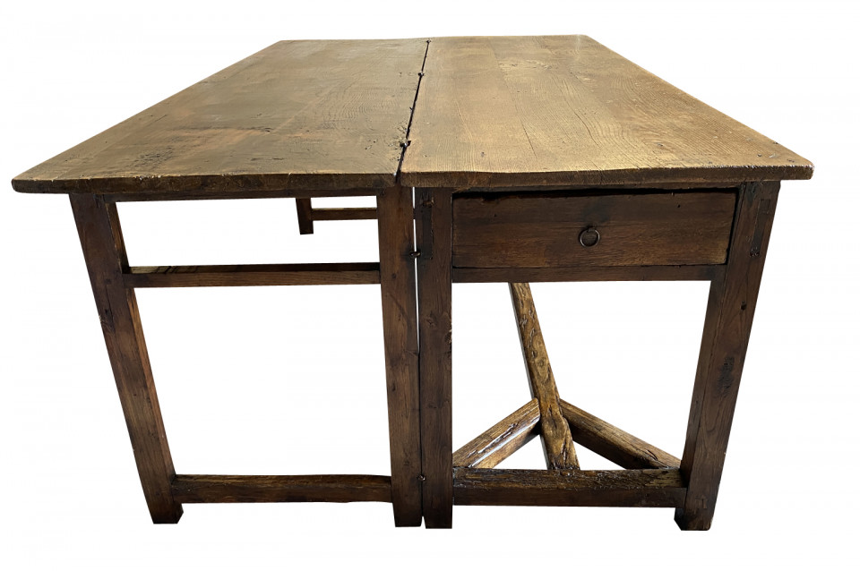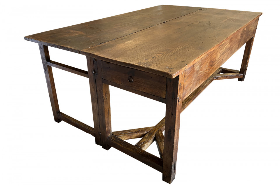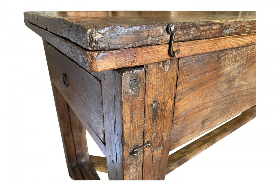 An exceptional and intriguing Reflectoire Table from the Ardeche region of France. Beautifully constructed from handsome chestnut. This very interesting table converts from a narrow console table with 2 drawers to a larger work table. Terrific as a serving piece - or opened when additional dining seating is needed. Super patina. The table measures when closed 32 3/4" H X 81 5/8" L X 24 7/8" D. When opened, the table measures 31 5/8" H X 81 5/8" L X 49 7/8" D.