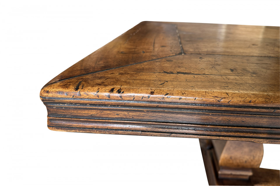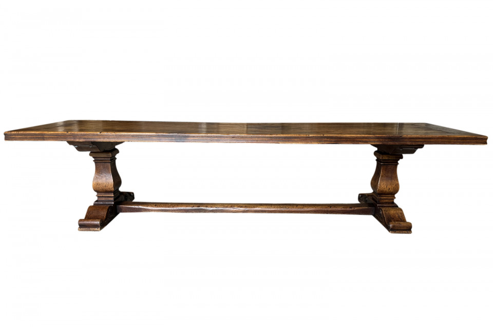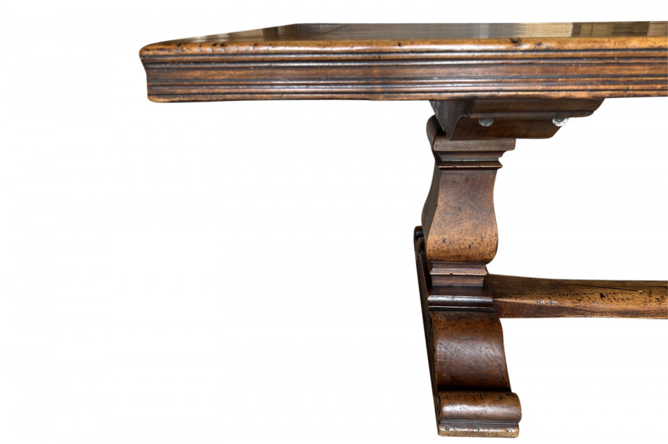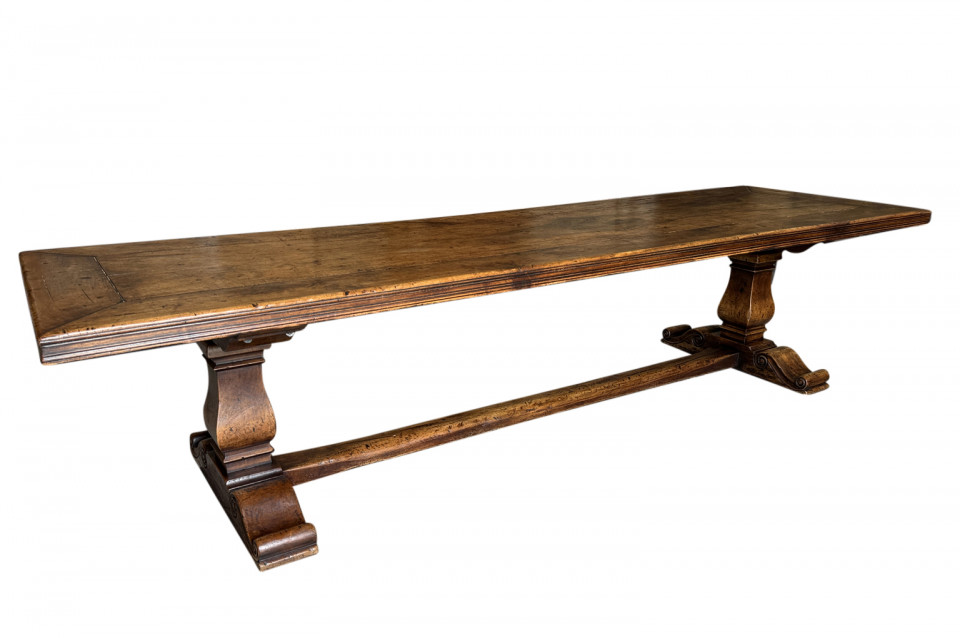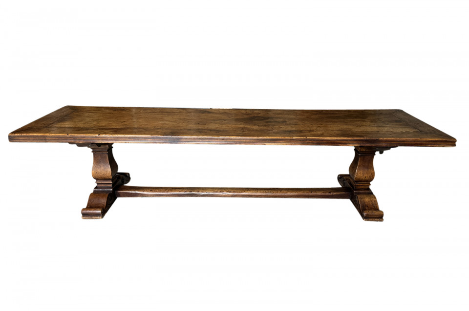 A very handsome and very sound mid-19th century Louis XIV style Monastery Table - Trestle Table from a chateau in the South of France. Wonderfully constructed in walnut with a terrific edge finish to the top surface, pedestal legs and nicely shaped feet. A grand scale table perfect for large family gatherings.