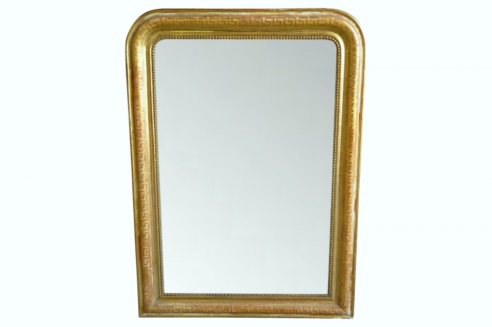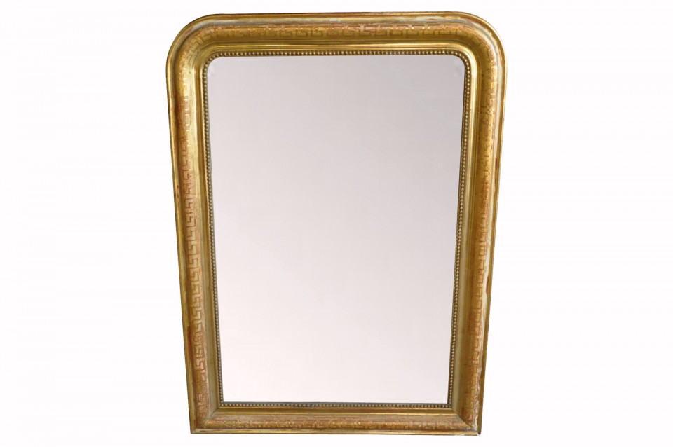 A French Louis Philippe period mirror in gilt wood. Decorated with the classical Greek Key motif and retains its original mercury glass.