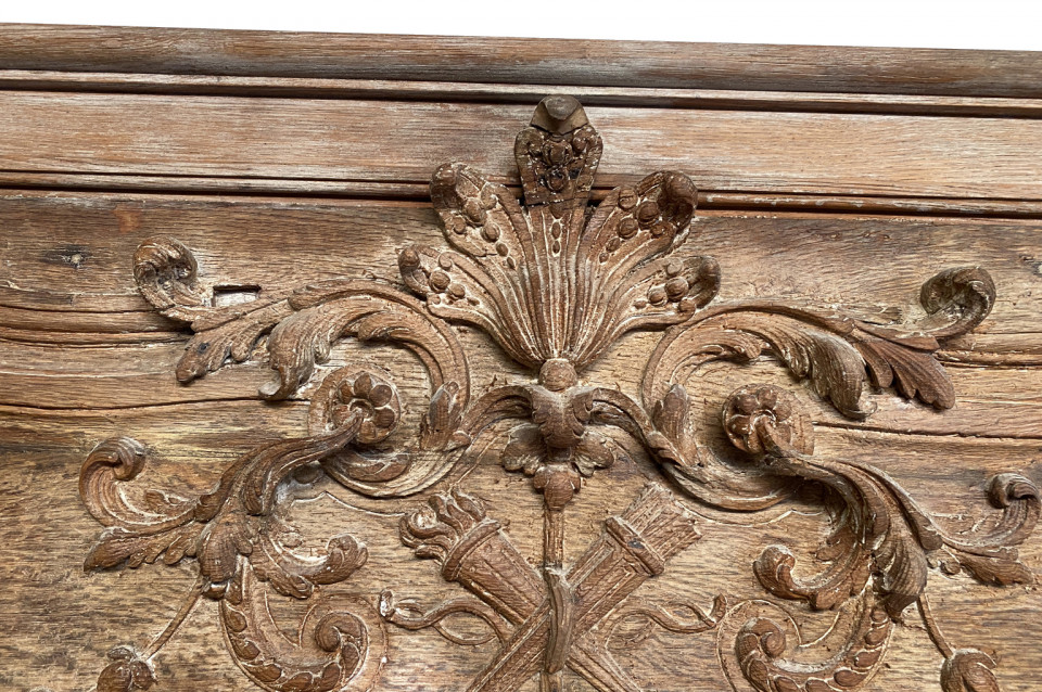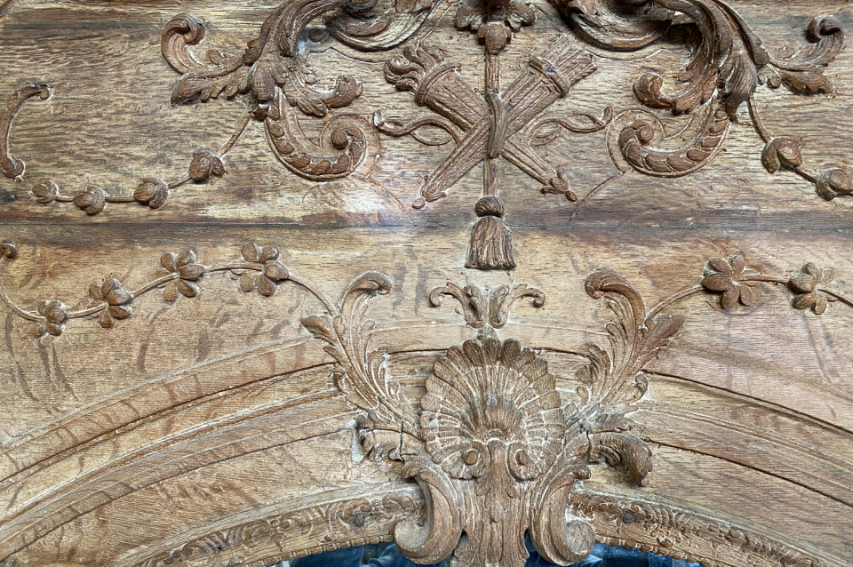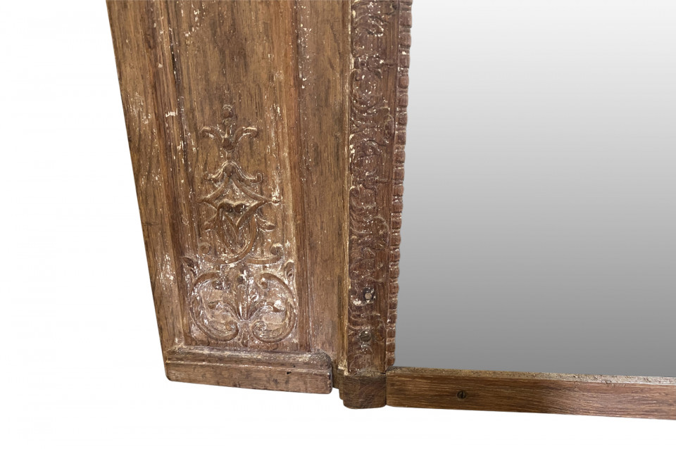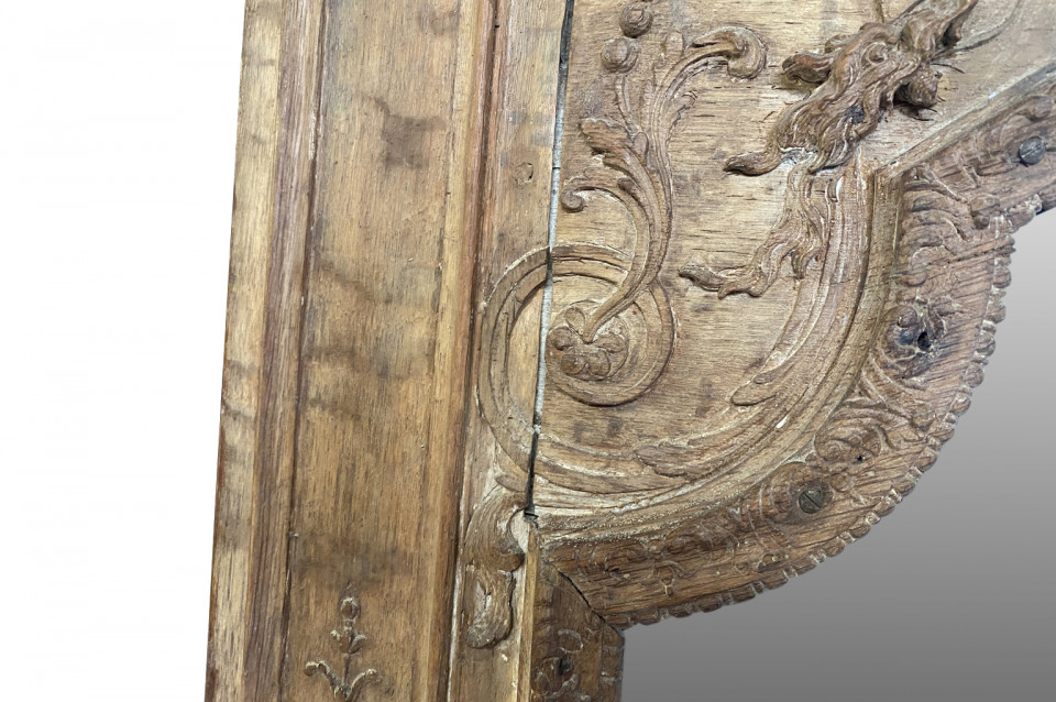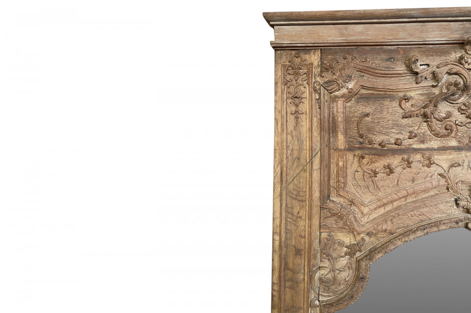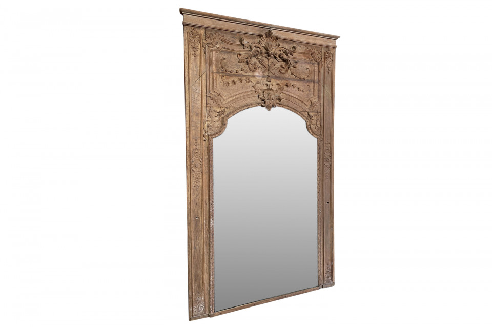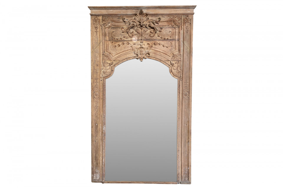 A very beautiful and grand scale French Regence period Trumeau in washed oak. Lovely carving detailing bas and haut relief. A stunning statement piece.