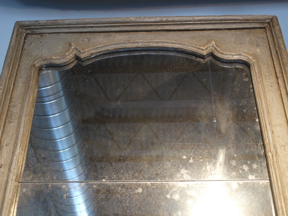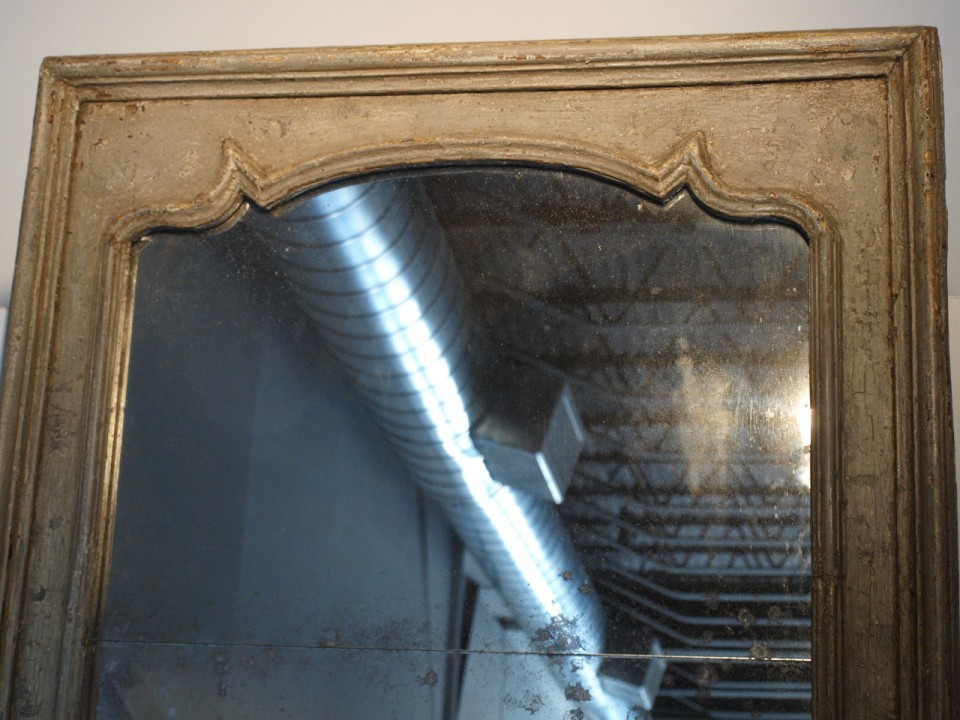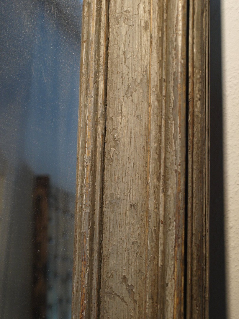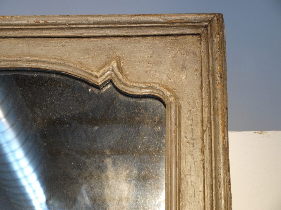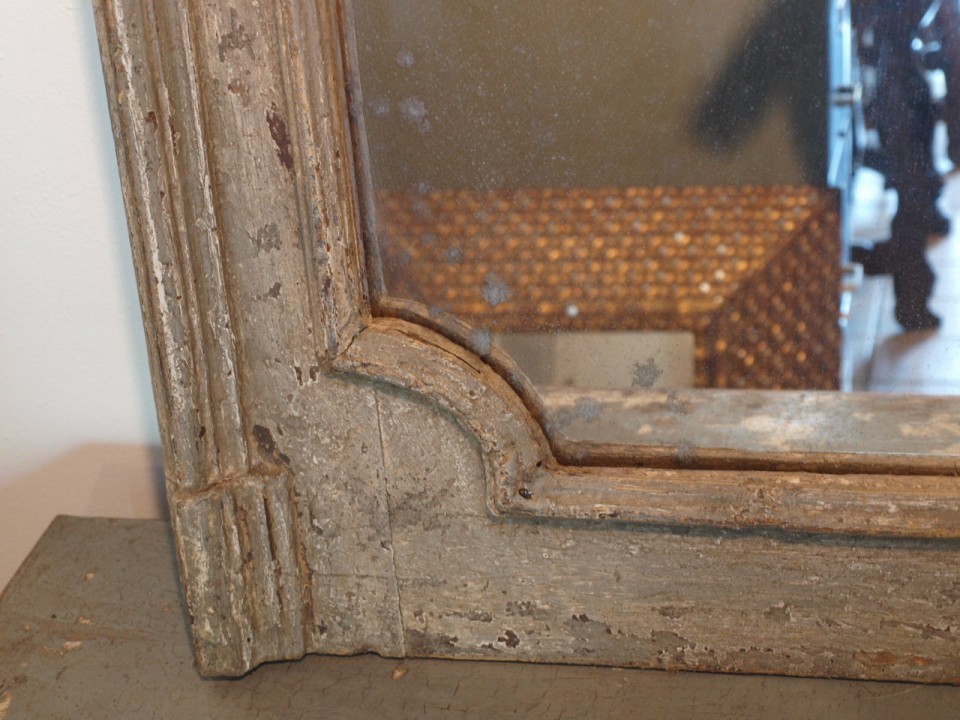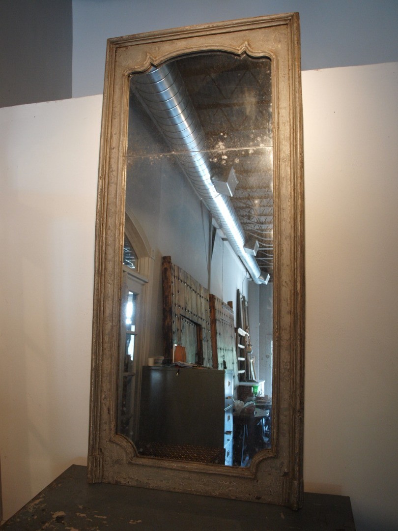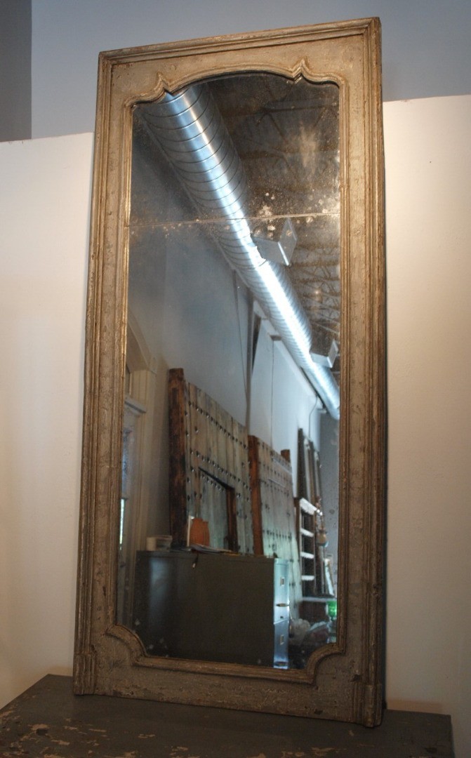 A terrific 18th century Italian door frame - now as a trumeau mirror. This mirror has a fabulous textured painted finish in classical grey. Wonderful as a mantel mirror, mounted to the wall or propped up against the wall as a floor standing mirror.. Circ