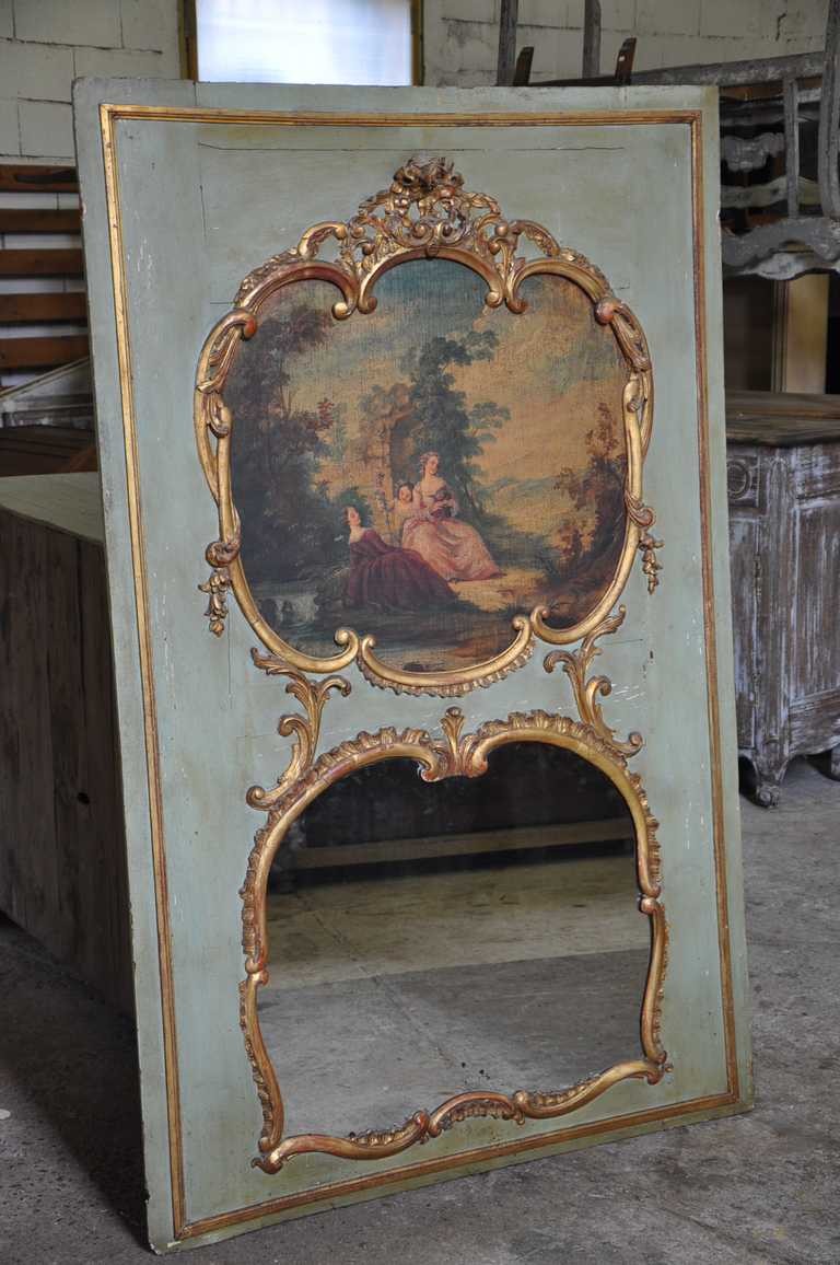 French late 18th century “Trumeau” mirror, Louis 16th style in painted and gilt wood, circa 1800.