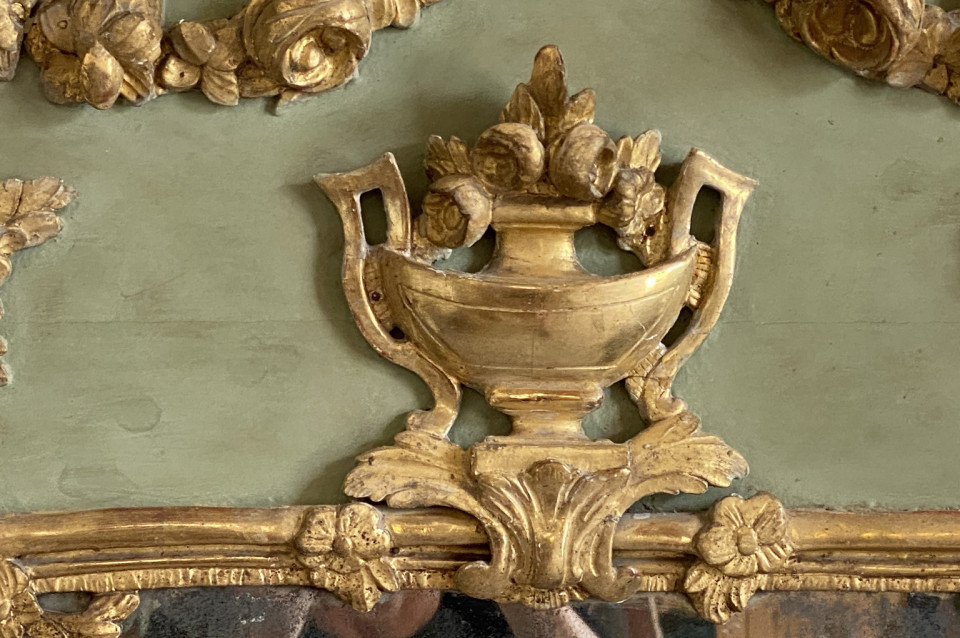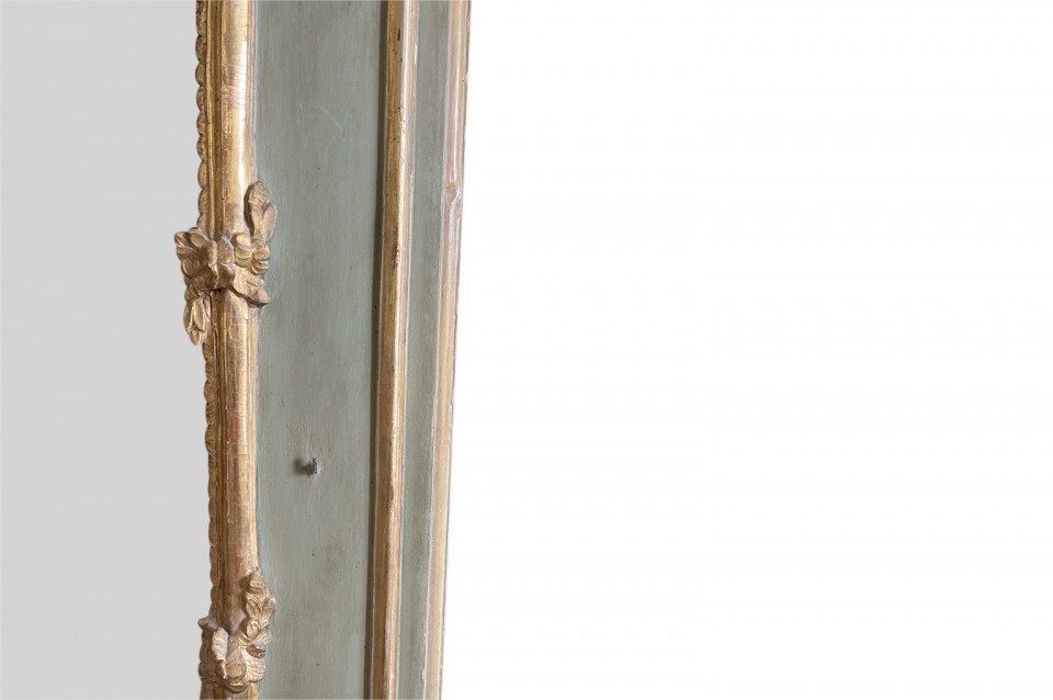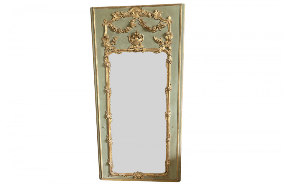 A very stunning and elegant 18th century French Regence period trumeau. Beautifully constructed from polychromed and gilt wood with its original mercury glass mirror. Please note that the glass is in two sections. Arriving September 2021.