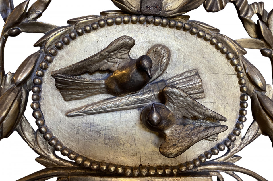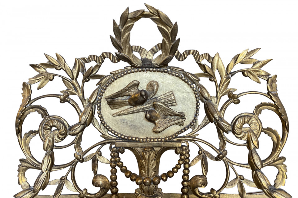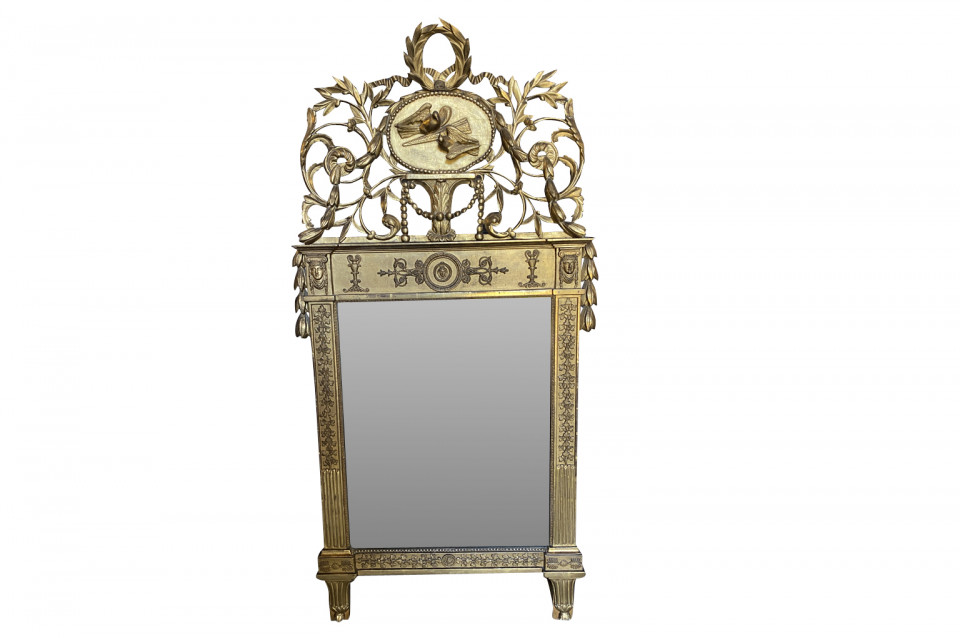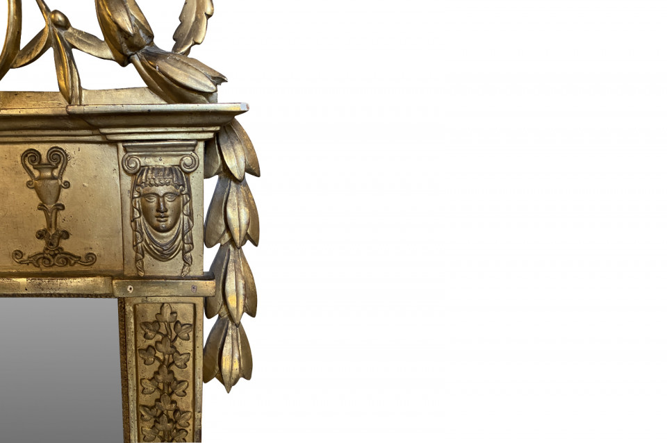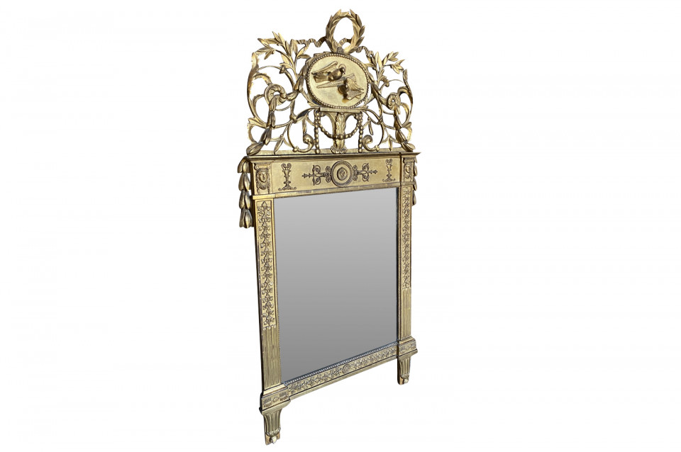 A stunning Transition Louis XVI to Empire Mirror from the Piedmont region of Italy. Magnificently crafted from giltwood. The pediment is adorned with wedding doves and a crown of laurel and garlands. The frame is adorned with carved oak leaves and sphinx figures. Stunning patina.