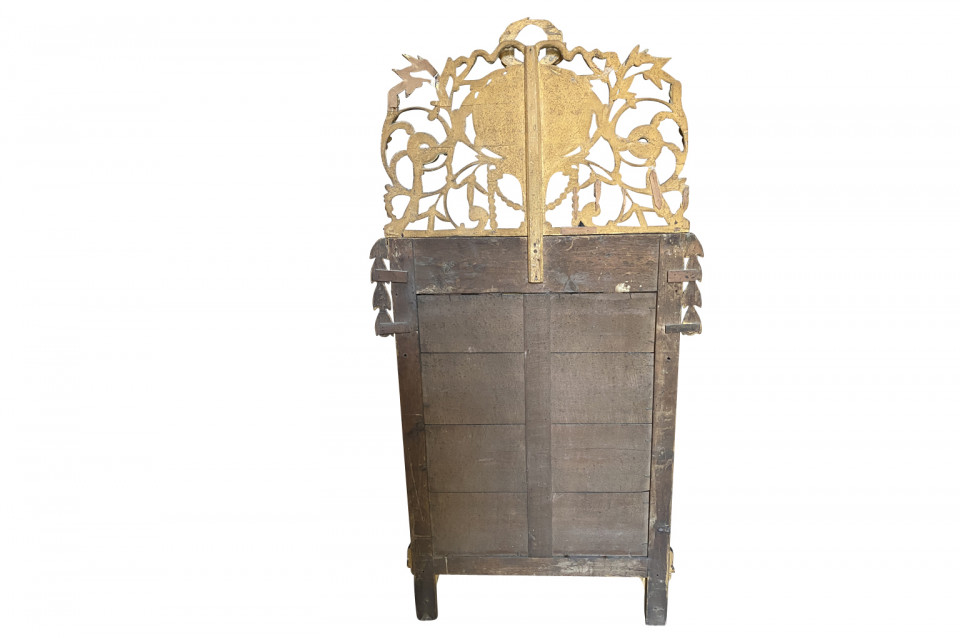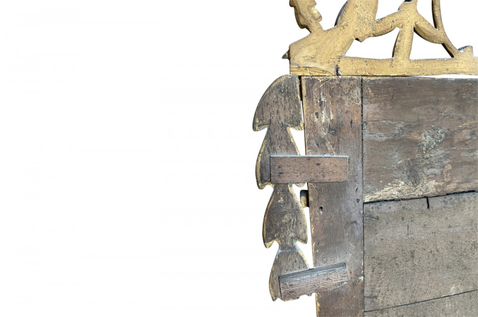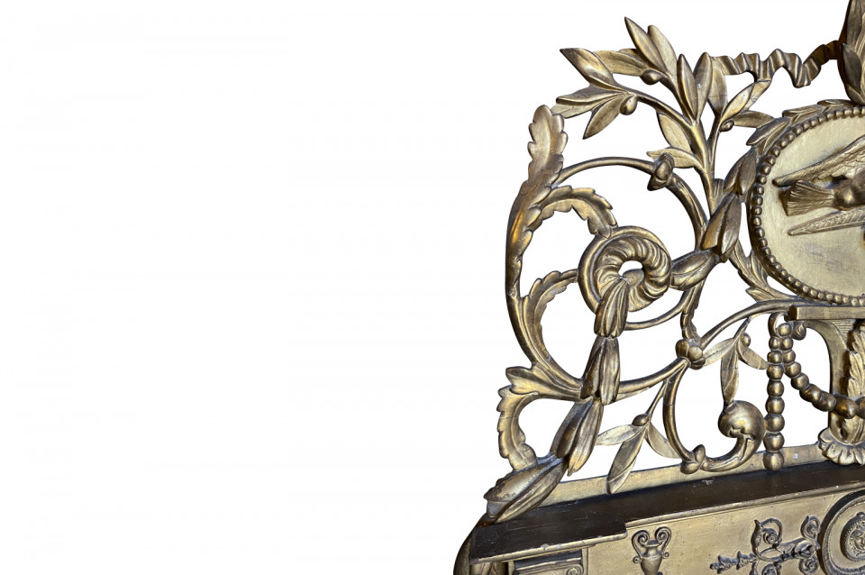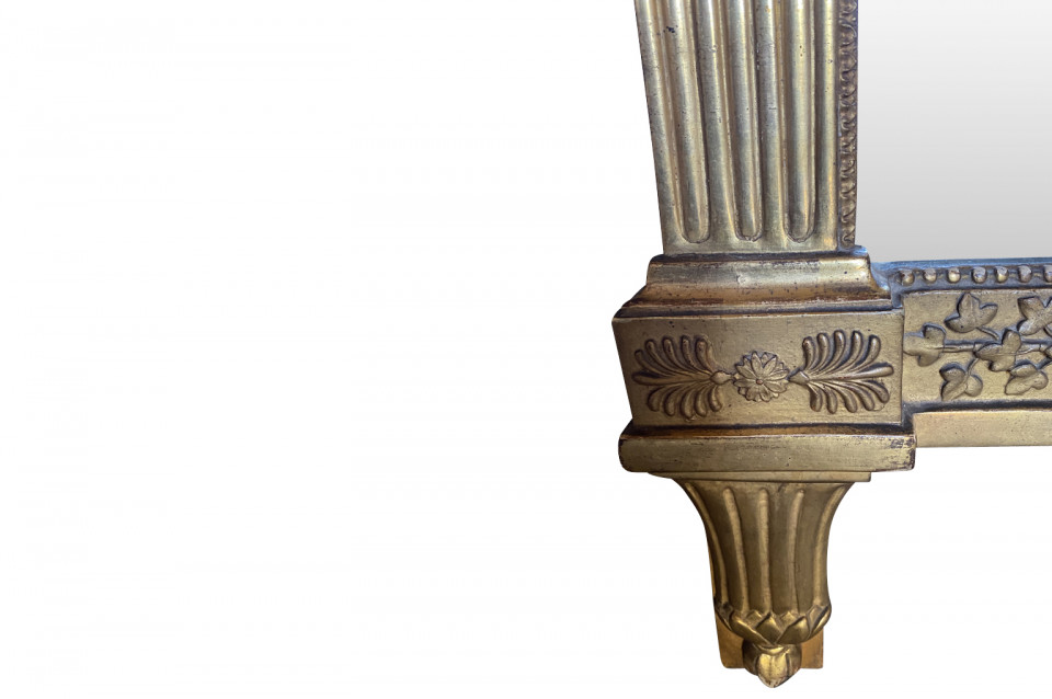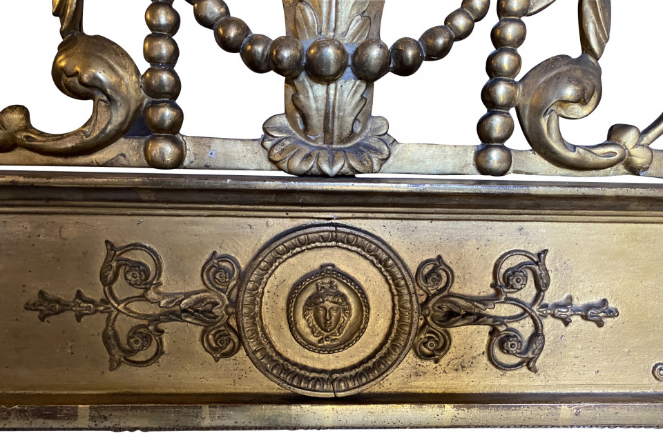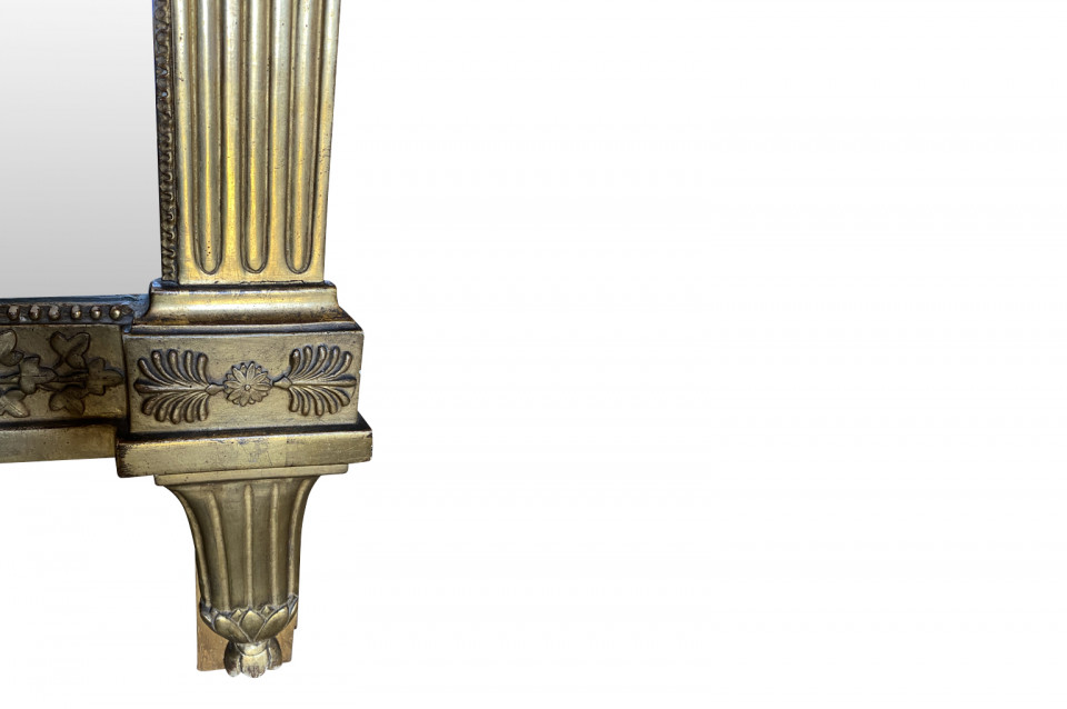 A stunning Transition Louis XVI to Empire Mirror from the Piedmont region of Italy. Magnificently crafted from giltwood. The pediment is adorned with wedding doves and a crown of laurel and garlands. The frame is adorned with carved oak leaves and sphinx figures. Stunning patina.