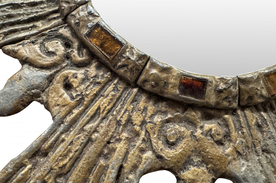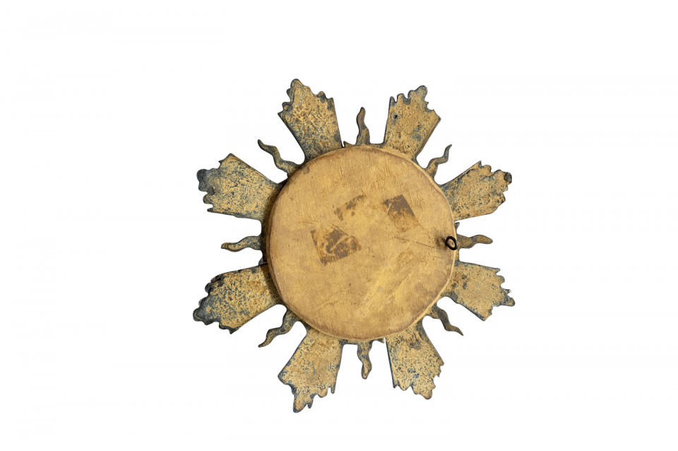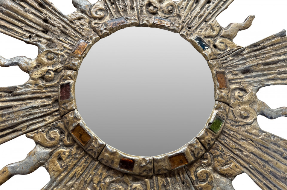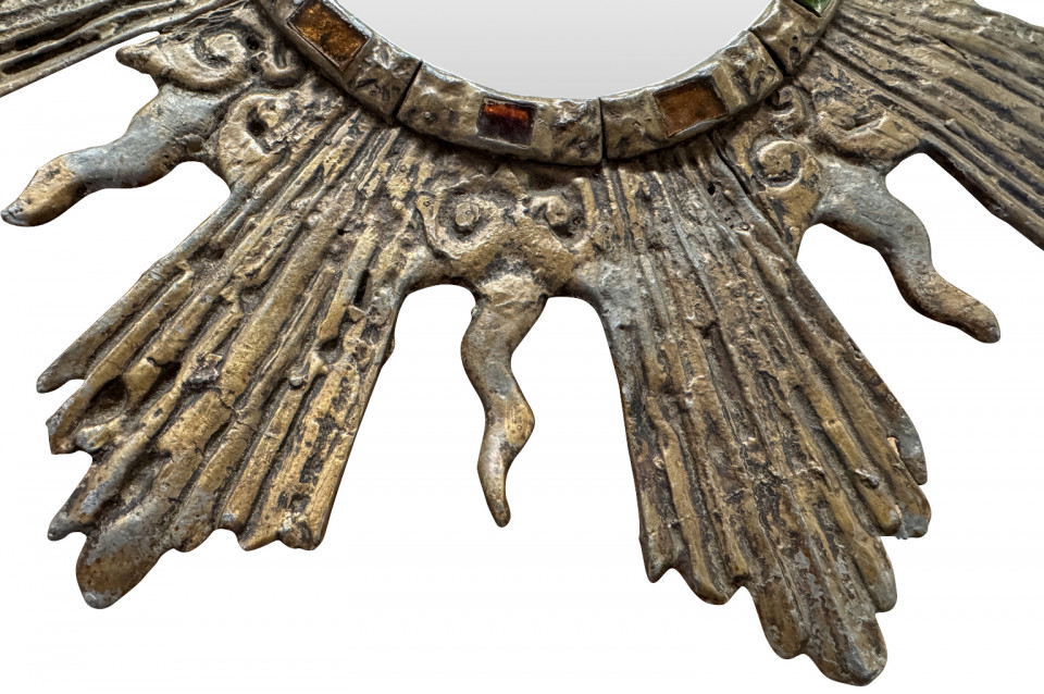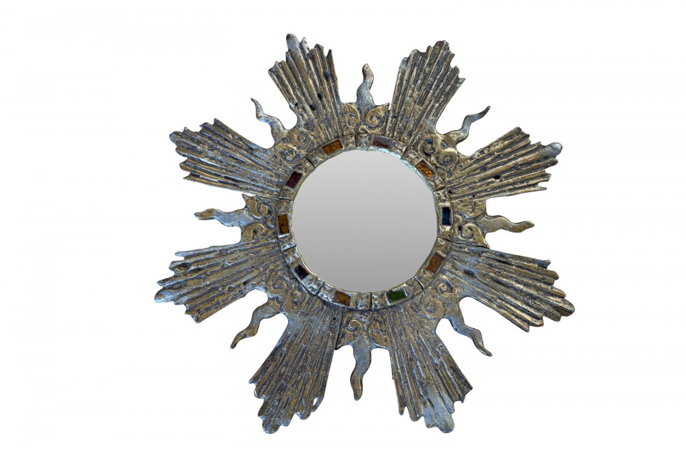 A very beautiful 19th century Sunburst Mirror from the Provence region of France. Wonderfully crafted from gilt lead with decorative colored glass inserts. Wonderful patina.