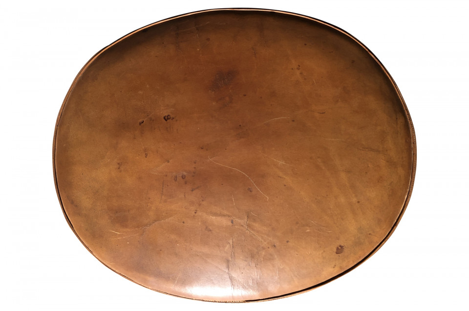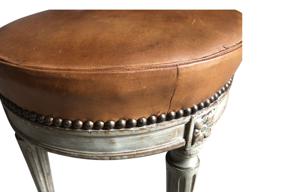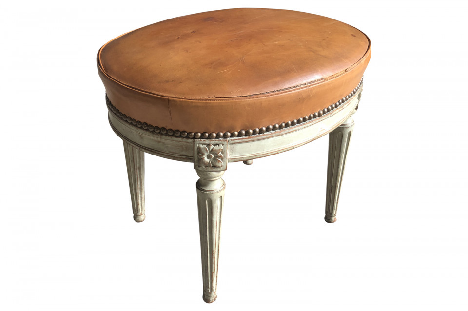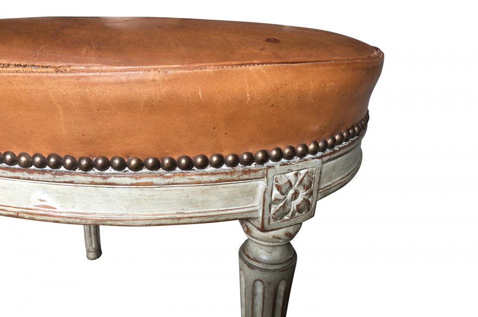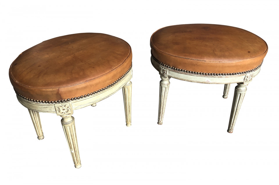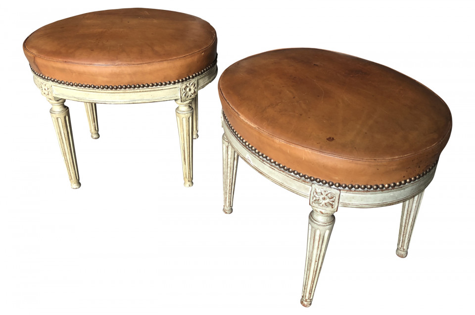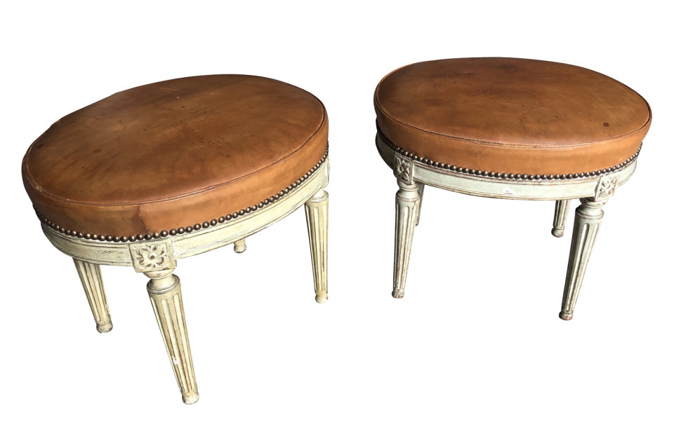 A sensational pair of French Louis XVI style stools in painted wood with beautiful fluted legs and fabulous leather tops.