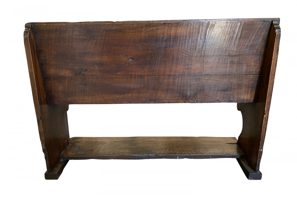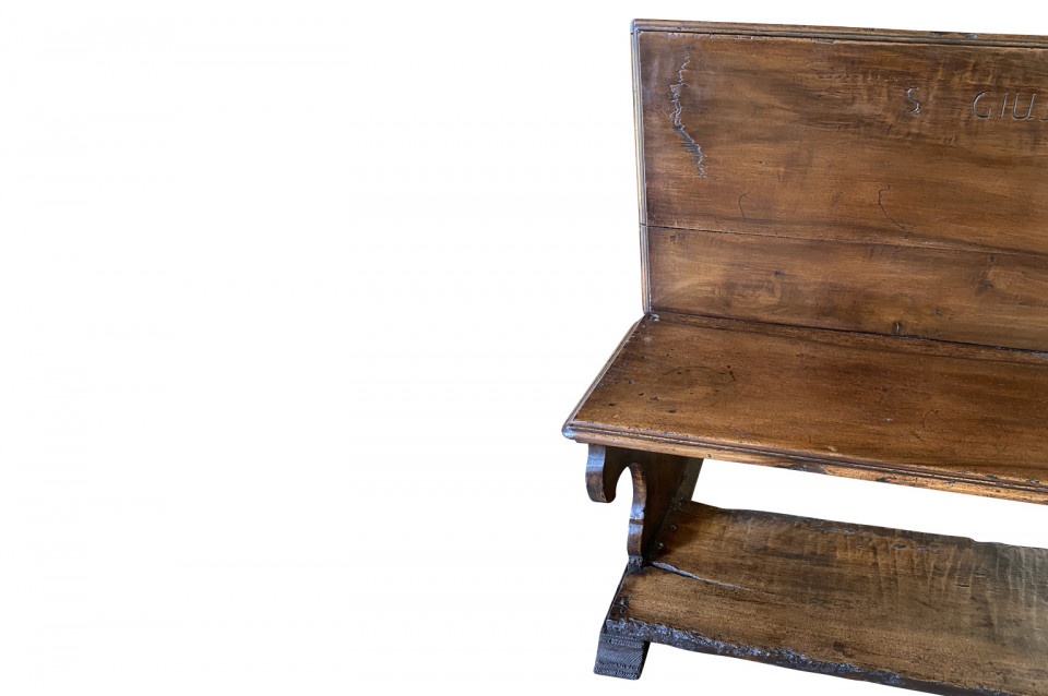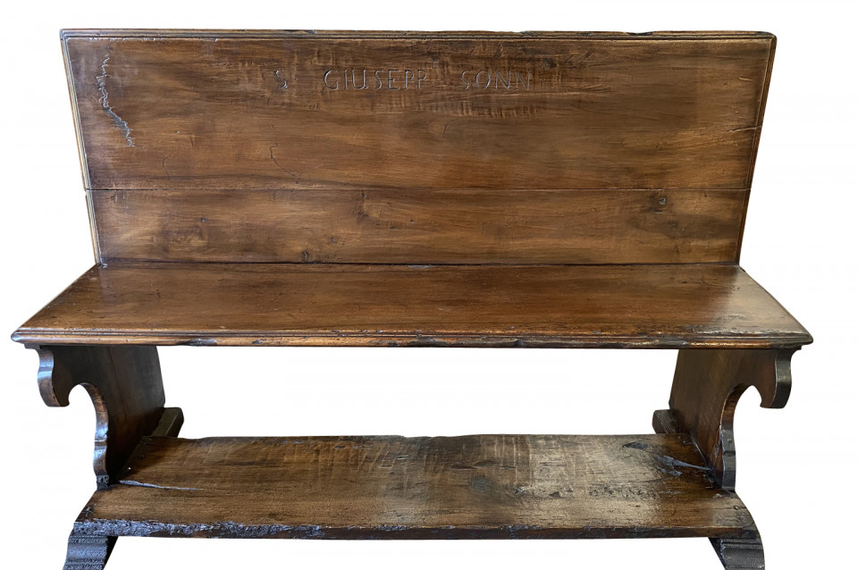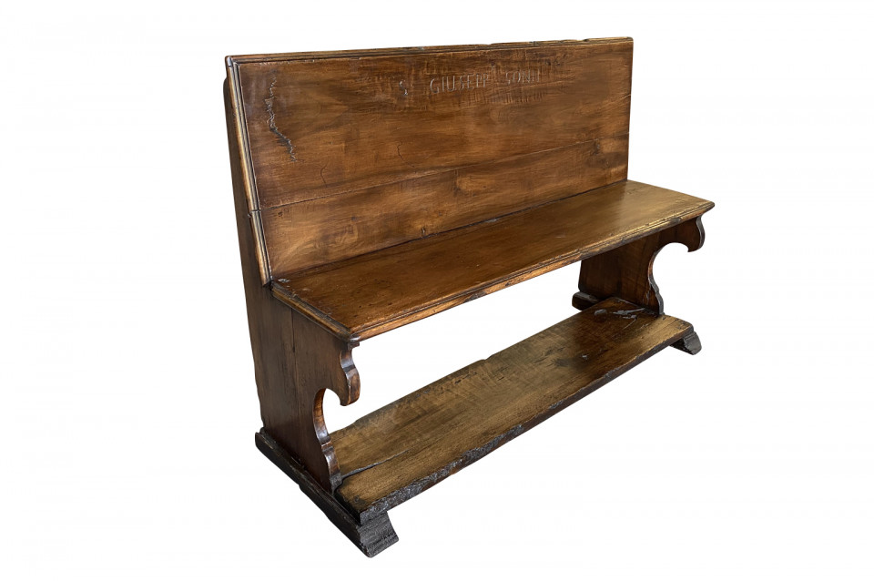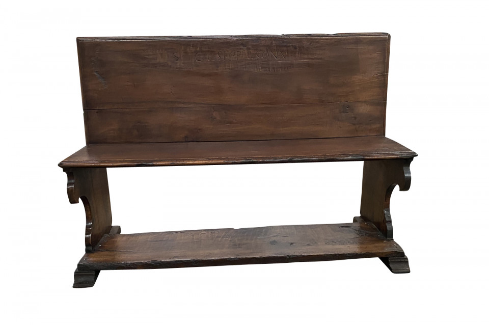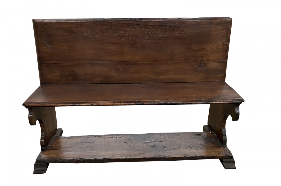 A very beautiful 17th century bench from the Lombardi region of Italy. Wonderfully constructed from stunning walnut with nicely shaped legs and a foot rest. "S GIUSEPP SONN" is carved on the front of the seat back. Terrific patina. Arriving May 2021.