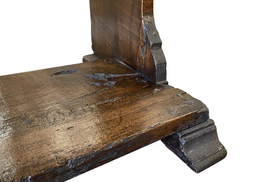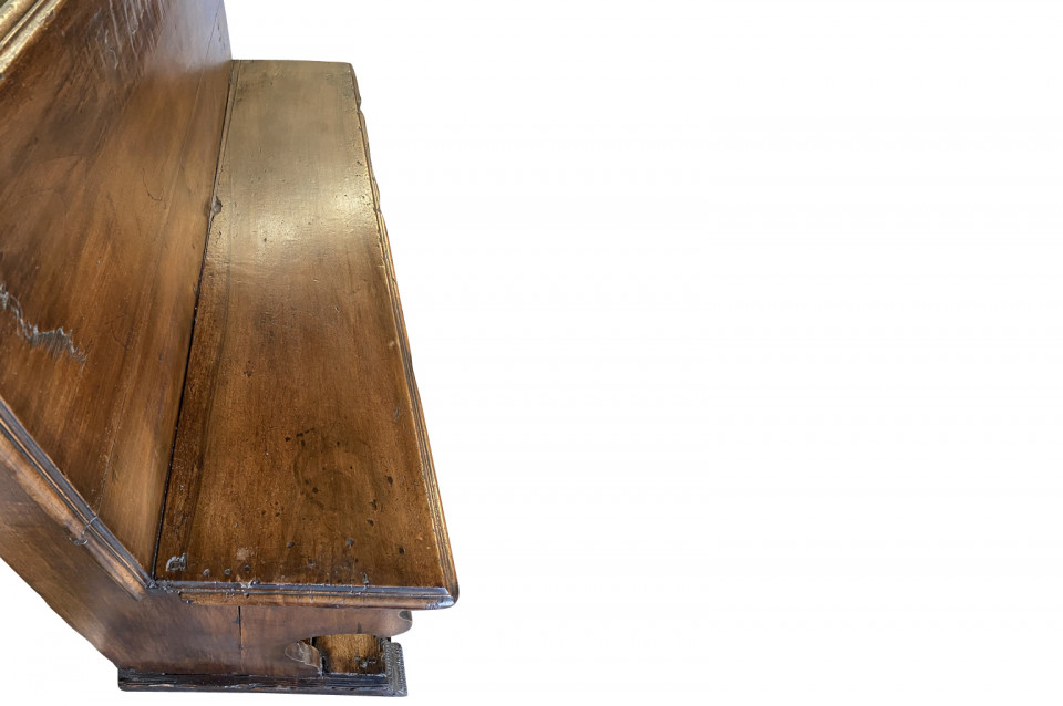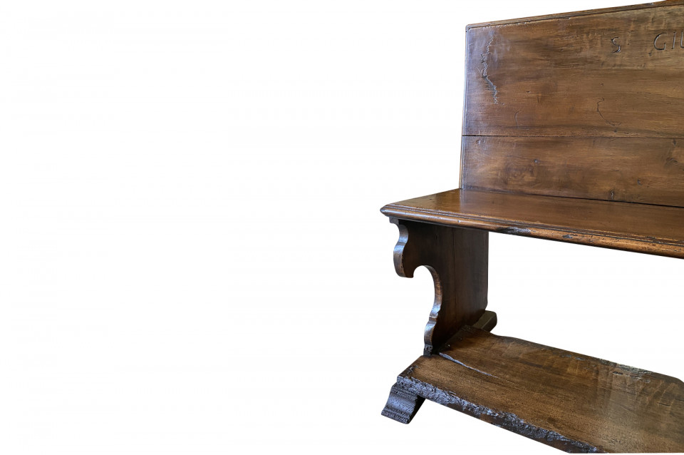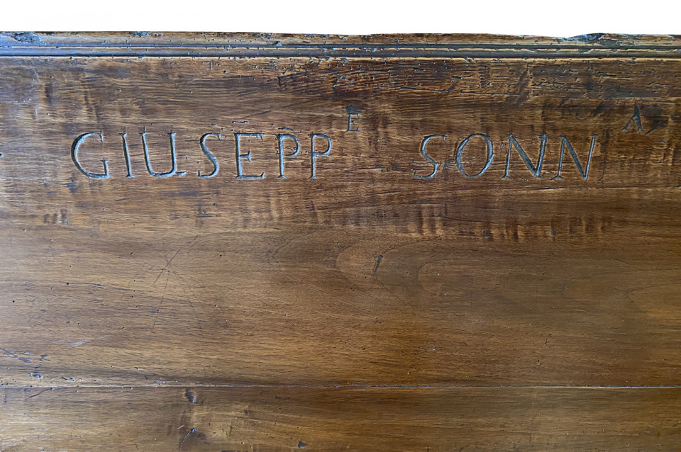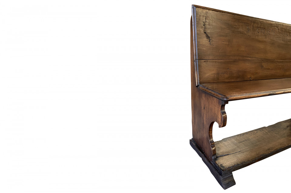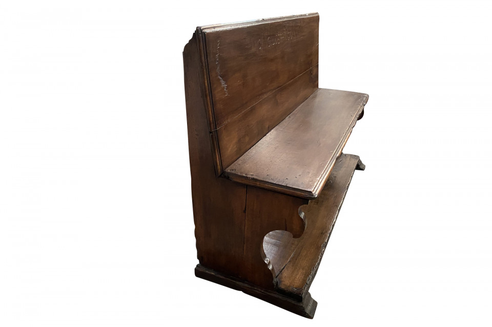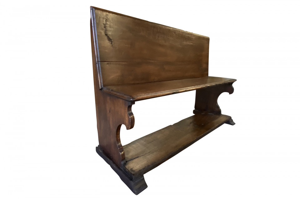 A very beautiful 17th century bench from the Lombardi region of Italy. Wonderfully constructed from stunning walnut with nicely shaped legs and a foot rest. "S GIUSEPP SONN" is carved on the front of the seat back. Terrific patina. Arriving May 2021.