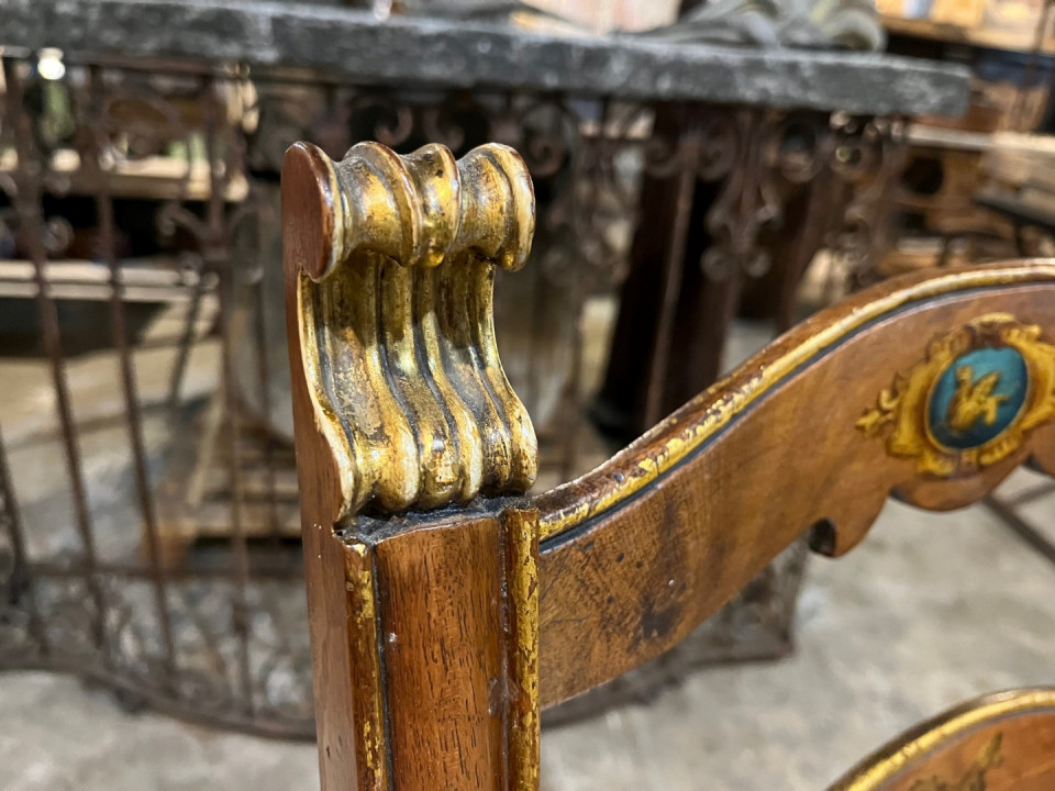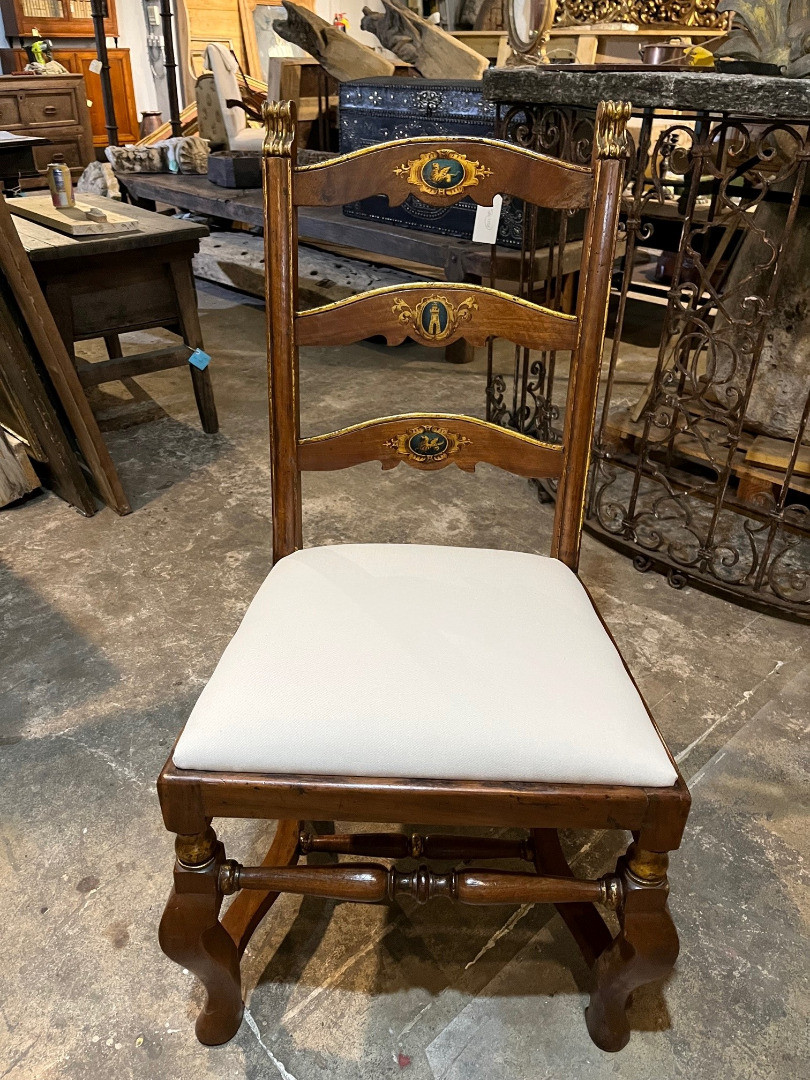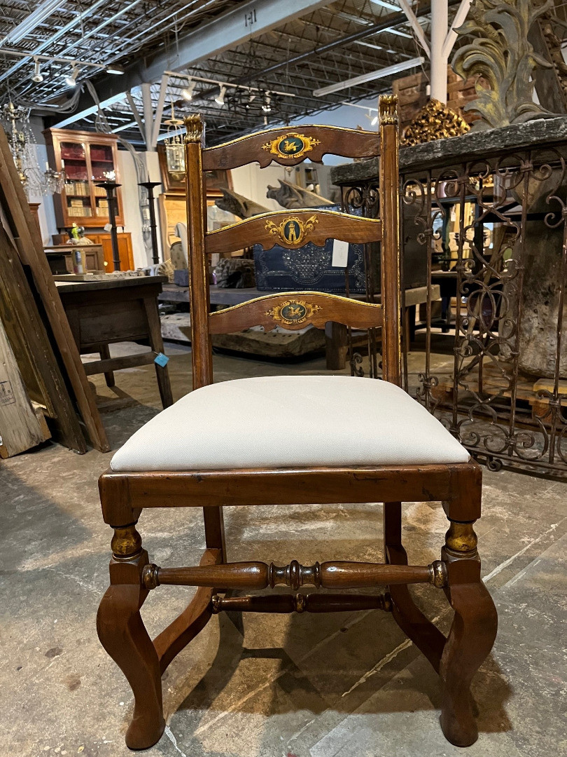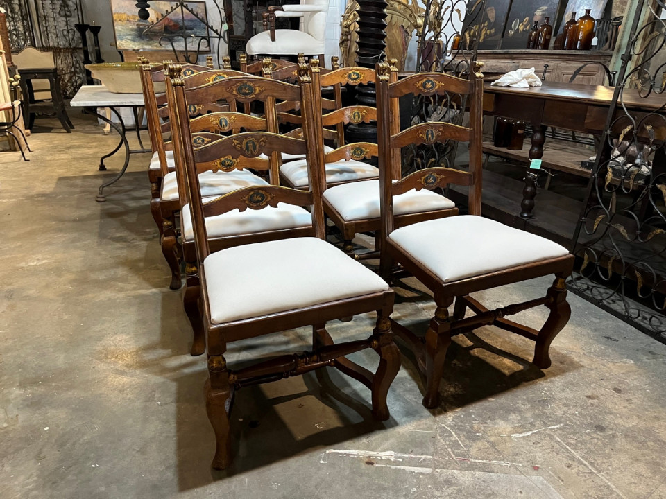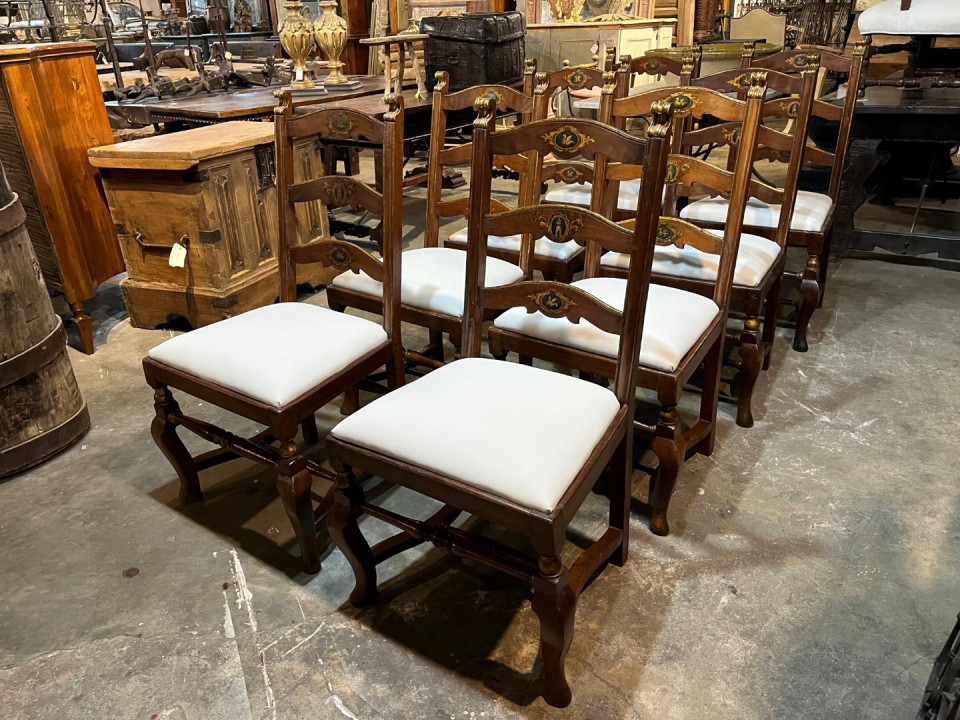 A very handsome set of 8 early 18th century Dining Chairs from the Lombardy region of Italy. Wonderfully constructed from walnut with gilt and painted detail. The seat cushions have recently been reupholstered and remove easily. The seat height is 20 1/8".