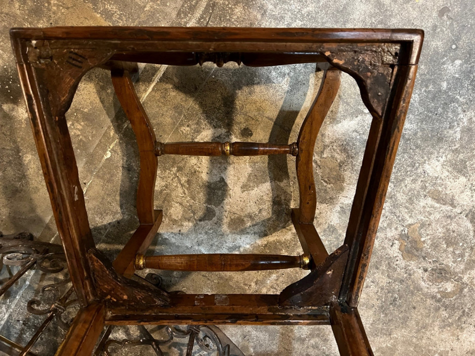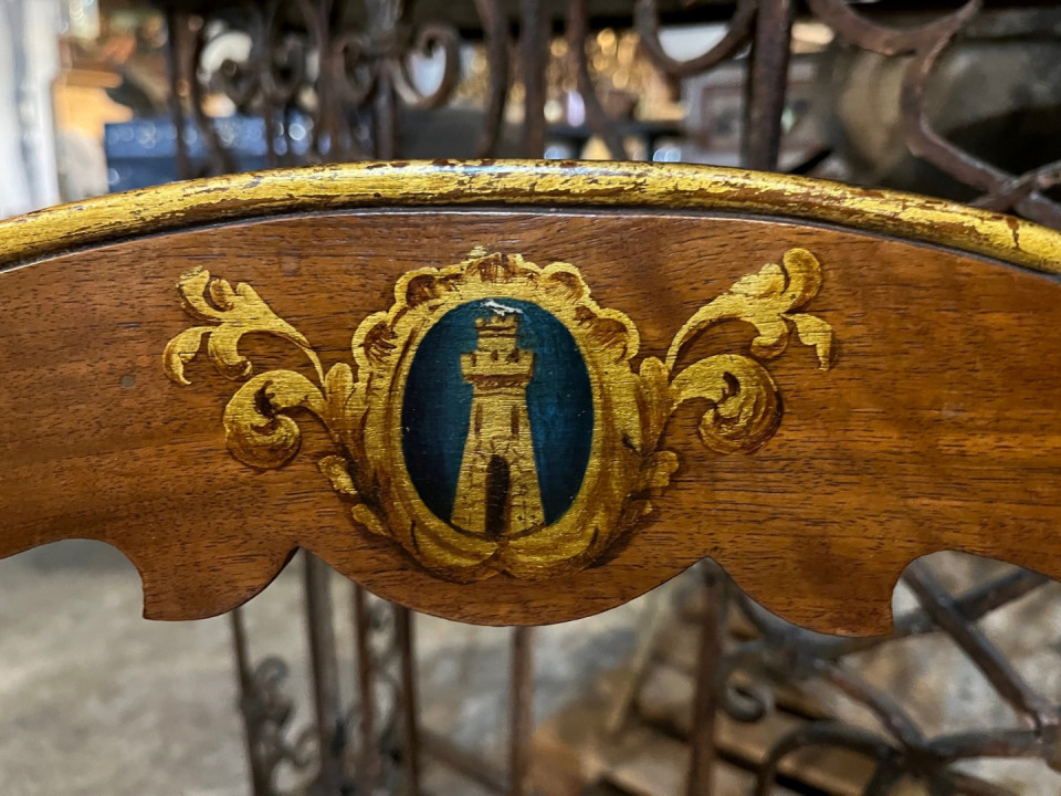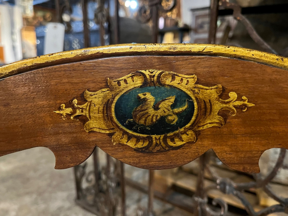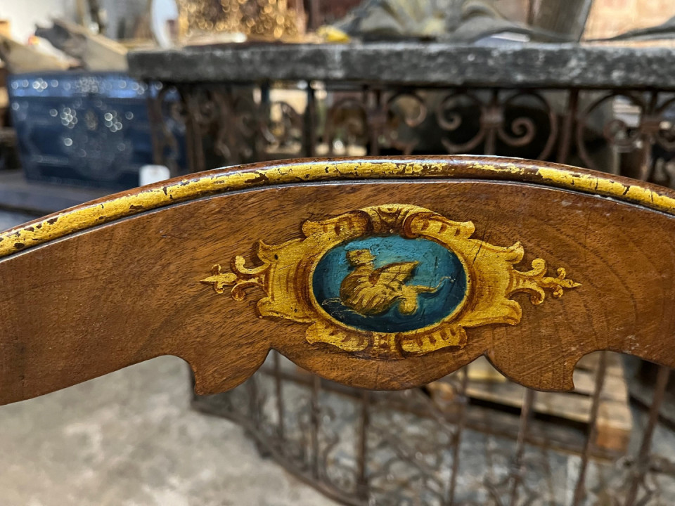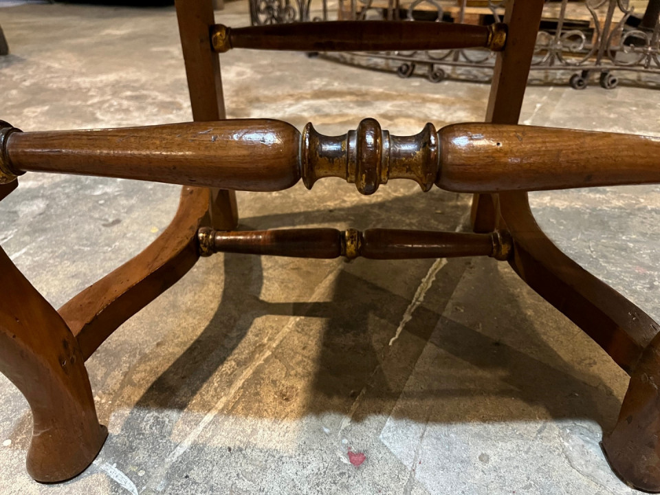 A very handsome set of 8 early 18th century Dining Chairs from the Lombardy region of Italy. Wonderfully constructed from walnut with gilt and painted detail. The seat cushions have recently been reupholstered and remove easily. The seat height is 20 1/8".