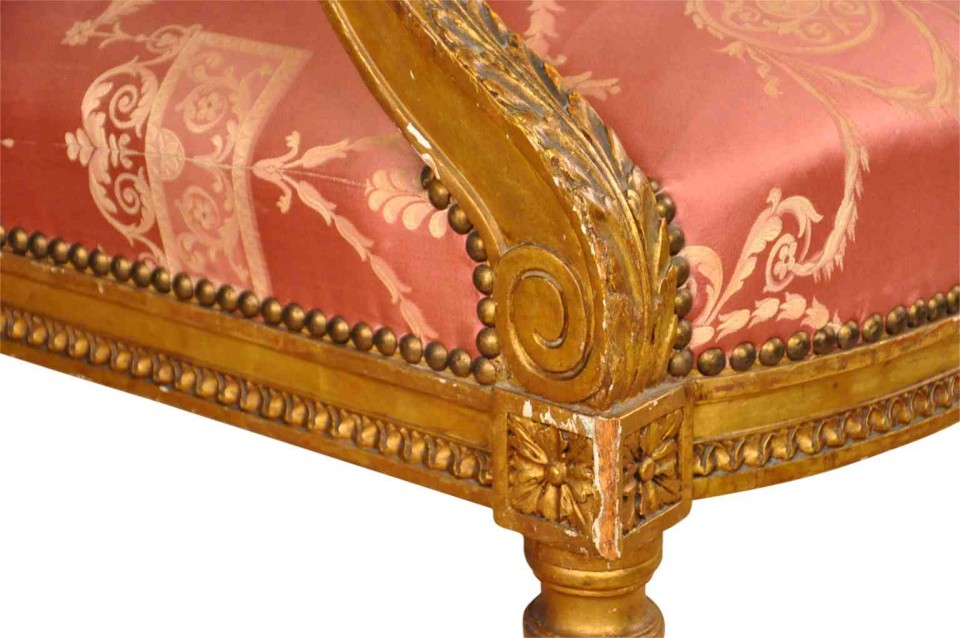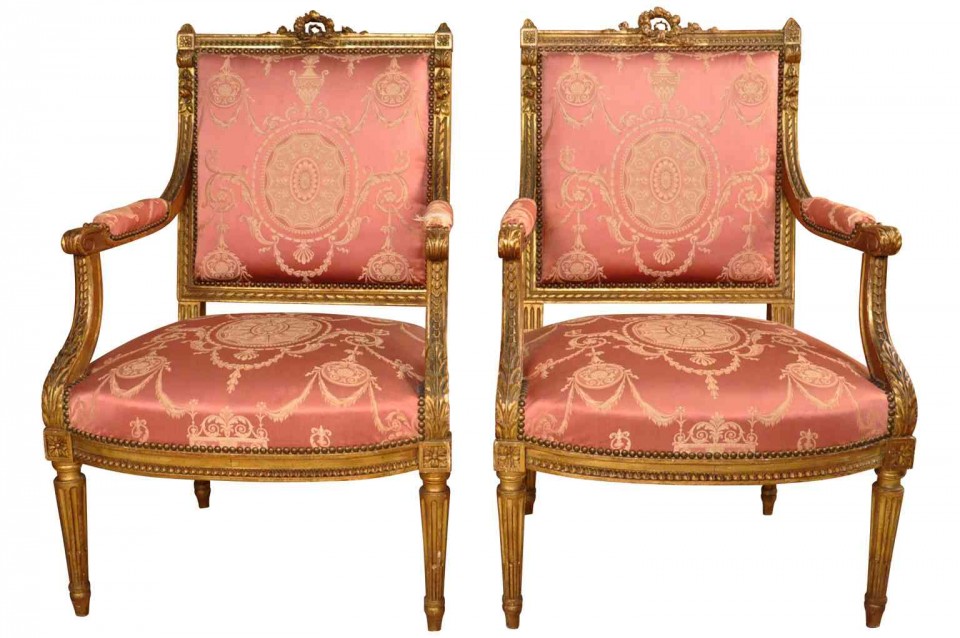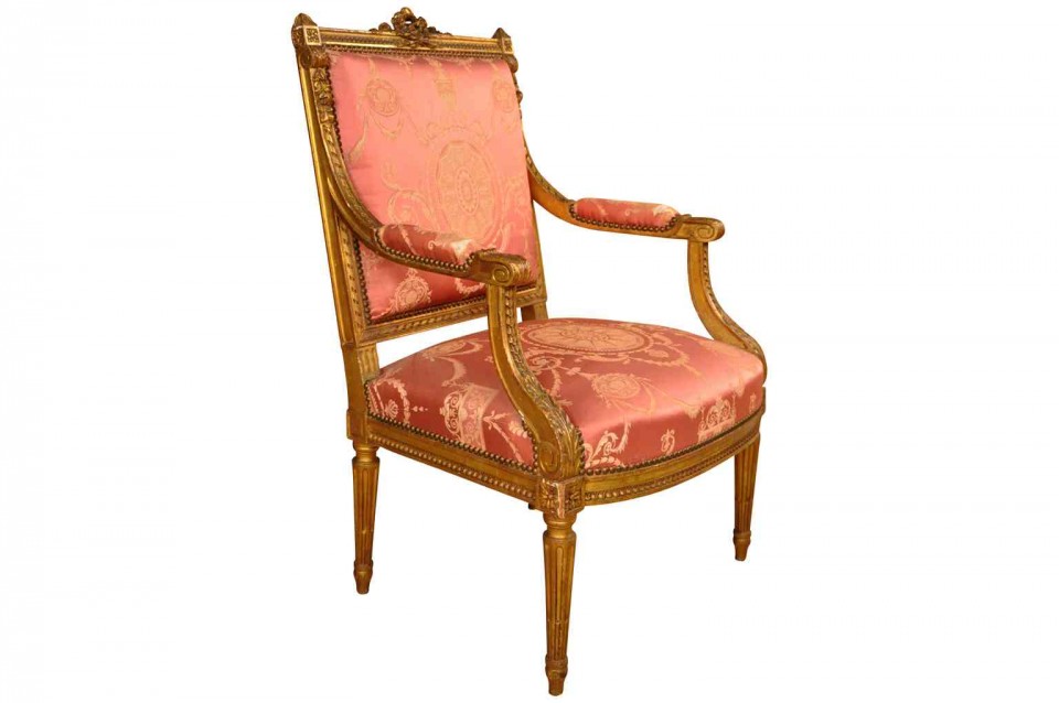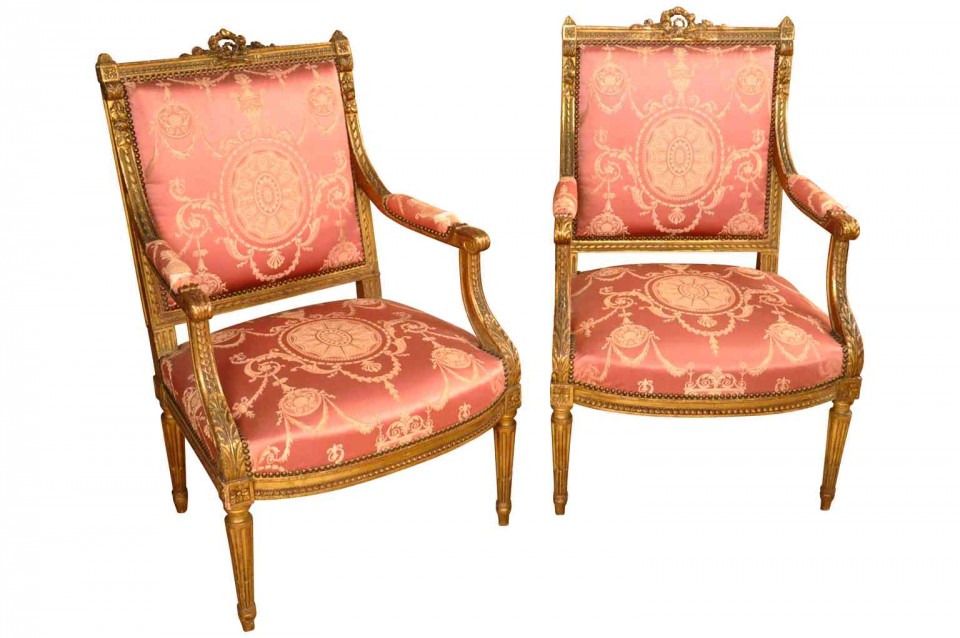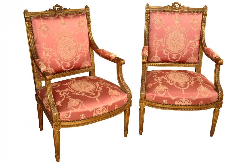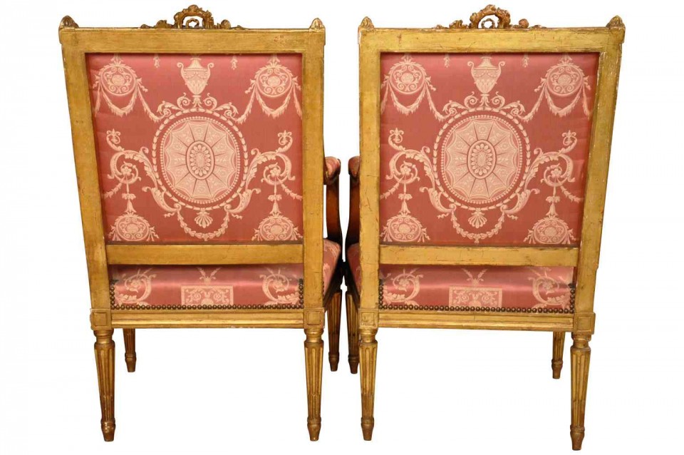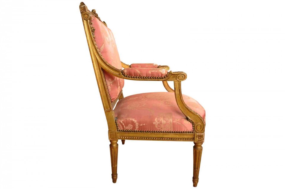 A wonderful pair of 19th century Napoleon III period fauteuils in giltwood. Beautifully constructed with padded arms and fluted legs. High quality gilt. Seat height is 17 3/4".