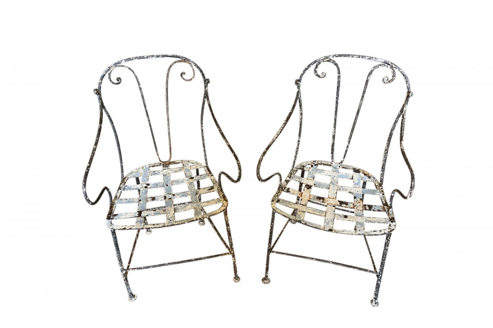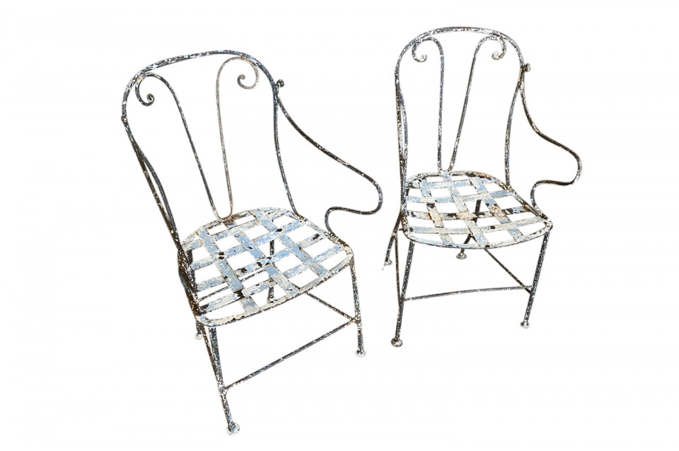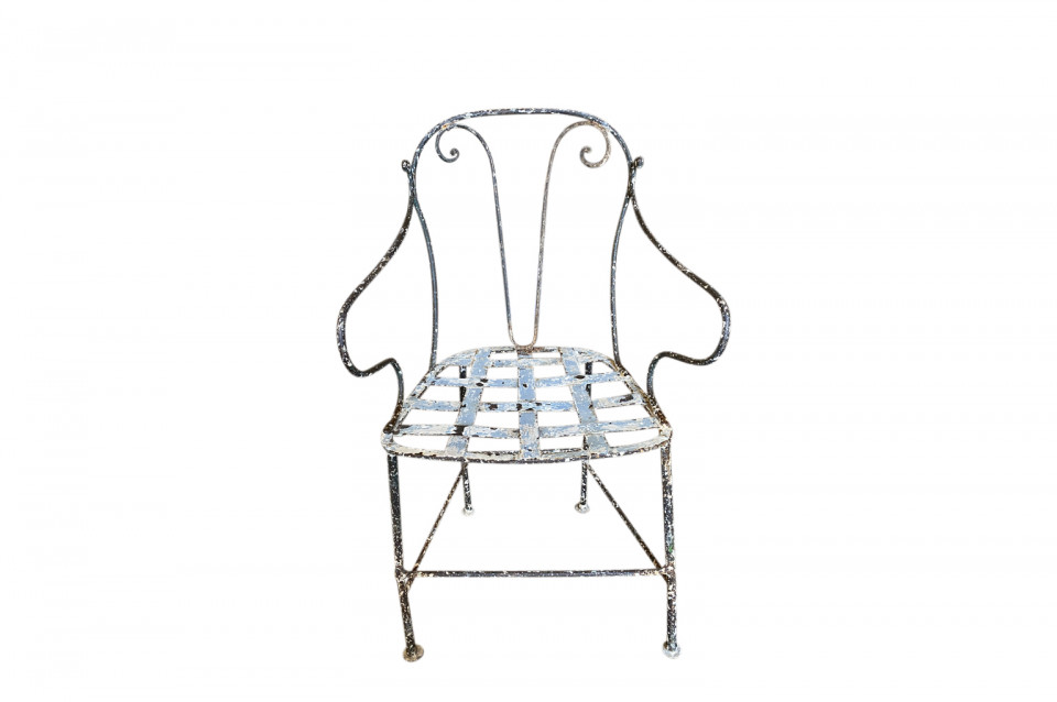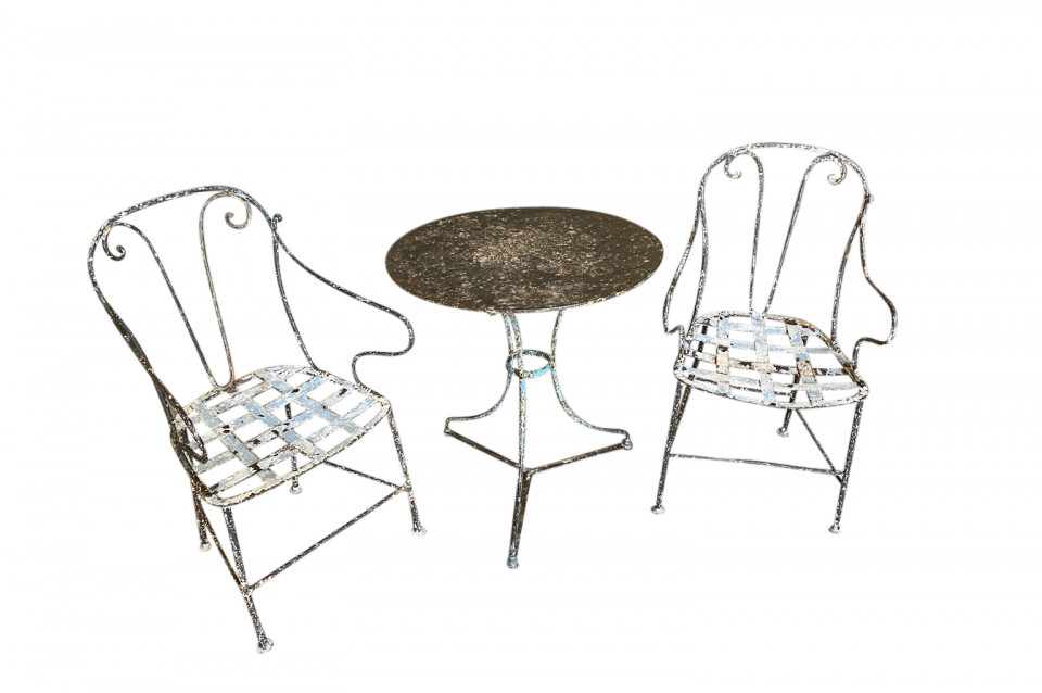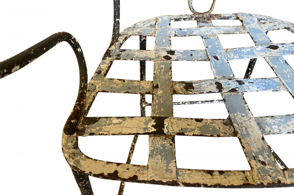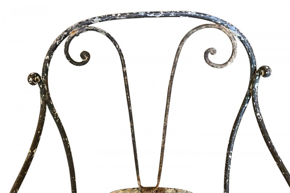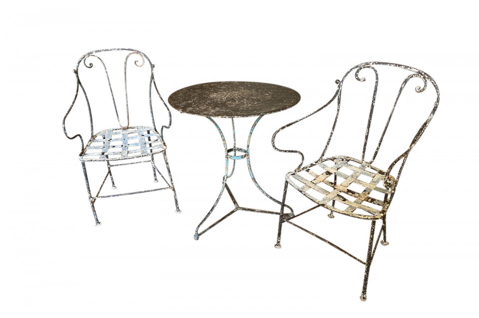 A very charming set of 19th century Garden Table & Armchairs from the Provence region of France. Wonderfully made from painted iron. Super patina. Perfect for a casual interior or garden. The table measures 27 1/2" H X 25 1/4" diameter. The armchairs measure 34 1/8" H ( Seat 16 1/4") X 19 1/2" W X 17 1/4" D