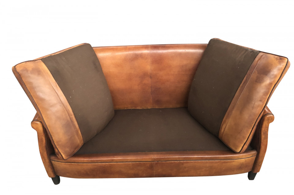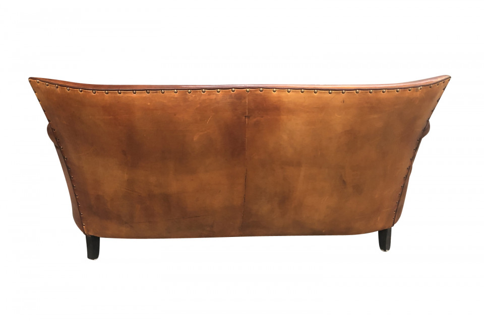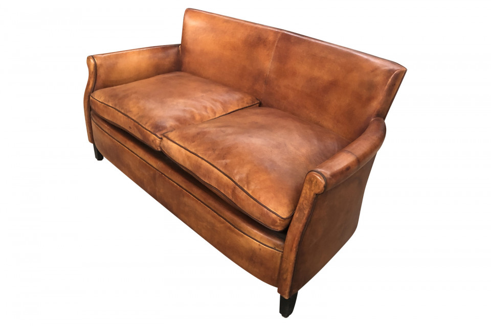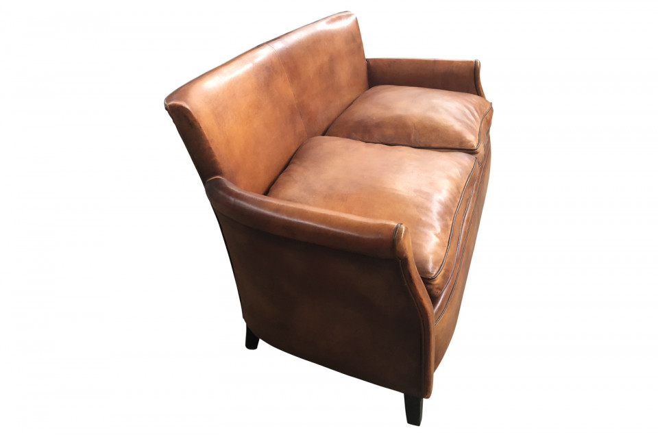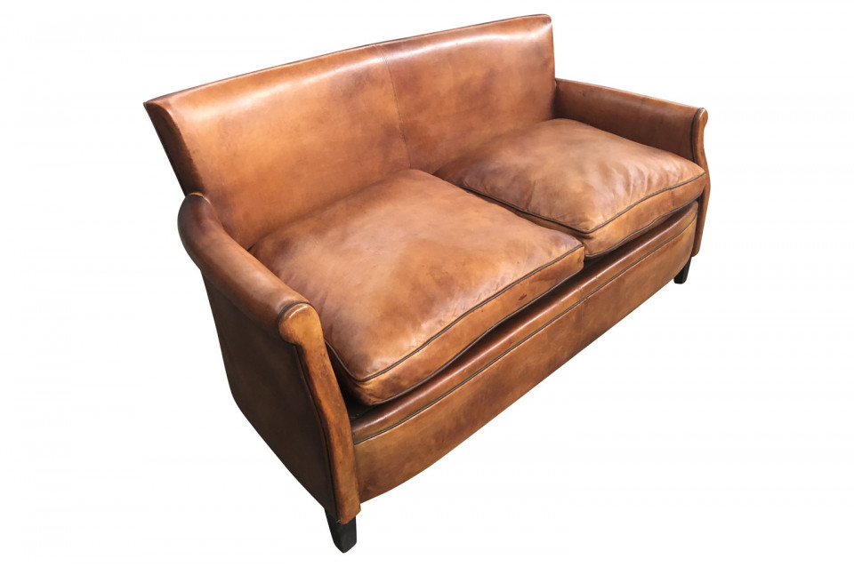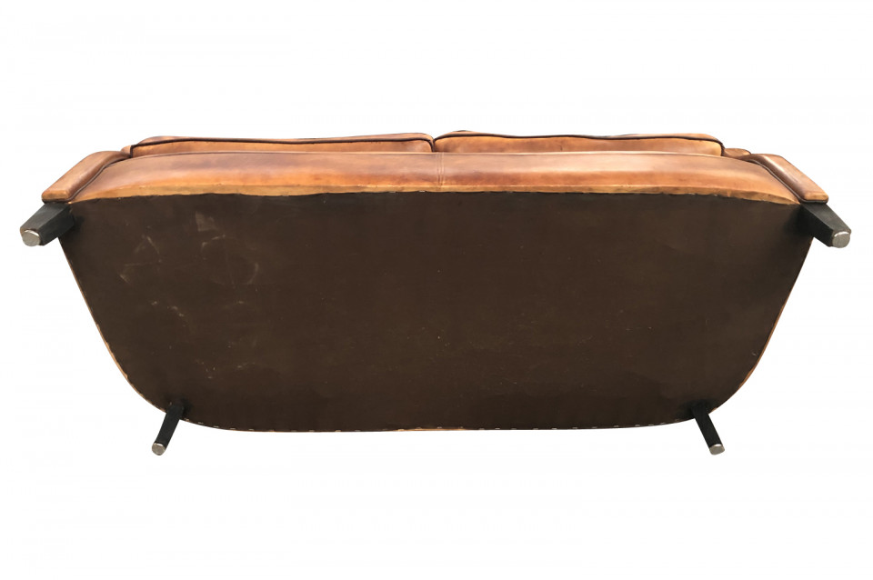 A sensational French Art Deco Style Club Sofa in beautiful leather. Terrific patina and very comfortable. Wonderful minimalist design and diminutive scale. Seat height is 18 3/4".