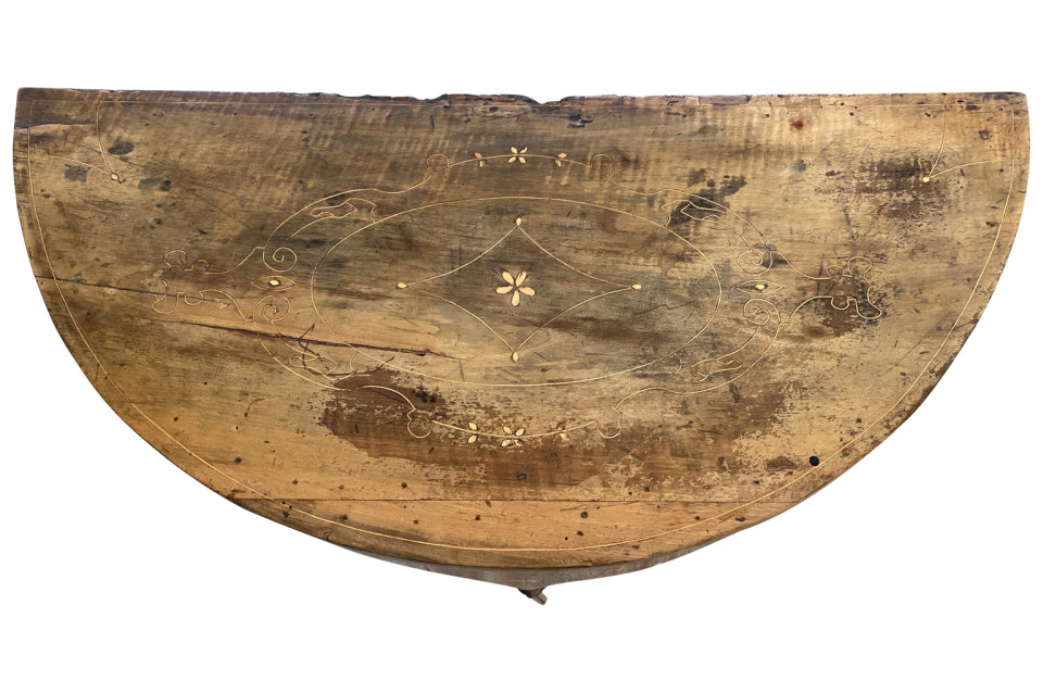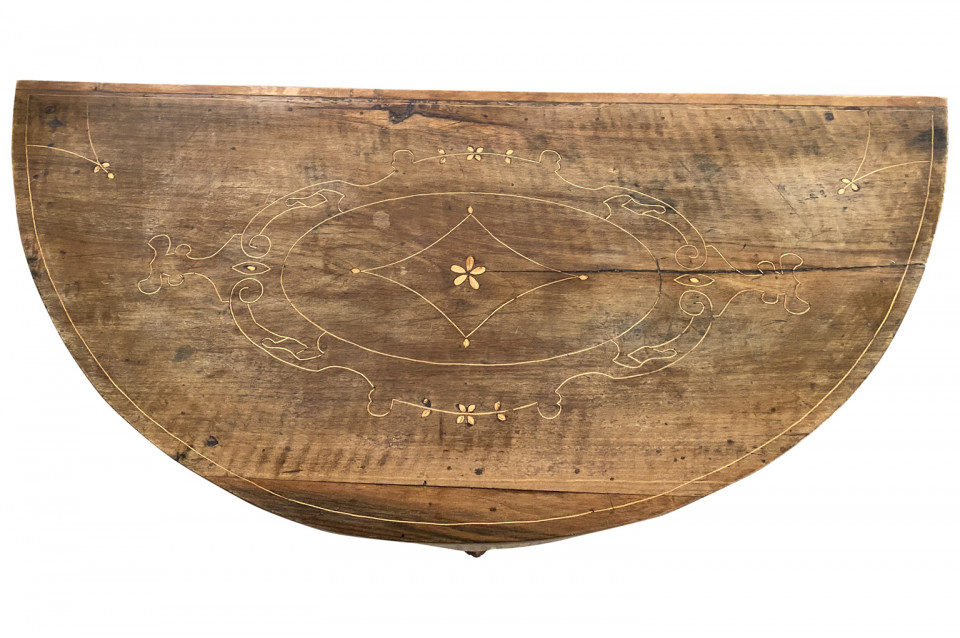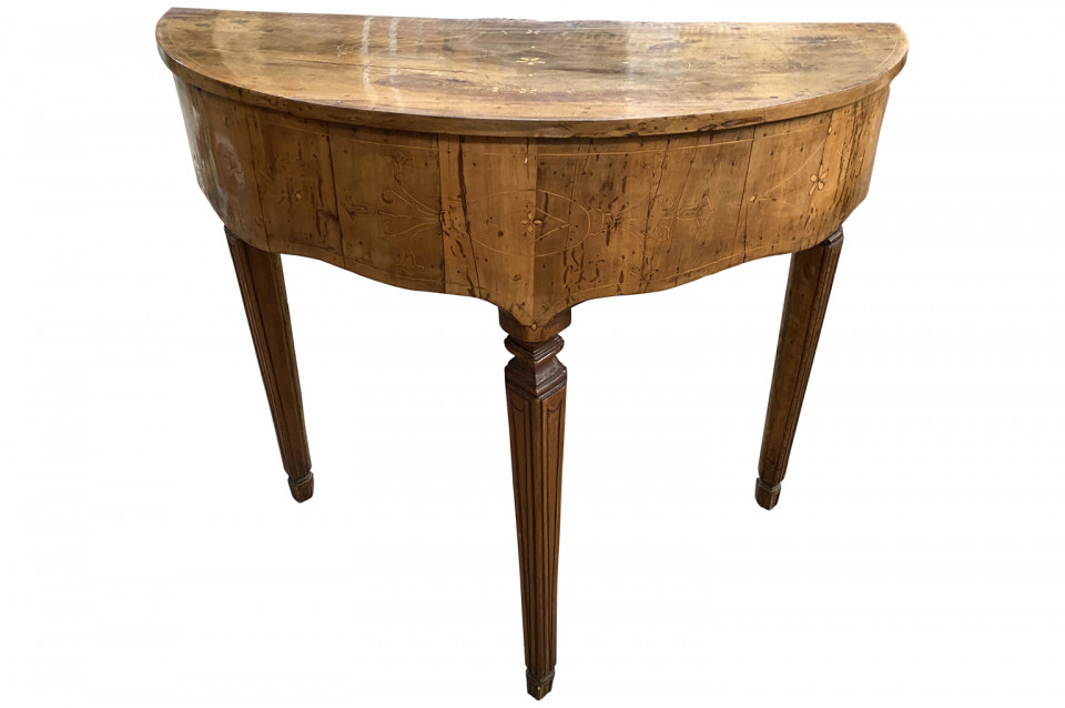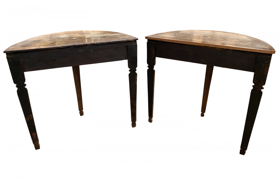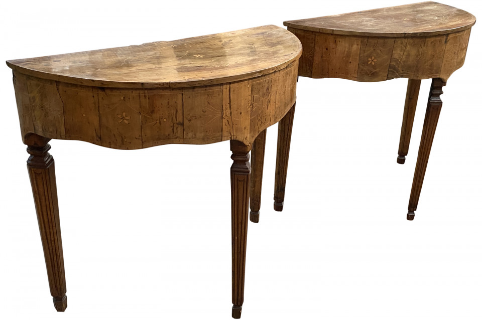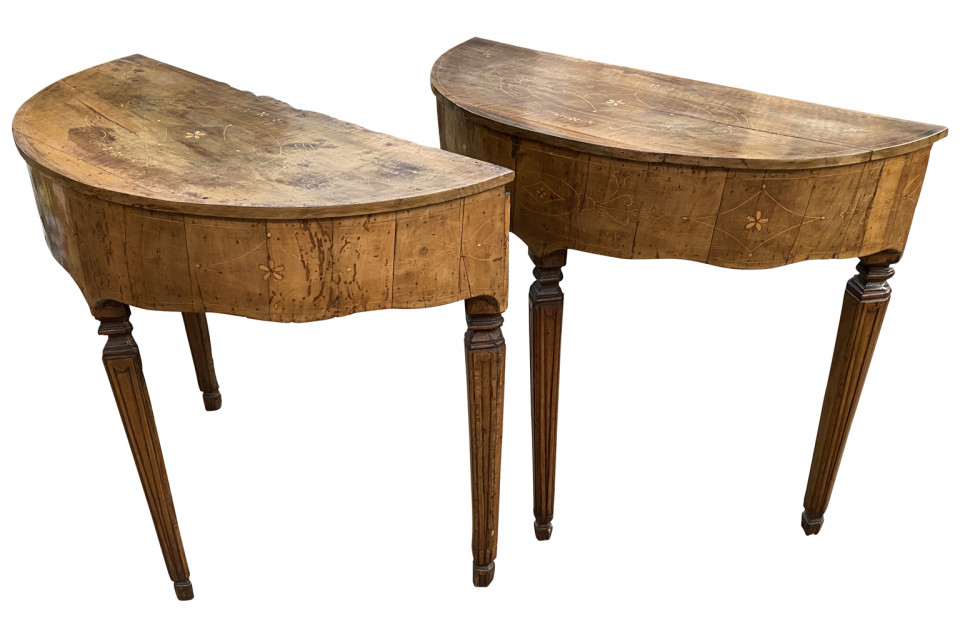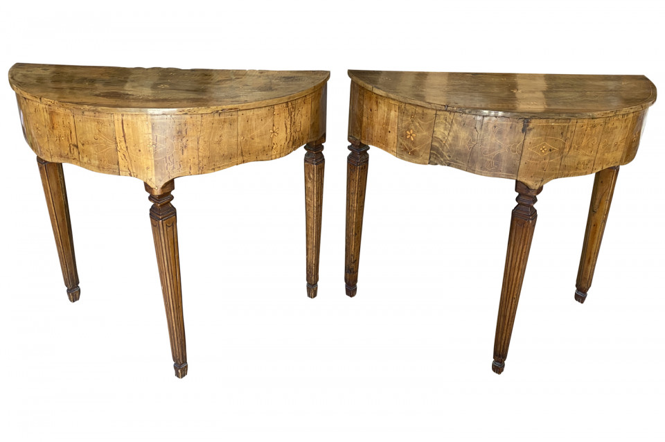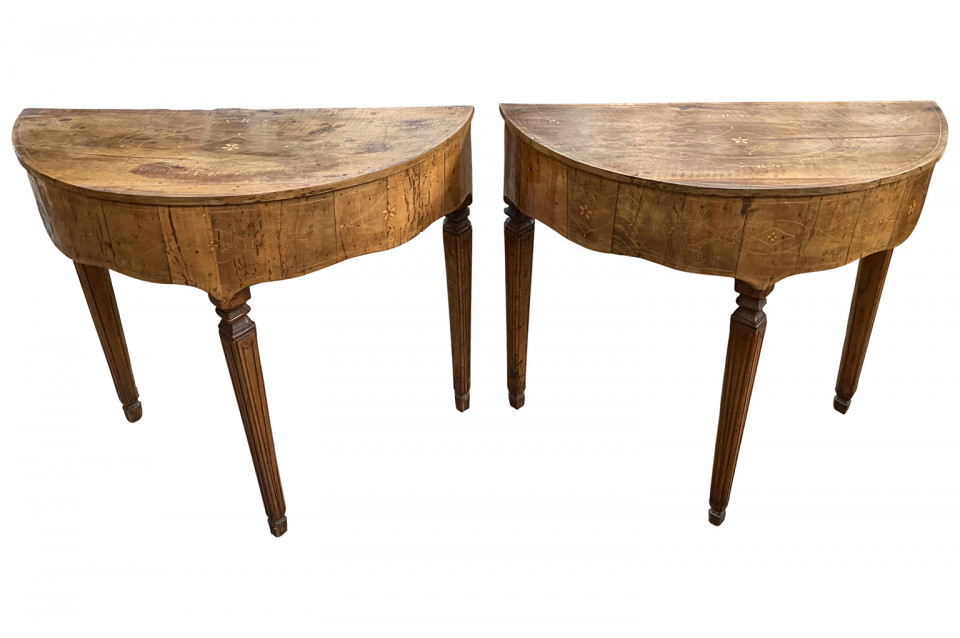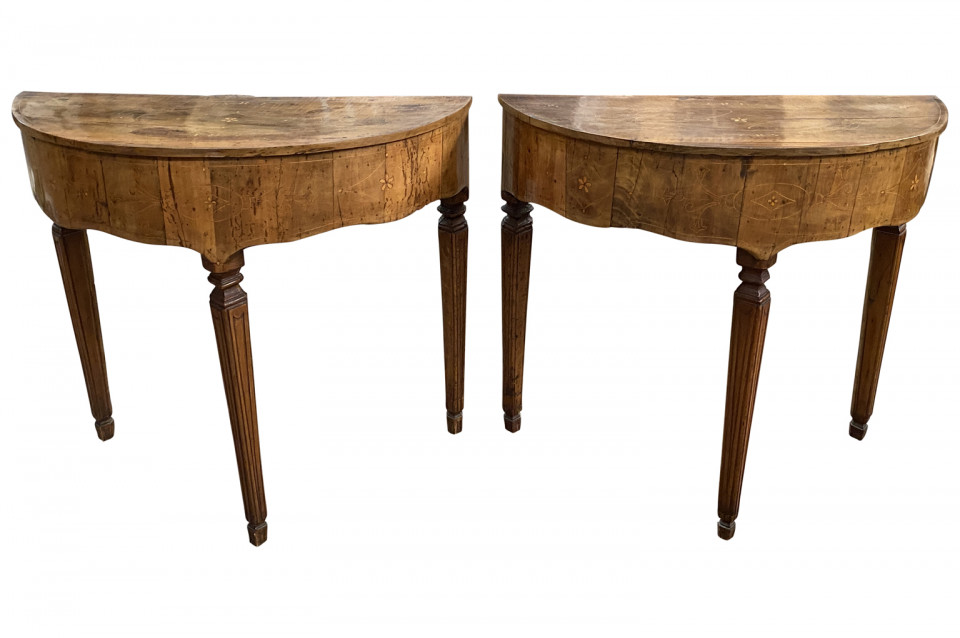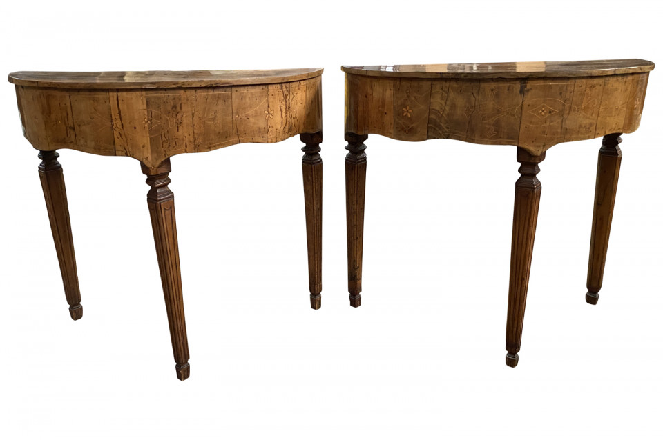 A stunning pair of Venetian 18th century Demi Lune Console Tables beautifully constructed with thick hand cut walnut veneer and fruitwood marquetry detailing to the tops. Gorgeous patina.