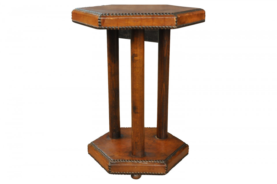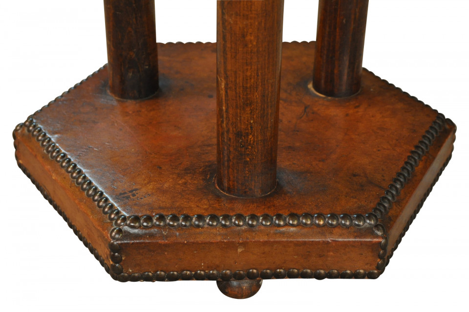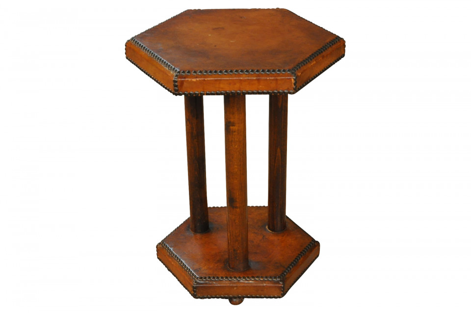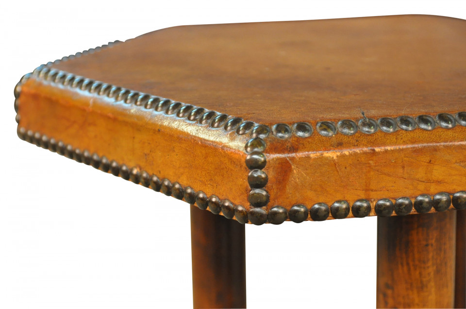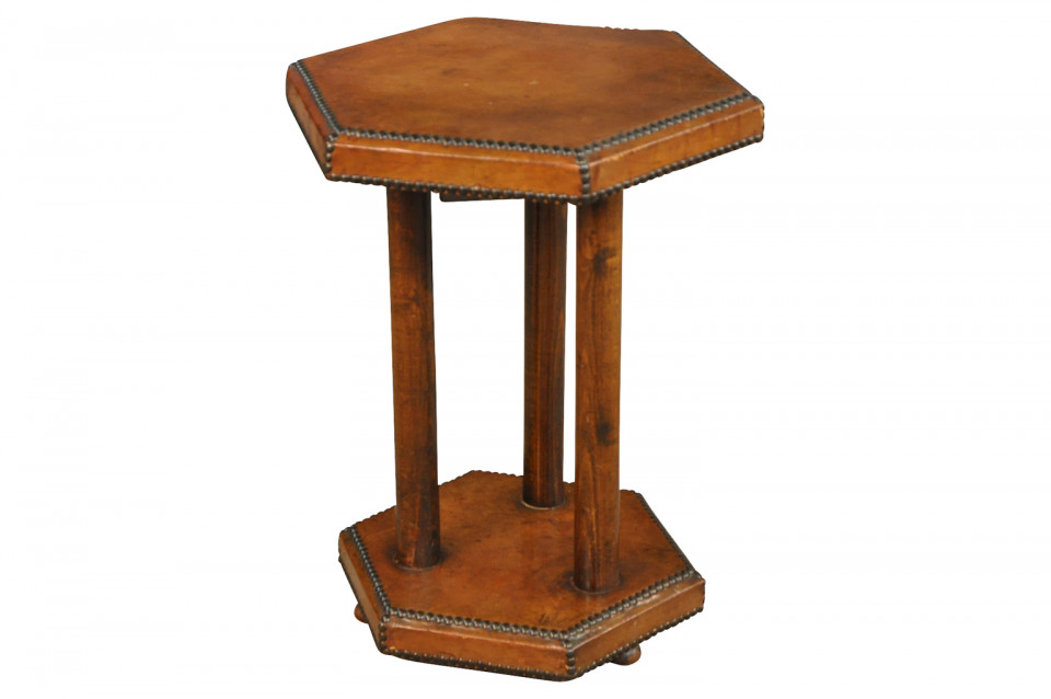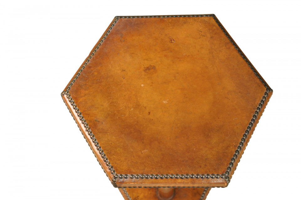 A very handsome French Art Deco Period Gueridon in leather. Wonderful nailhead detailing.
