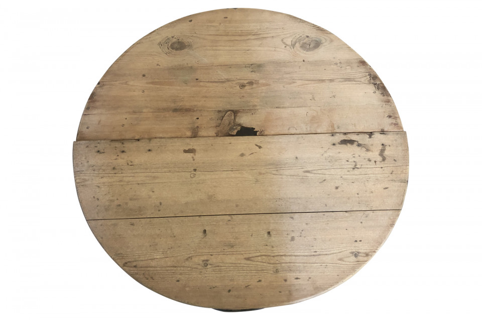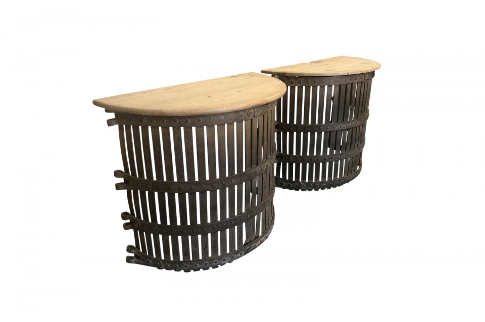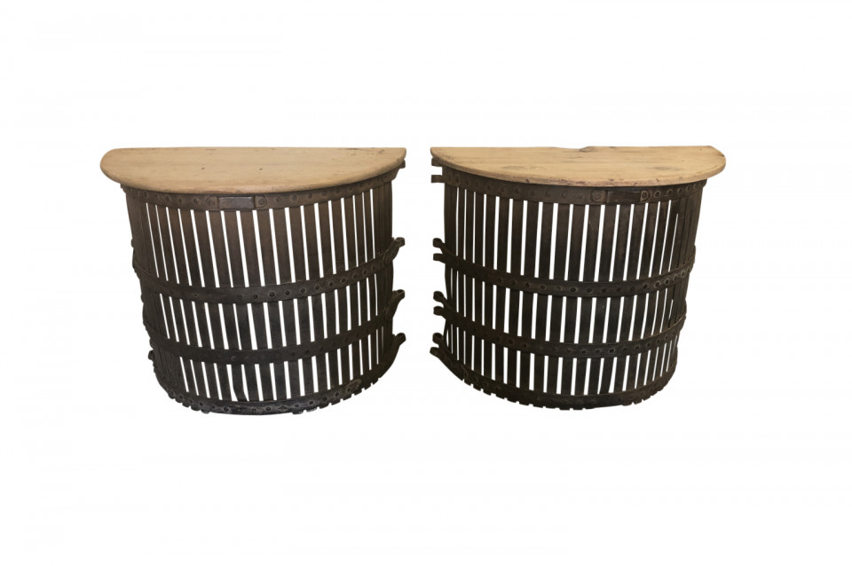 A very charming pair of Spanish Demi Lune Console Tables. These console tables are composed from forged iron tree guards with naturally washed wooded tops. A fun accent for any casual environment.