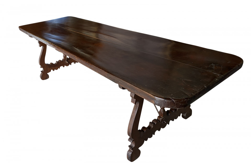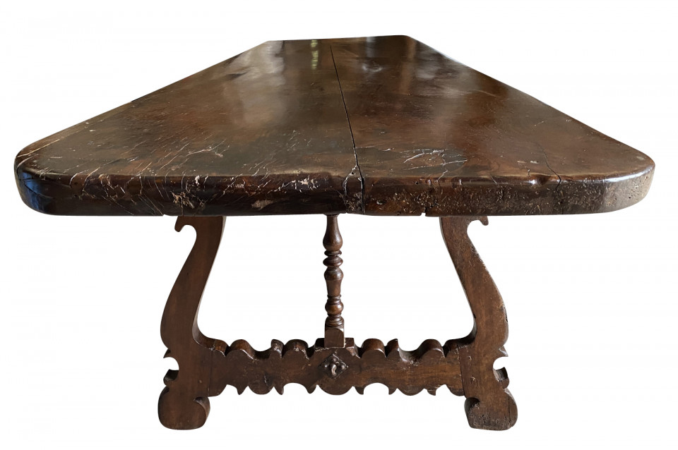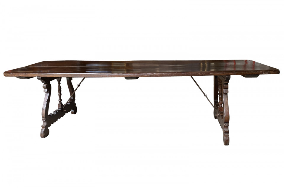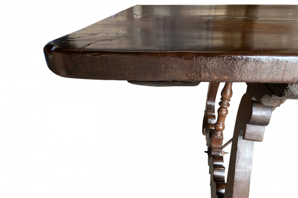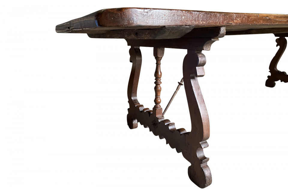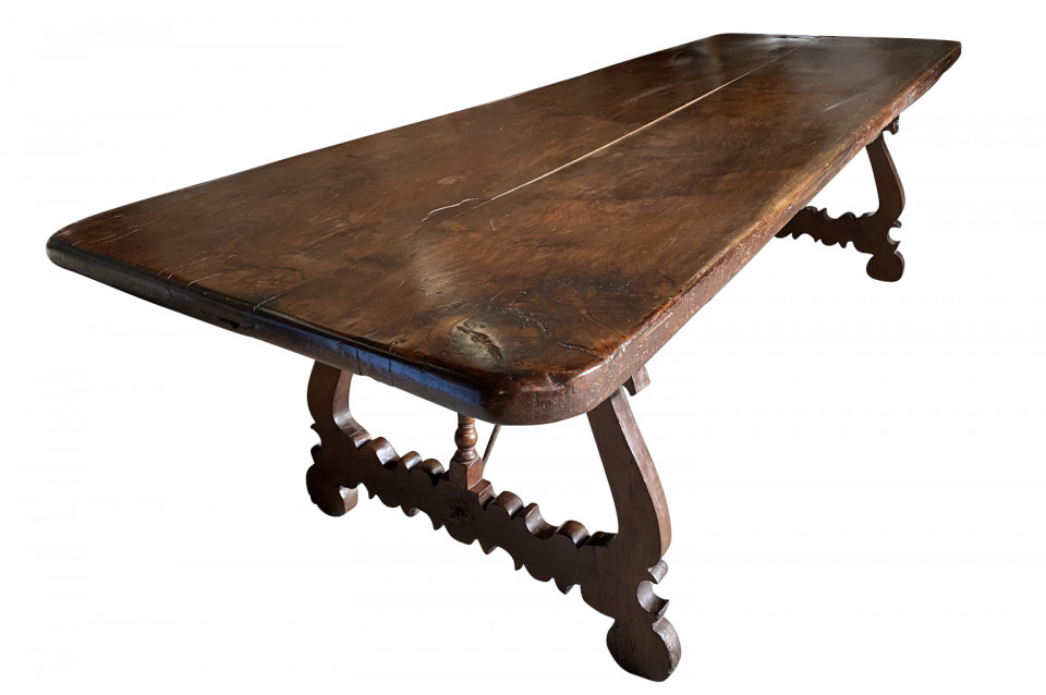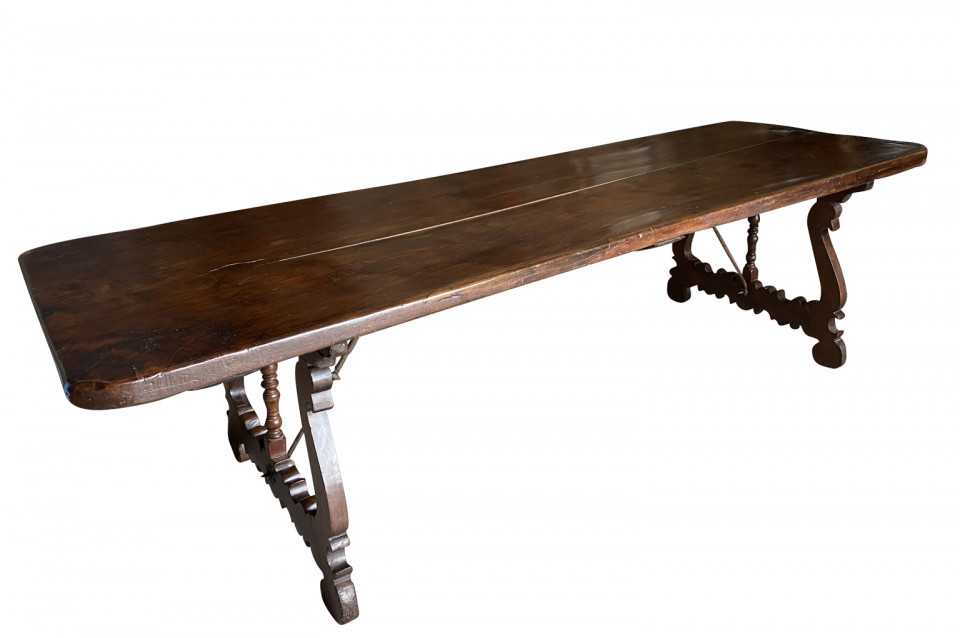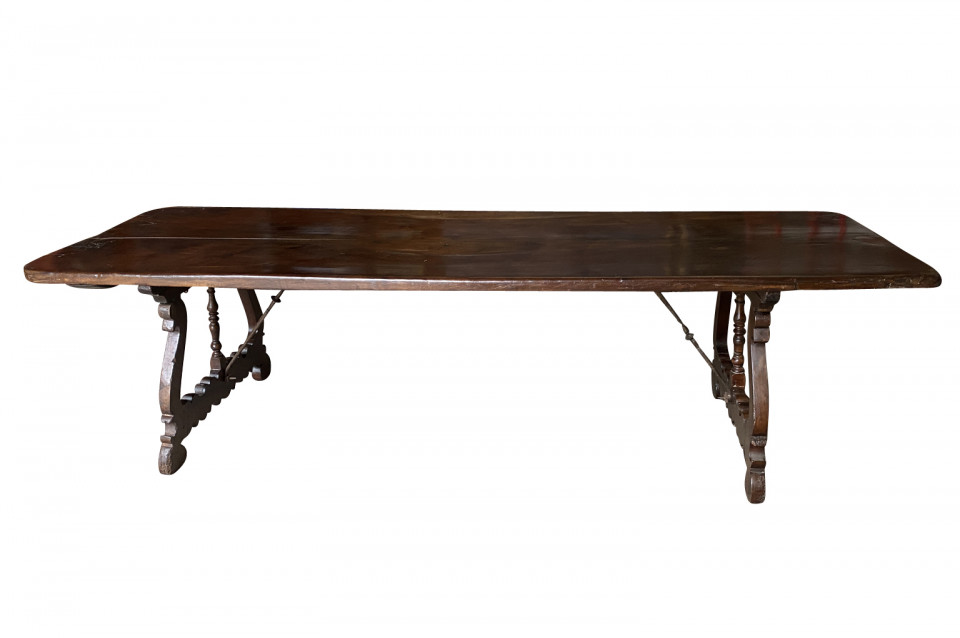 An outstanding 18th century Dining Table - Farm Table from the Lombardy region of Italy. Beautifully constructed from stunning walnut with lyre shaped legs and hand forged iron stretchers. Wonderful patina - very warm and luminous. A wonderful table for large family gatherings.
