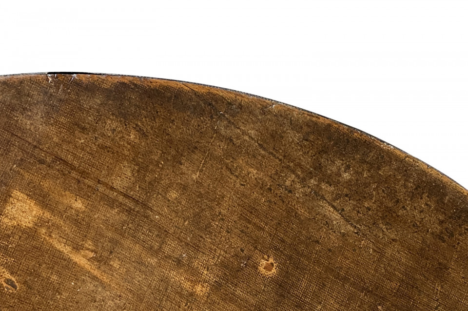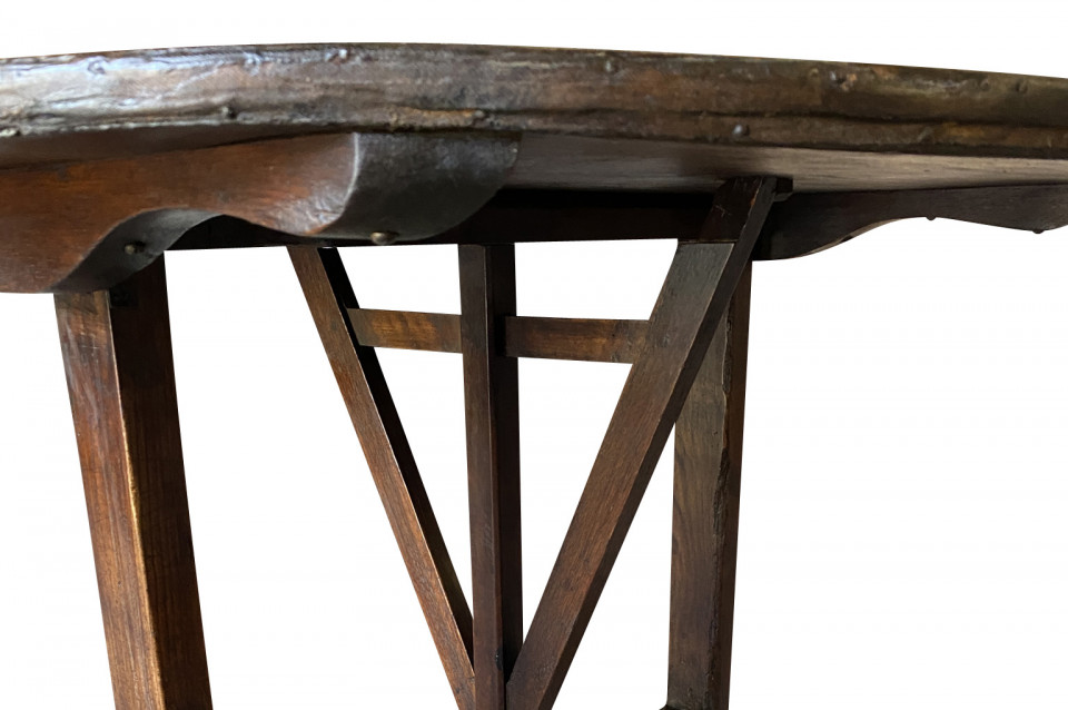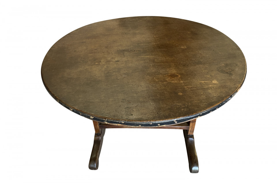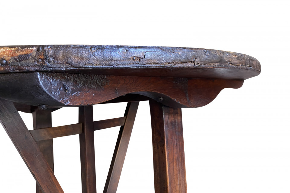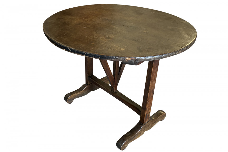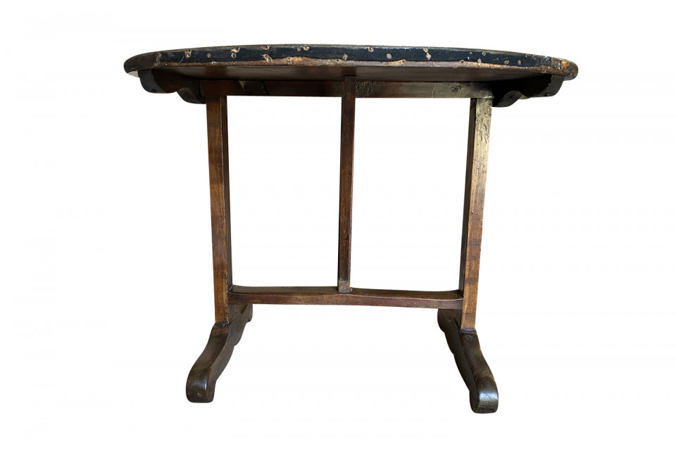 A very charming mid-19th century Table Vigneron - Wine Tasting Table from Beaune, France. Beautifully constructed from richly stained oak with a tilting top, charming scalloped braces under the top and a handsome moleskin top. Fabulous patina.