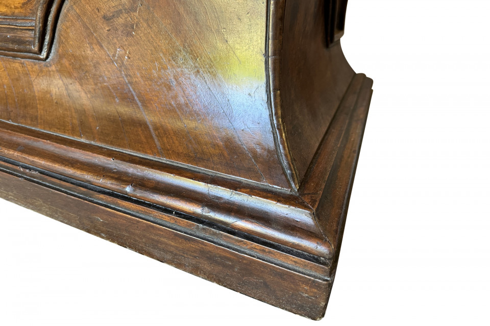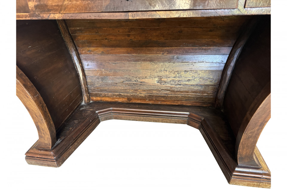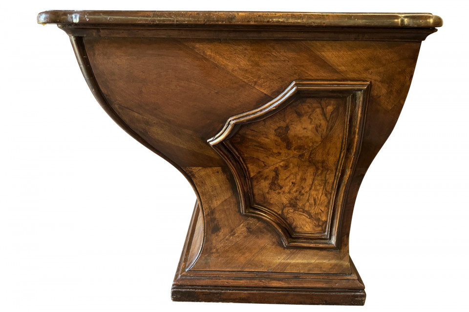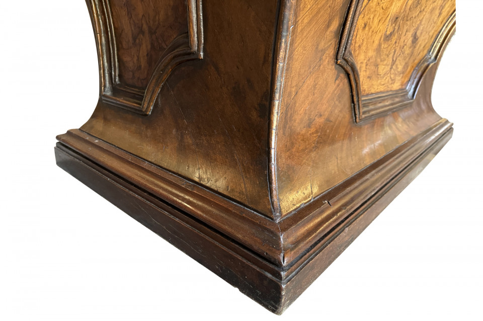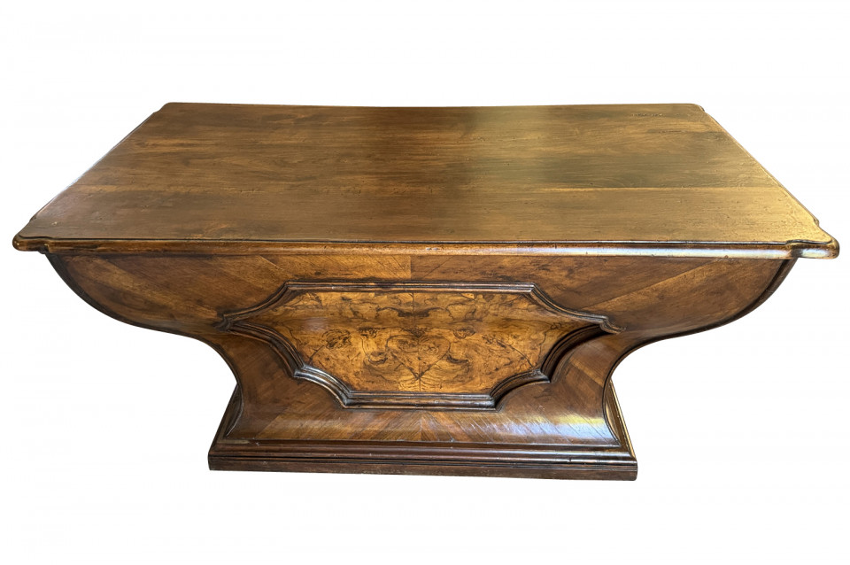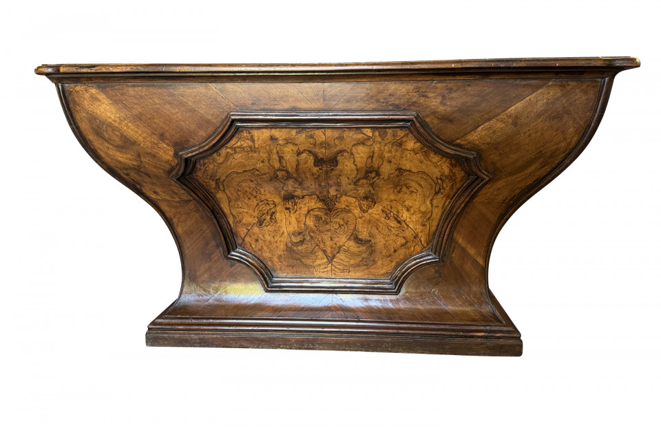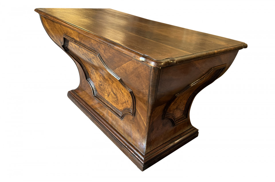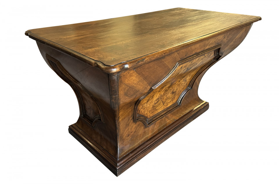 An outstanding 18th century Louis XIV Auctioneer’s Desk from Lombardy, Italy. Beautifully constructed from walnut and olive wood veneers with three drawers in an altar-like form. Exceptional patina. A true statement piece for any living area.