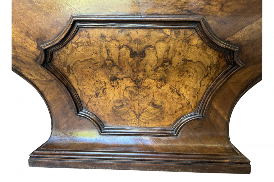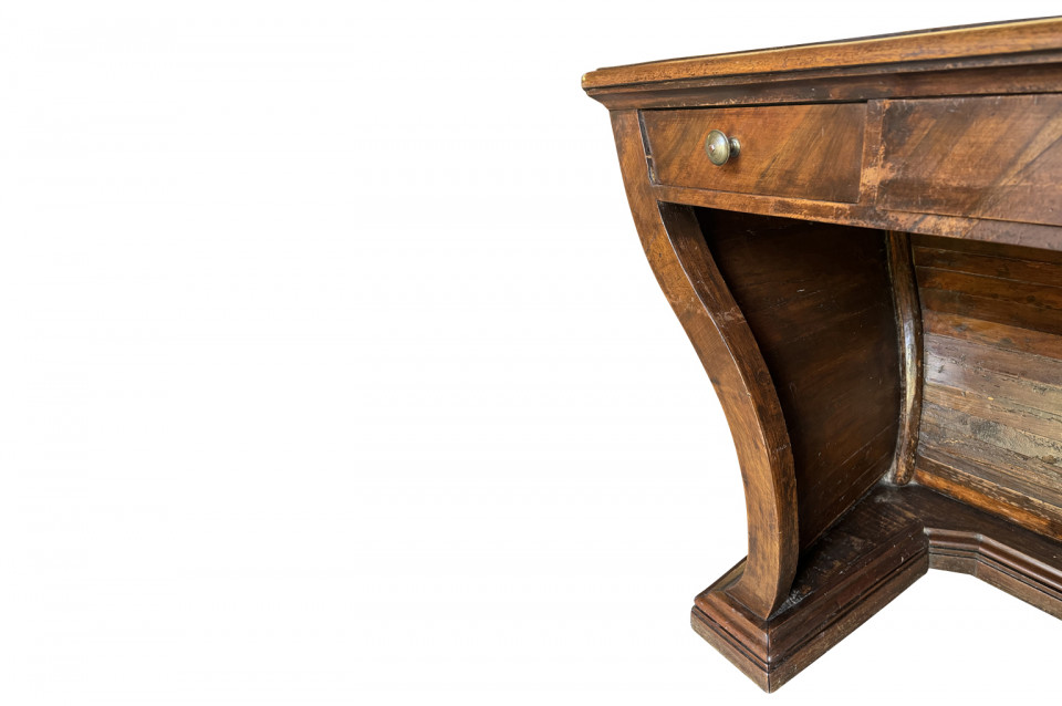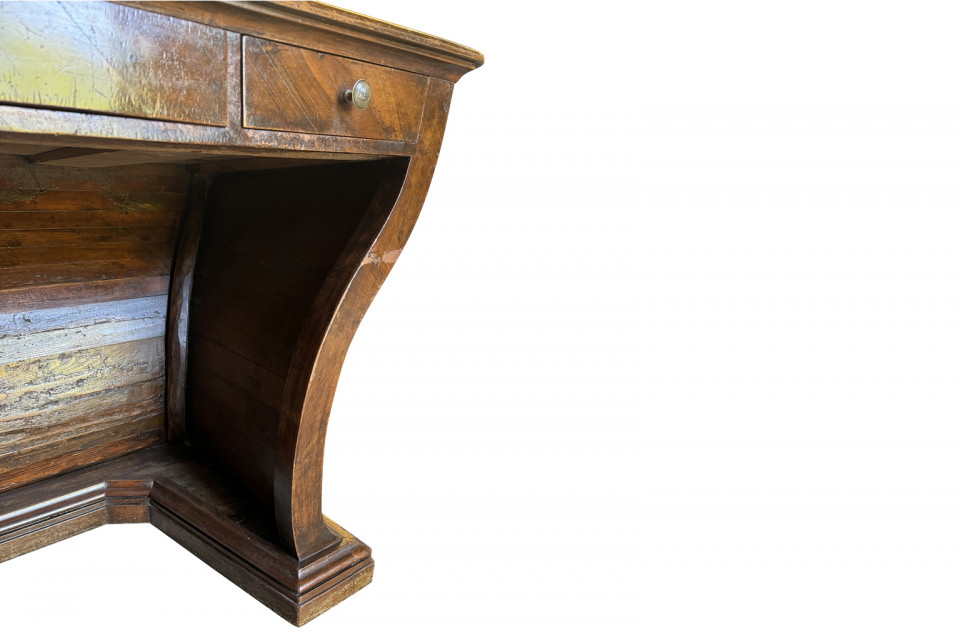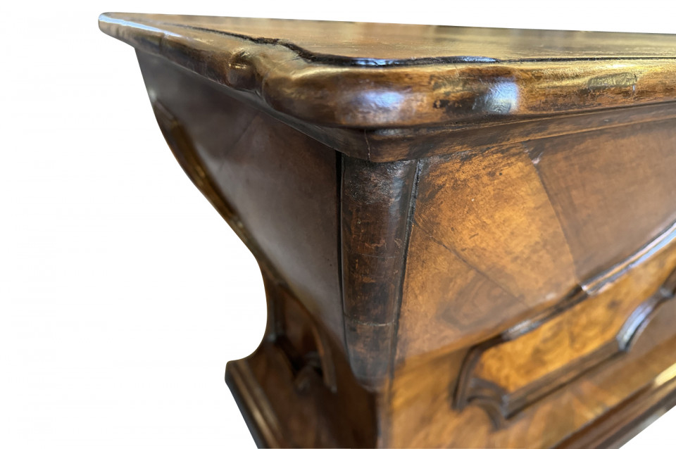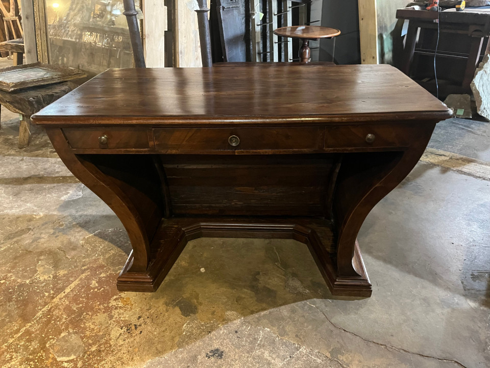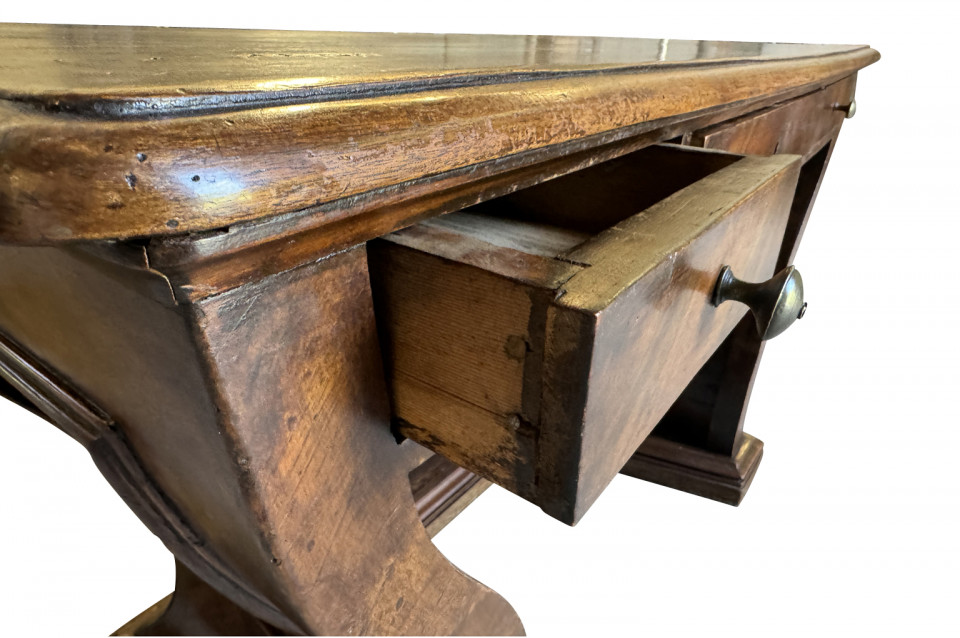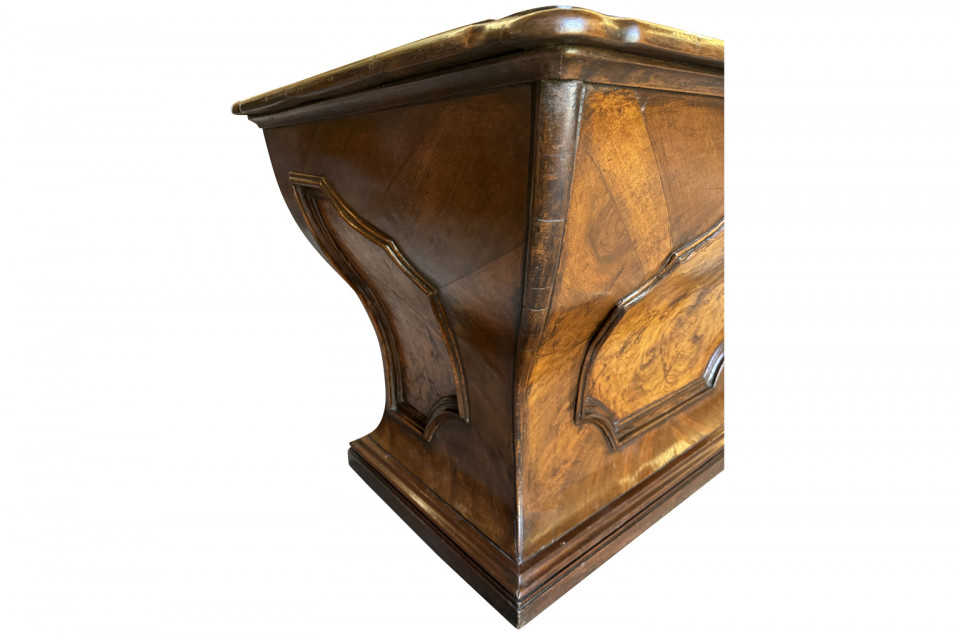 An outstanding 18th century Louis XIV Auctioneer’s Desk from Lombardy, Italy. Beautifully constructed from walnut and olive wood veneers with three drawers in an altar-like form. Exceptional patina. A true statement piece for any living area.