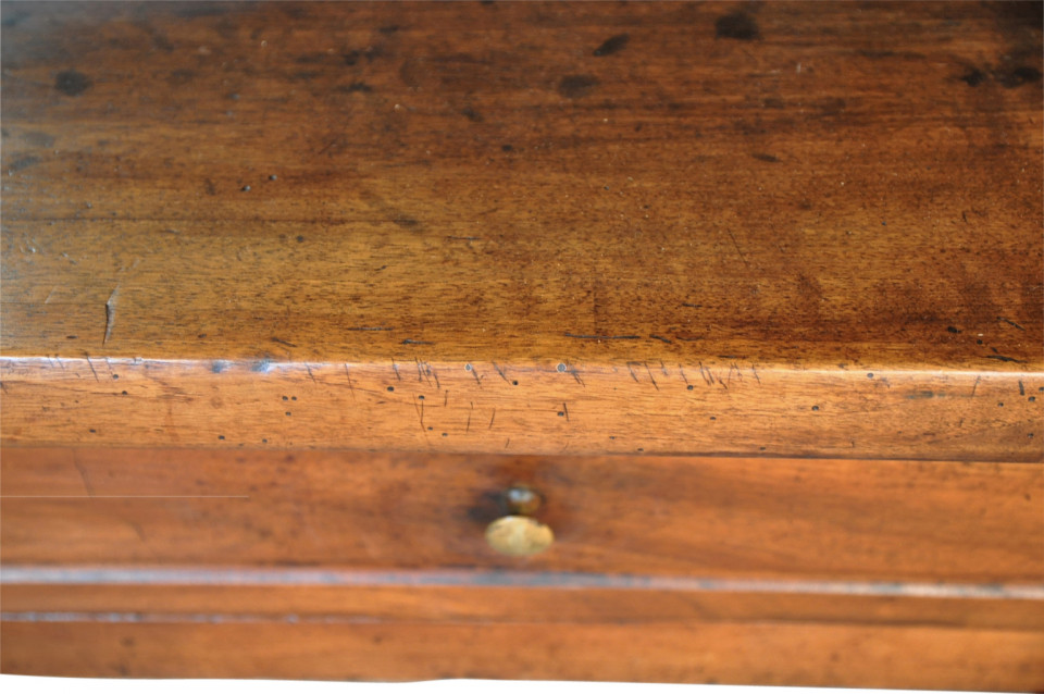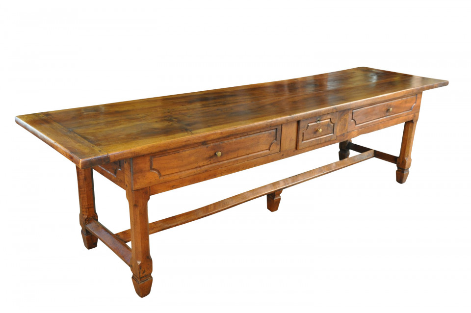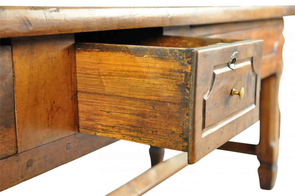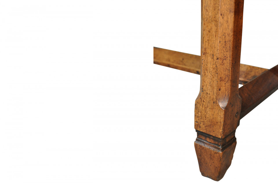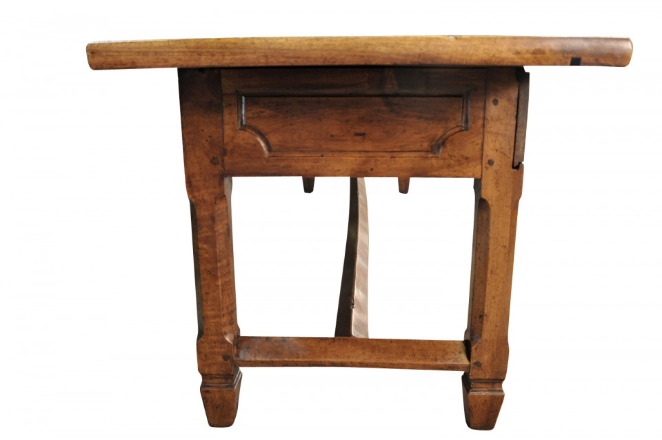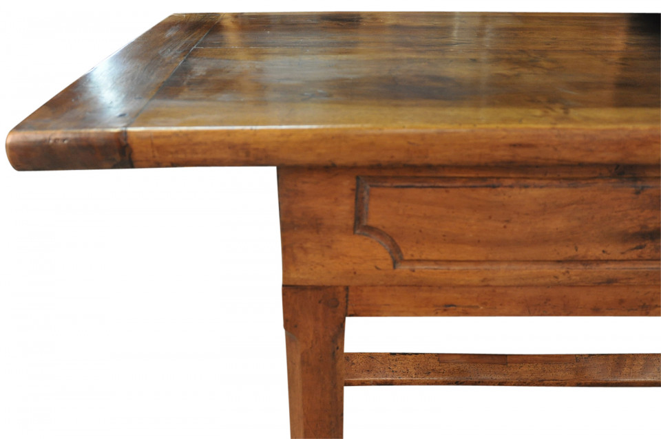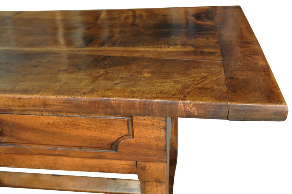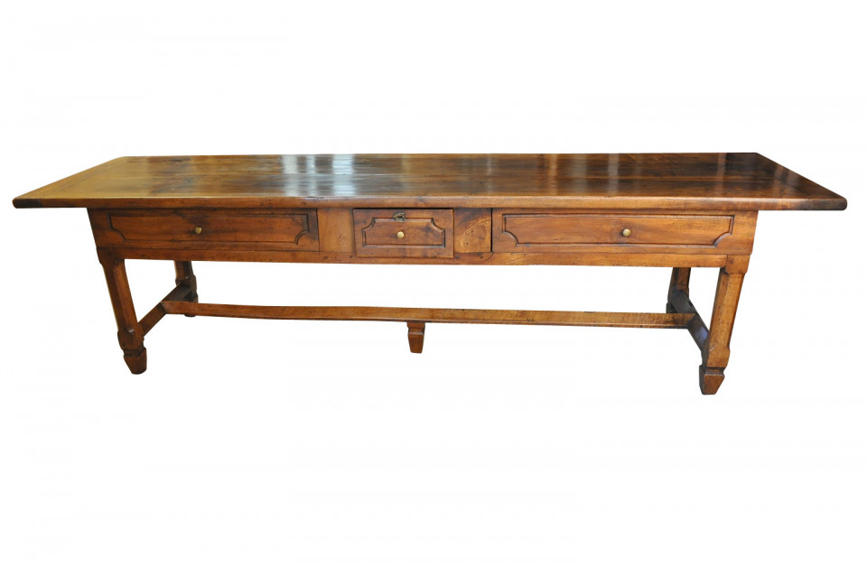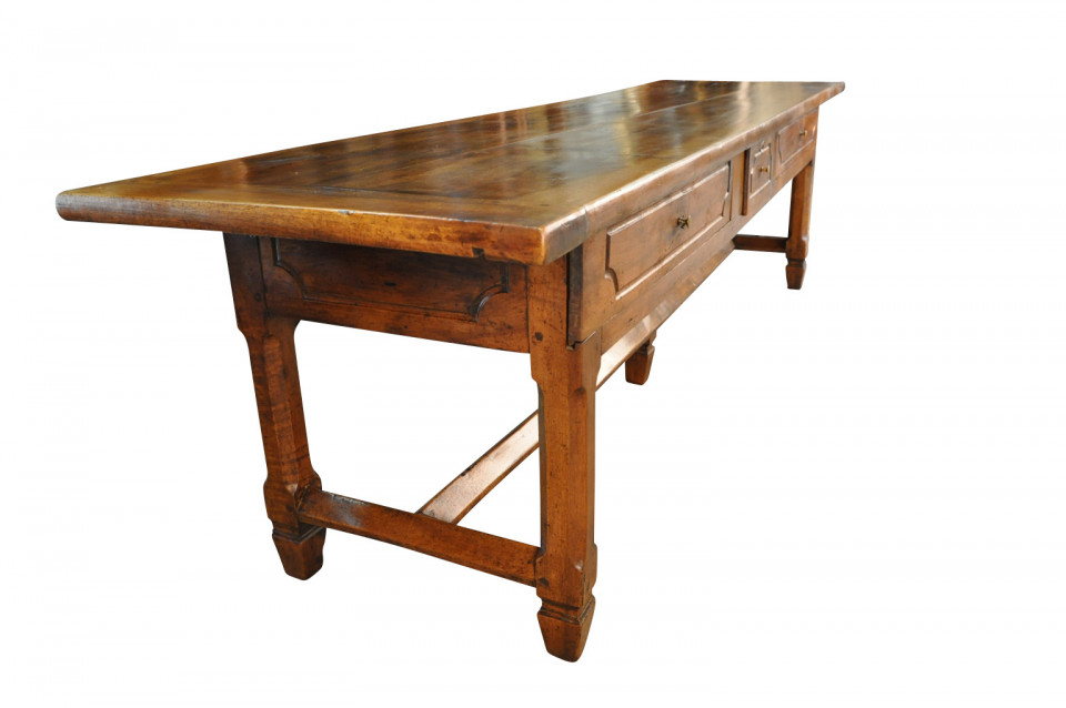 A very handsome French 18th century grand scale console table. This wonderful piece is constructed from beautiful walnut with a single drawer and 2 sliding panels with bronze pulls and wonderfully sculpted legs. Terrific patina and graining - rich and luminous.