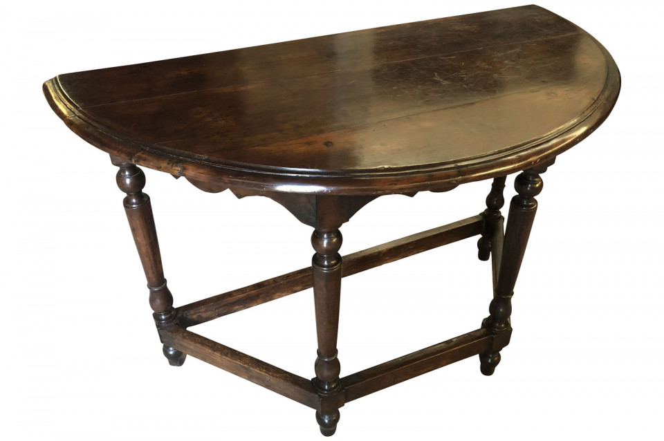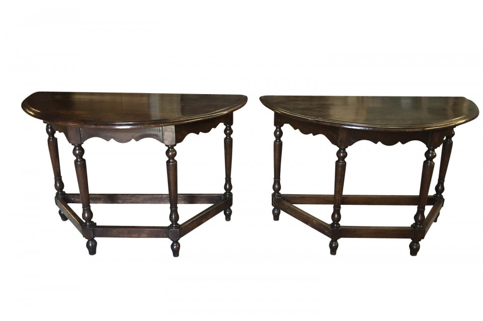 An outstanding pair of 18th century Demi Lune console tables from the Lombardi region of Italy. Beautifully constructed from stunning walnut with a very handsome edge finish to the top, nicely sculpted apron and turned legs. Excellent patina - warm and luminous.