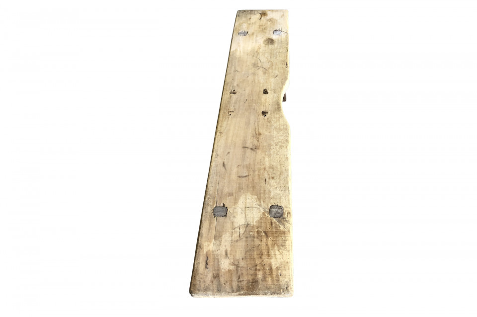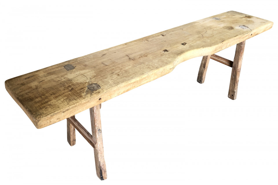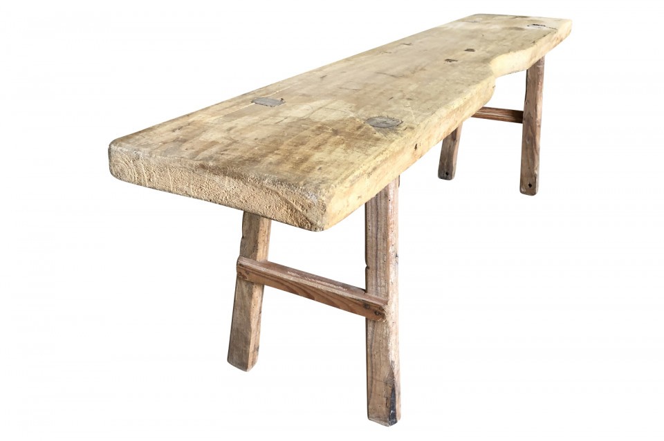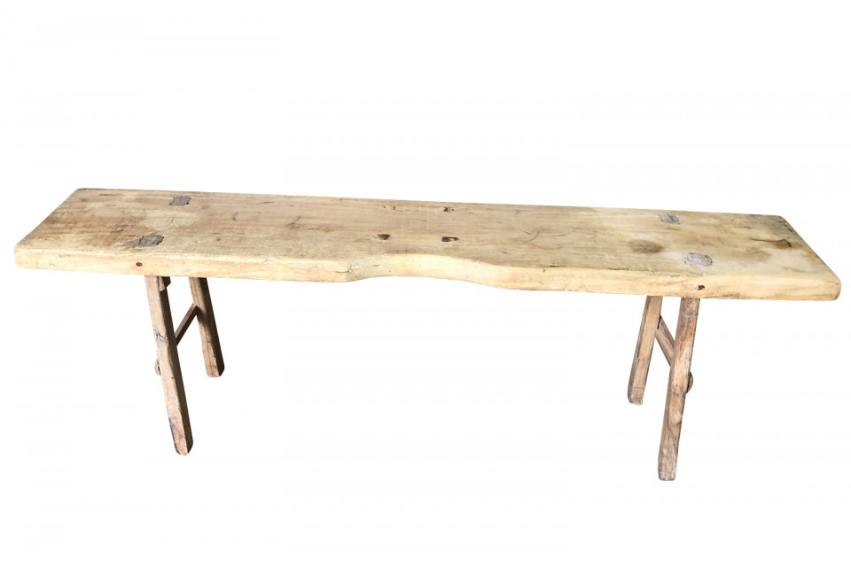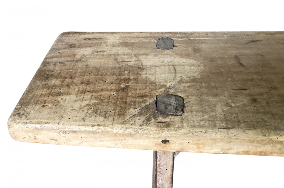 A very charming 19th century bench from the Catalan region of Spain. Wonderfully constructed with a solid board of poplar. Wonderful warm patina and very sturdy. Not only terrific as a bench but serves nicely as a narrow coffee table as well.