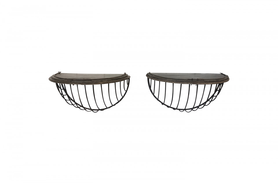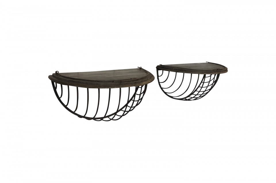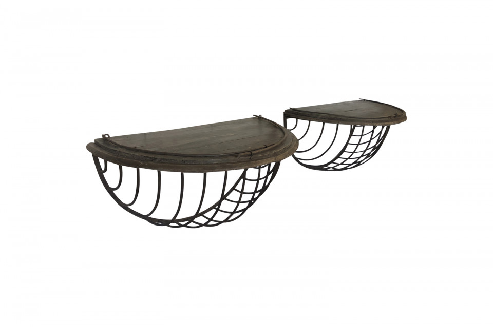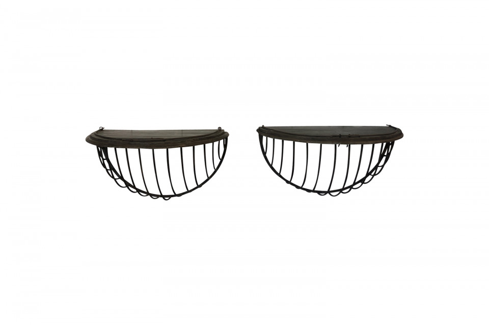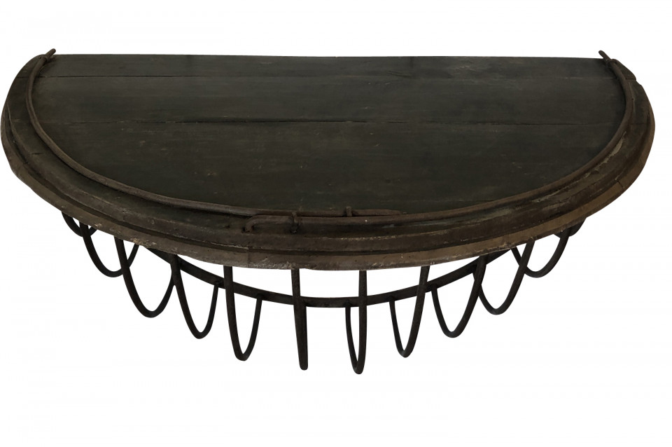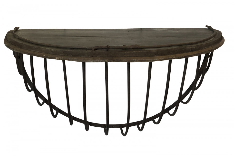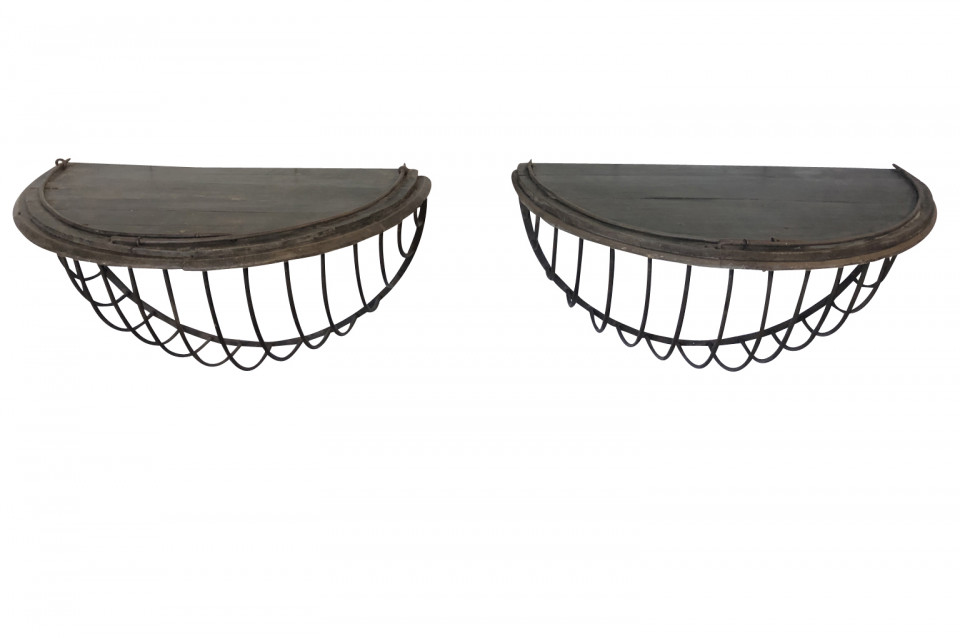 A wonderful pair of French Demi Lune wall suspended consoles constructed from iron hay troughs and wood. Terrific accents pieces for a sophistacated casual setting.