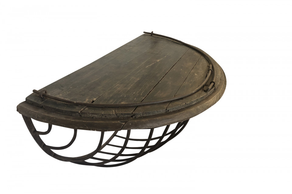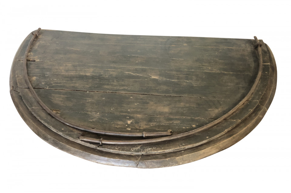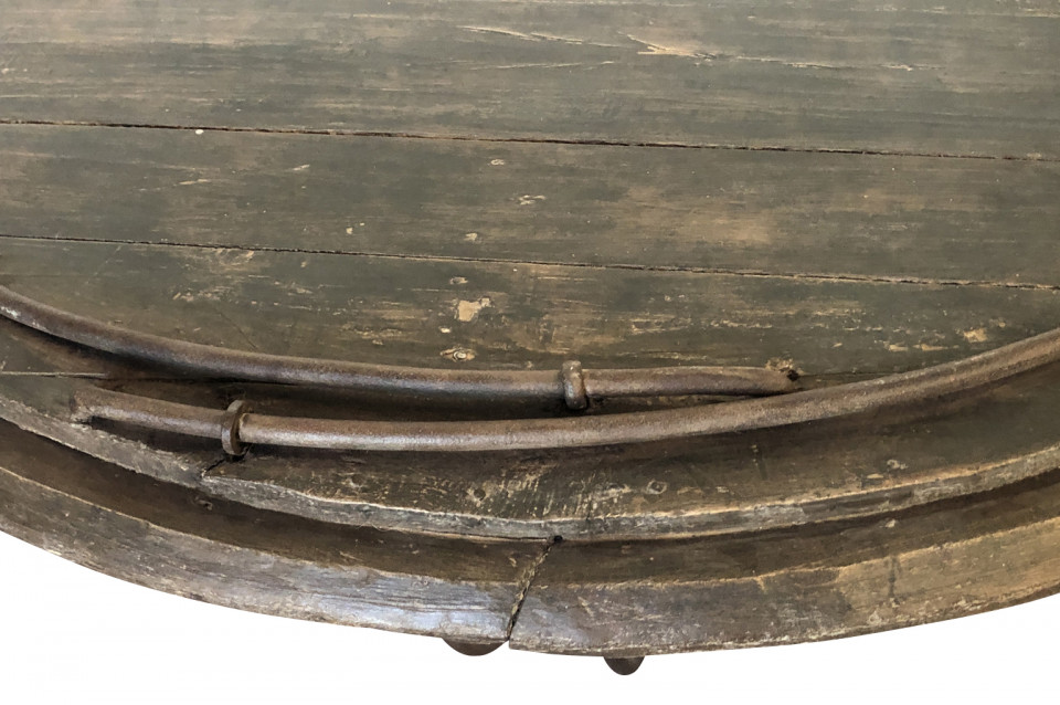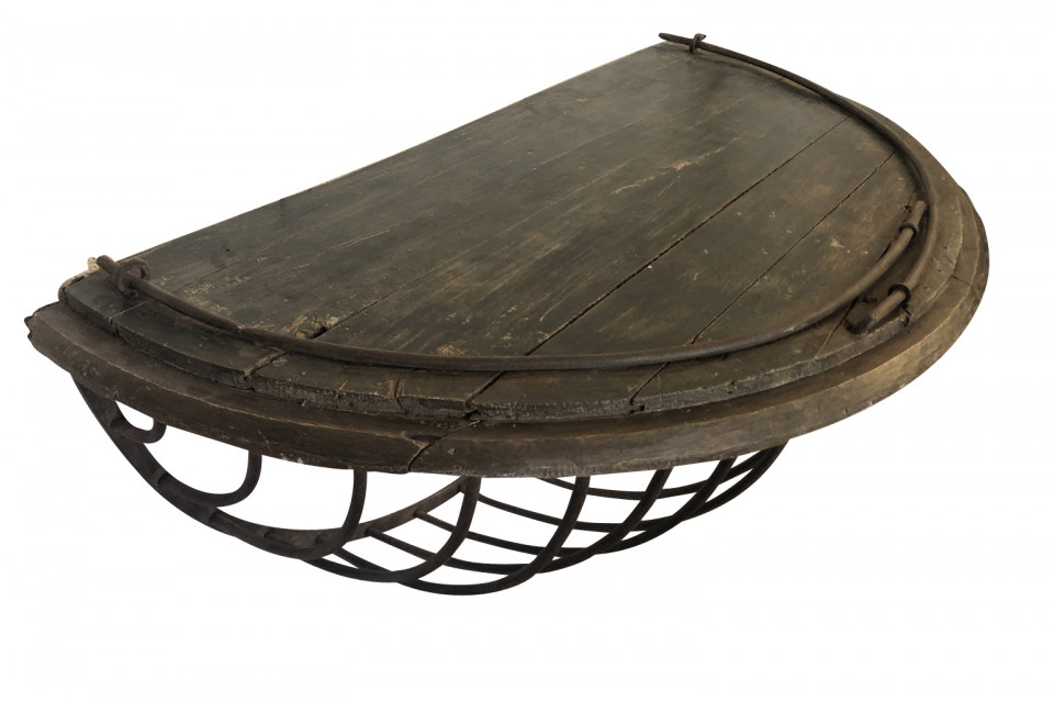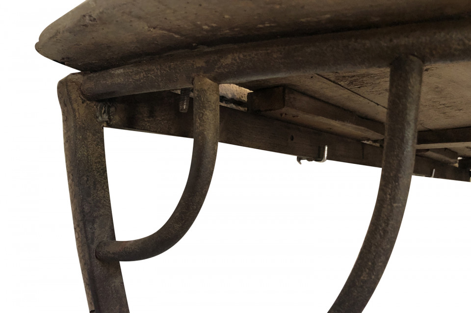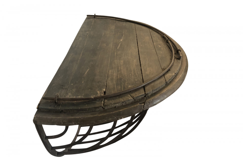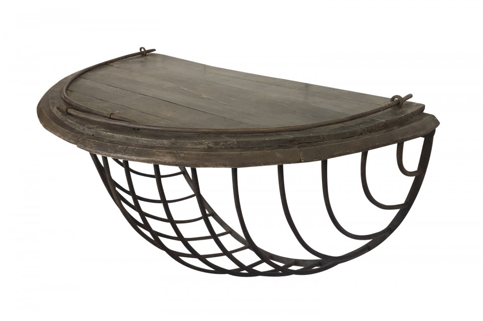 A wonderful pair of French Demi Lune wall suspended consoles constructed from iron hay troughs and wood. Terrific accents pieces for a sophistacated casual setting.