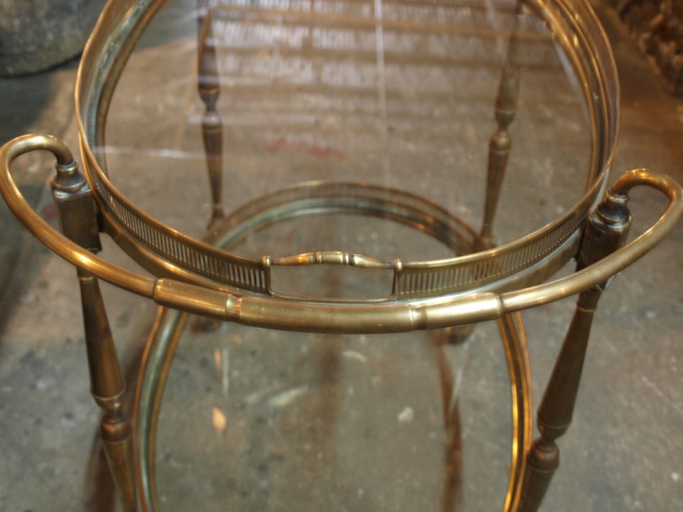 A wonderful mid century Italian cocktail cart or drinks cart in brass and glass. Sturdily constructed on casters with two removable serving trays. A terrific end table.