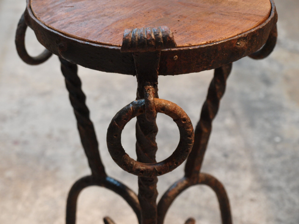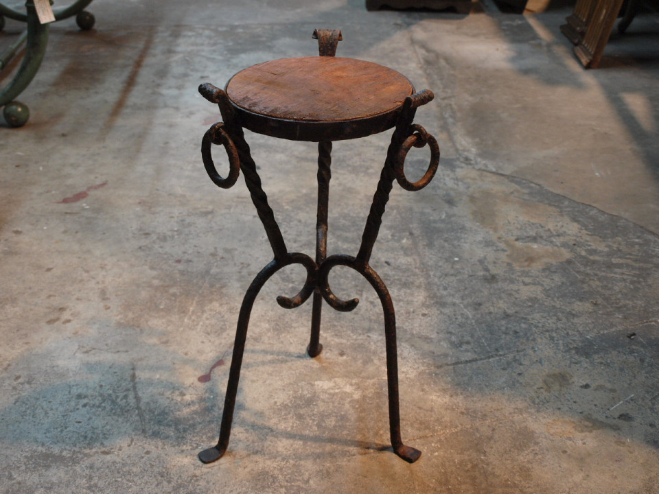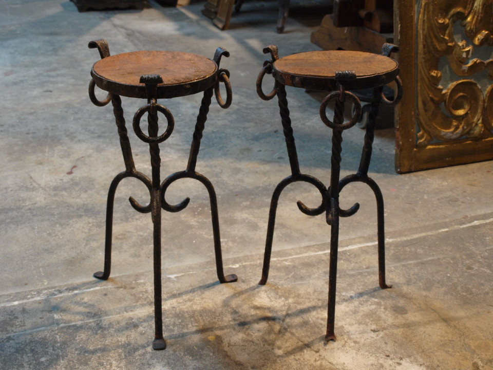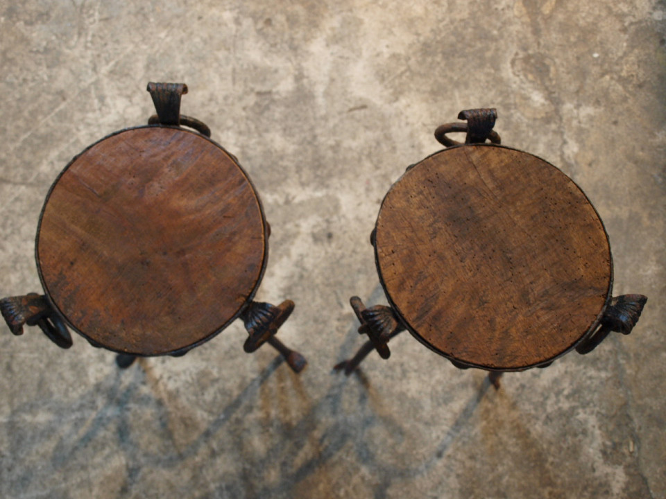 A charming pair of diminutive "cocktail tables" - petite occasional tables - in iron and wood. Originally, these iron pieces were to hold terracotta urns. Antique wood tops have been installed to create these charming tables.