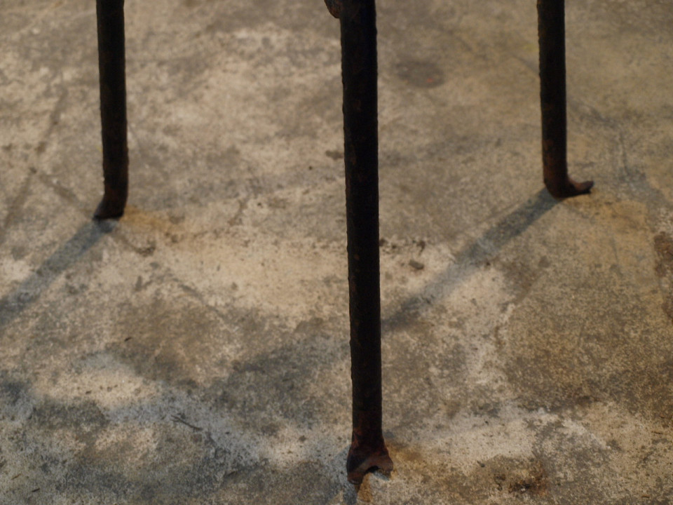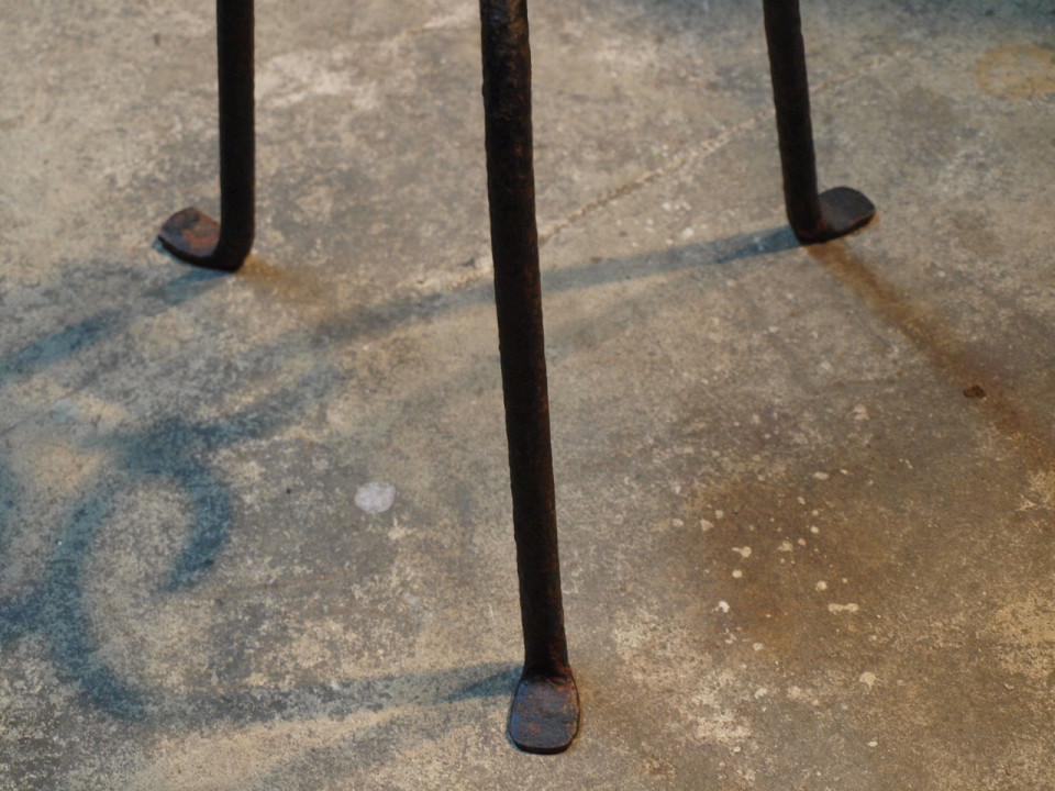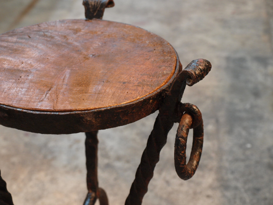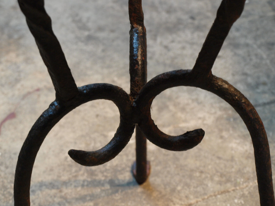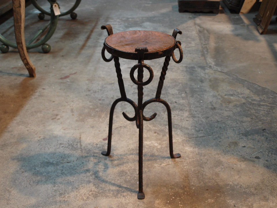 A charming pair of diminutive "cocktail tables" - petite occasional tables - in iron and wood. Originally, these iron pieces were to hold terracotta urns. Antique wood tops have been installed to create these charming tables.