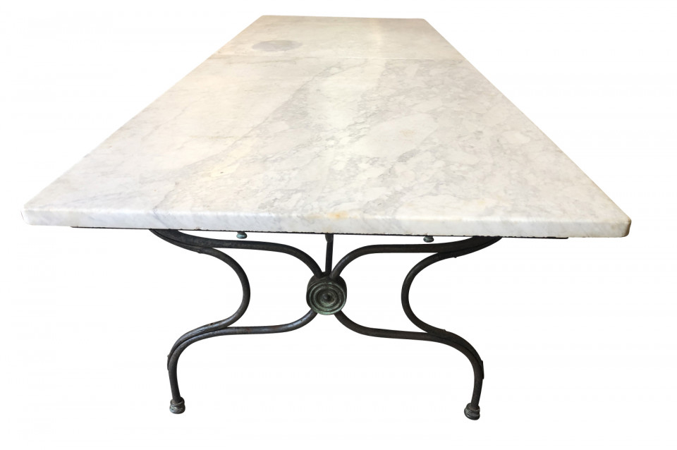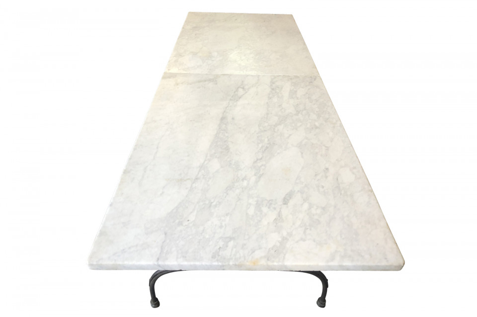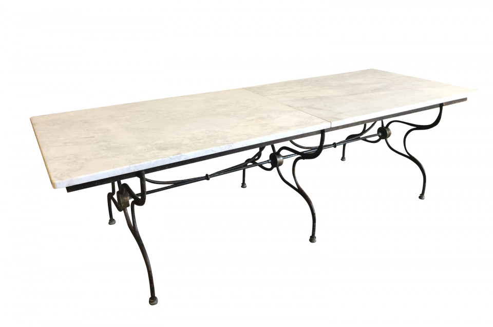 An outstanding and monumental Garden Dining Table from the Provence region of France. Soundly crafted from iron and a wonderful white marble top. The top is in 2 pieces of marble. Perfect for larger gatherings - interior or exterior.