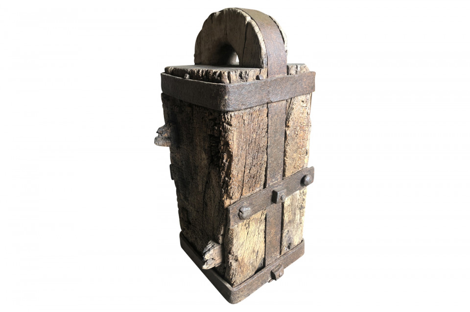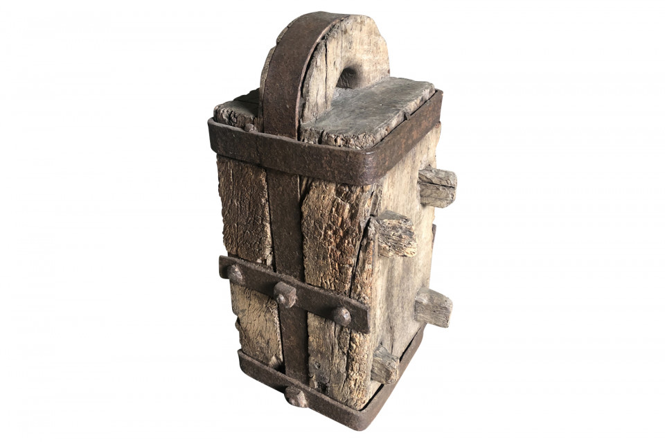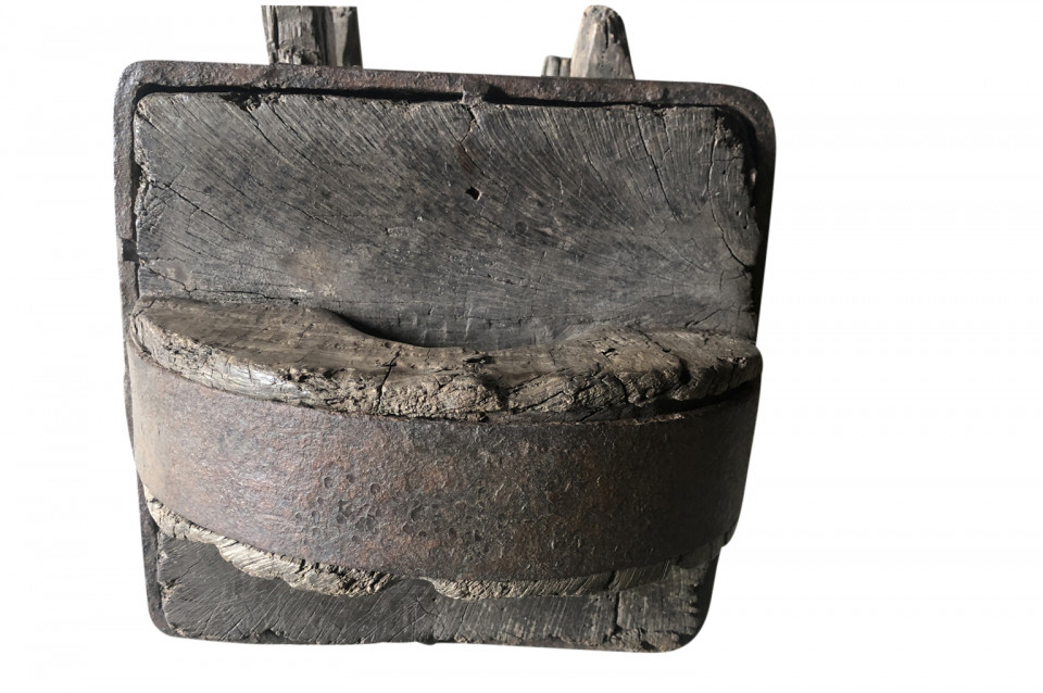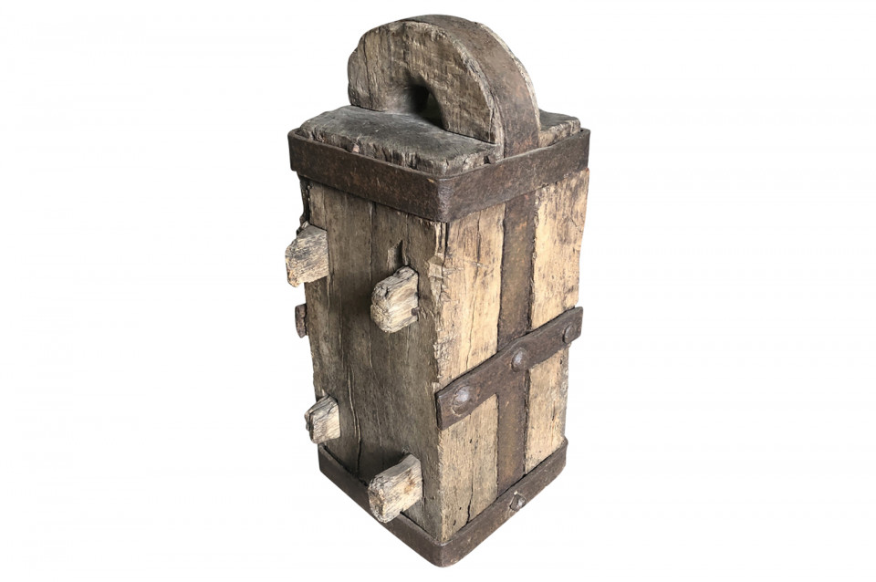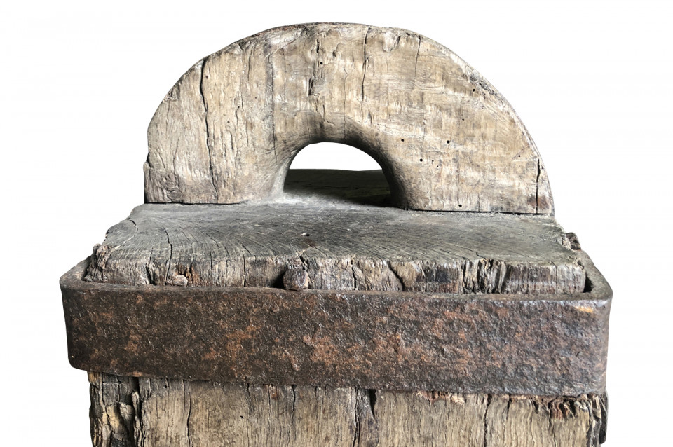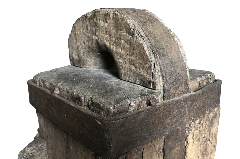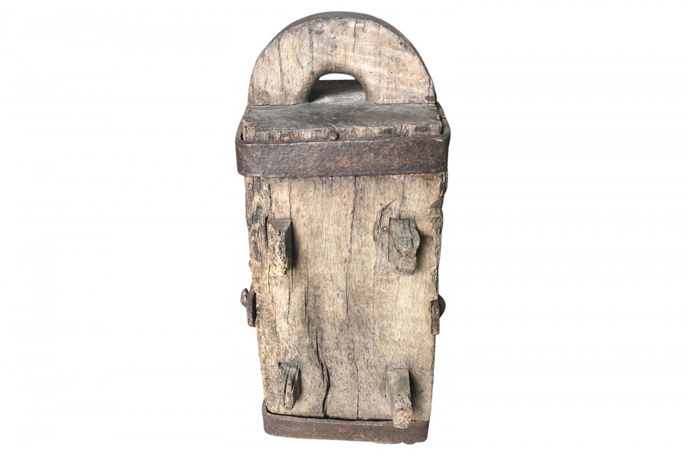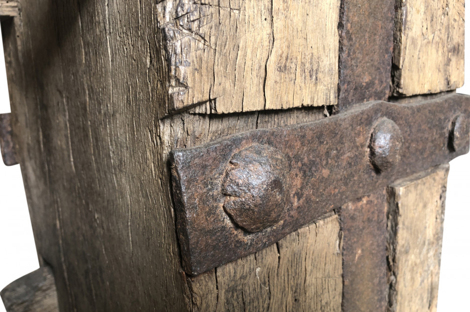 A wonderful and very unique 18th century Counter Weight in wood and iron from the Barcelona area. Wonderful as a cocktail table. Super patina.