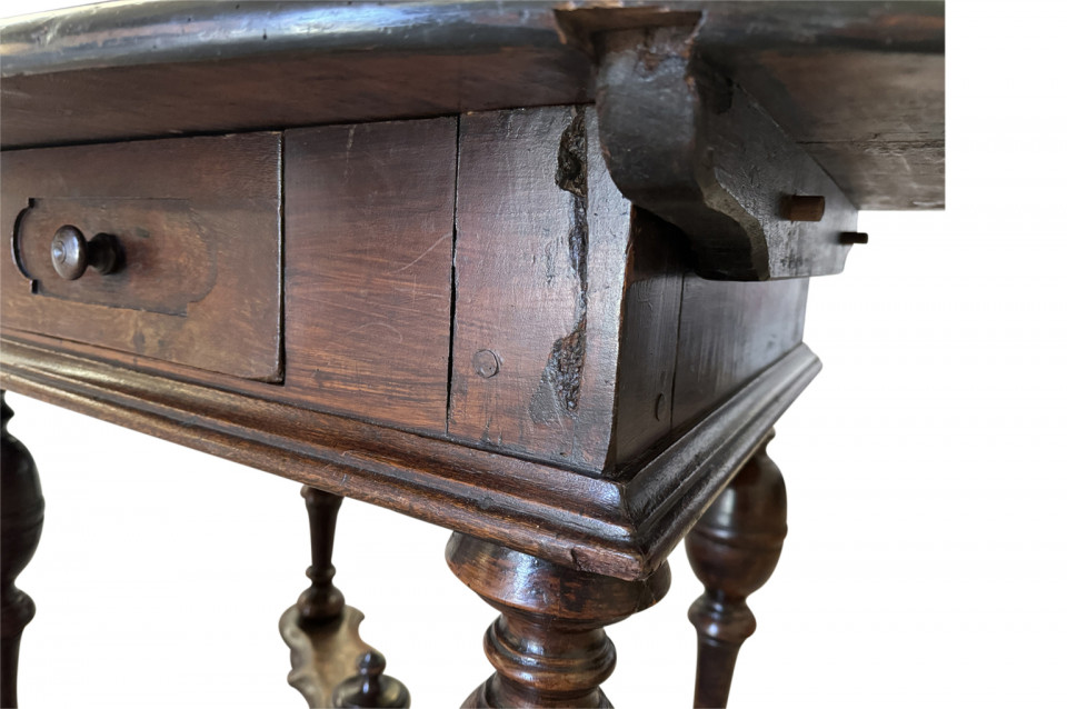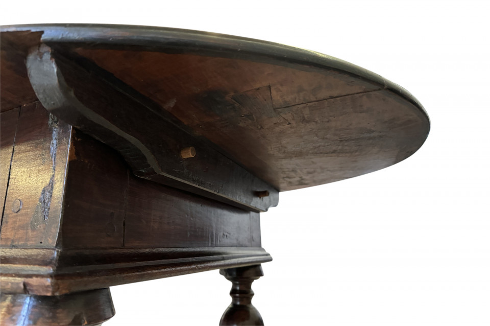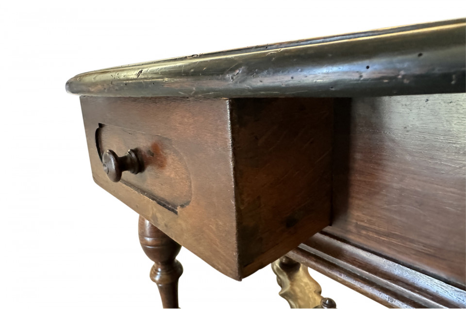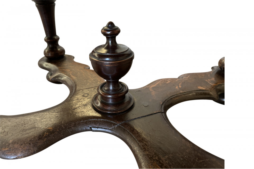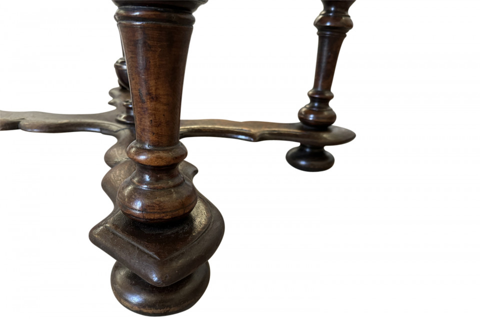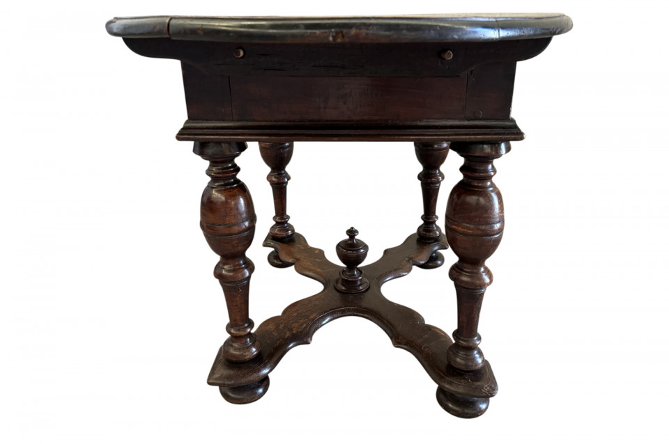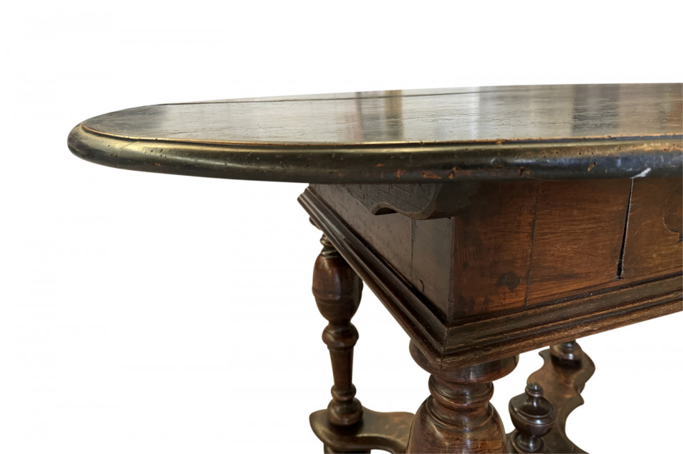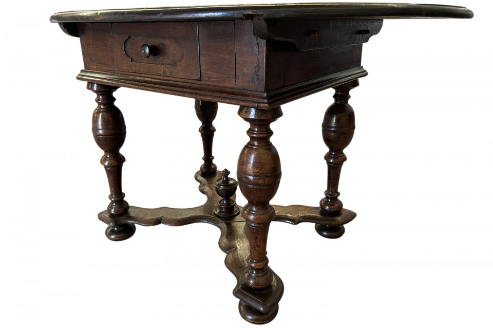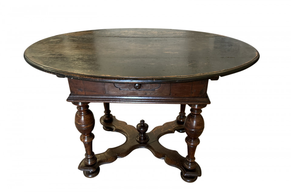 A very beautiful 18th century German oval shaped Center Table. Wonderfully constructed from handsome walnut with a single drawer, sculpted "X" stretchers and finial. Excellent patina - warm and luminous.