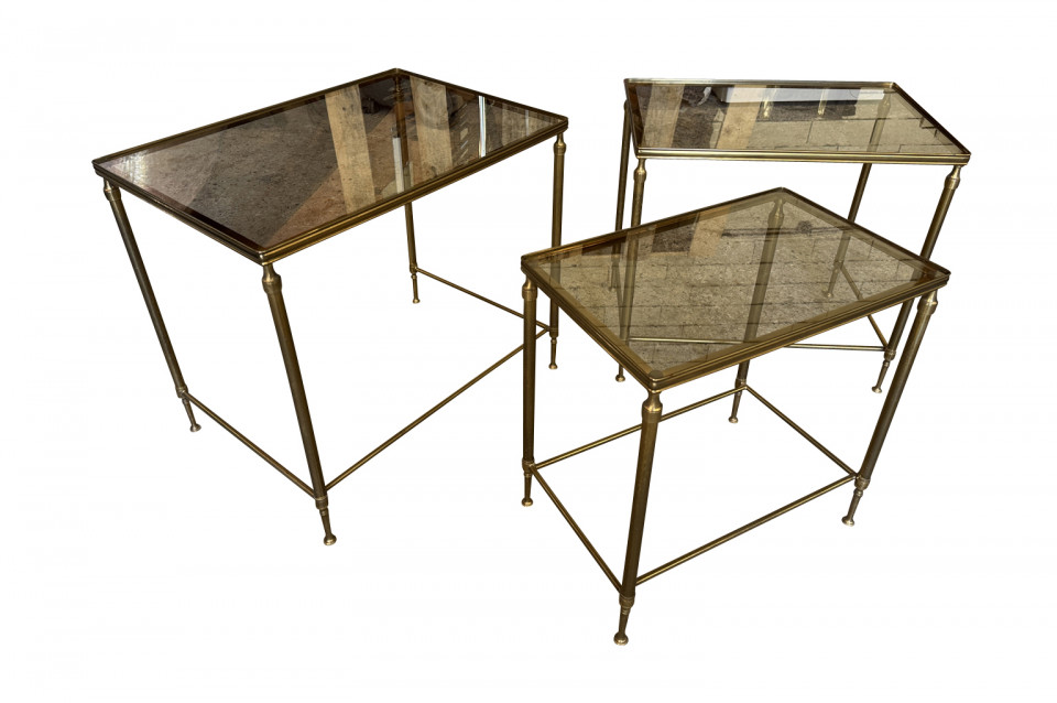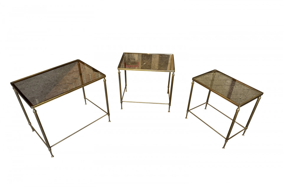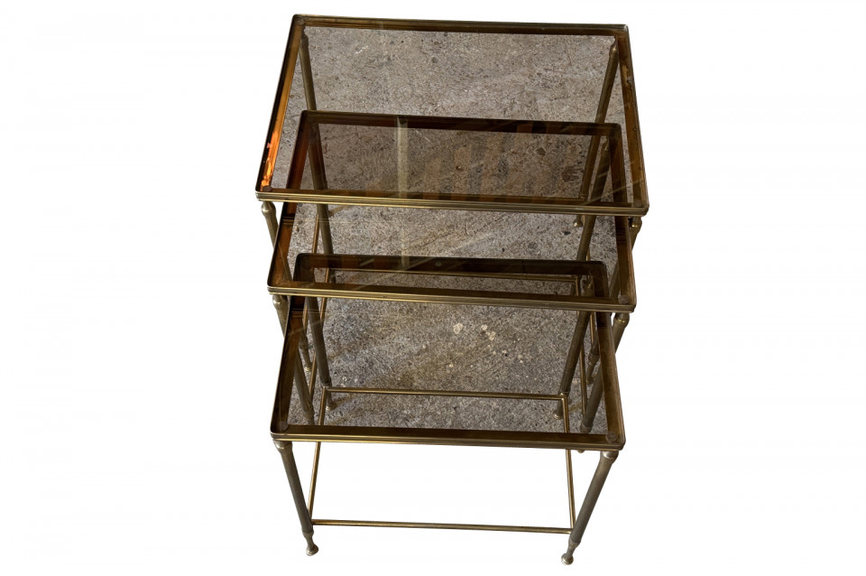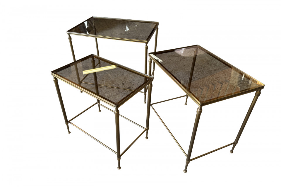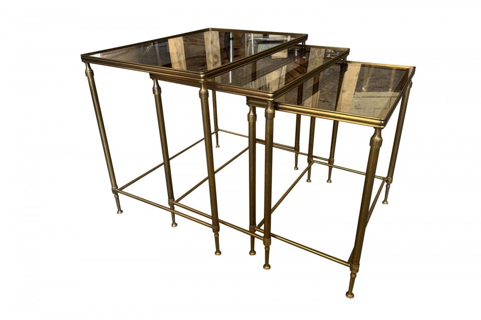 Lovely set of three Maison Jansen style Nesting Tables from Paris, France. Handsomely constructed from brass and smoked glass. The largest table measures 20" H X 22 1/2" W X 16" D. The medium sized table measures 18 7/8" H X 19 7/8" W X 13 5/8" D. The smallest table measures 17 5/8" H X 17 1/2" W X 11 1/4" D.