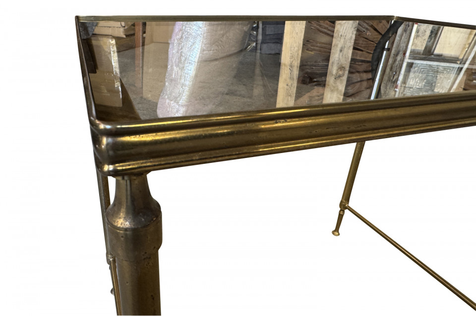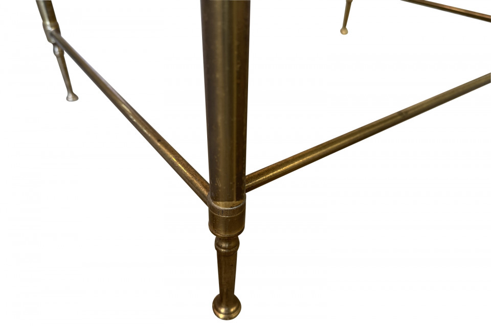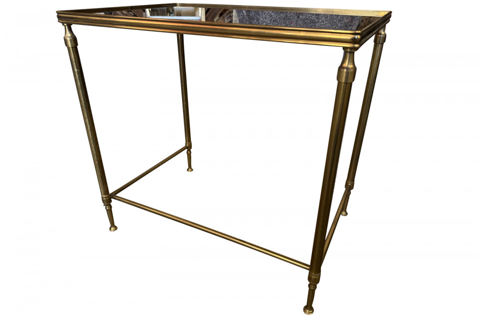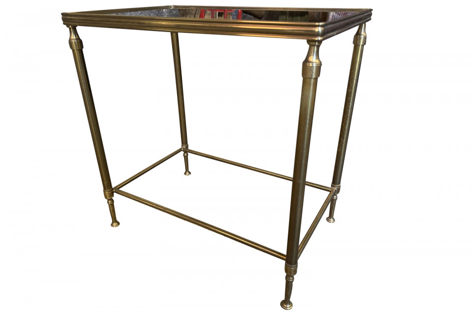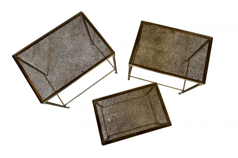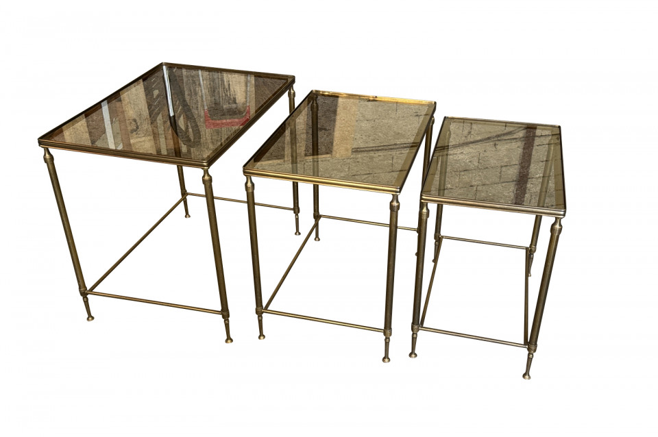 Lovely set of three Maison Jansen style Nesting Tables from Paris, France. Handsomely constructed from brass and smoked glass. The largest table measures 20" H X 22 1/2" W X 16" D. The medium sized table measures 18 7/8" H X 19 7/8" W X 13 5/8" D. The smallest table measures 17 5/8" H X 17 1/2" W X 11 1/4" D.