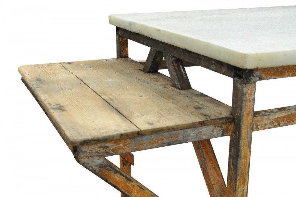 An outstanding and monumental early 20th century French Pastry Table - Table Patisserie - beautifully constructed from marble and iron. A tremendous kitchen island, potting table, bar table or work table.