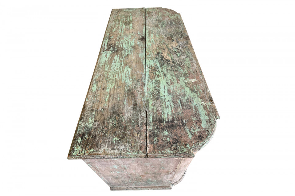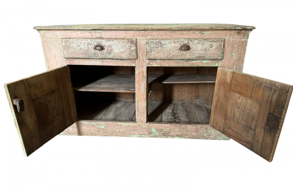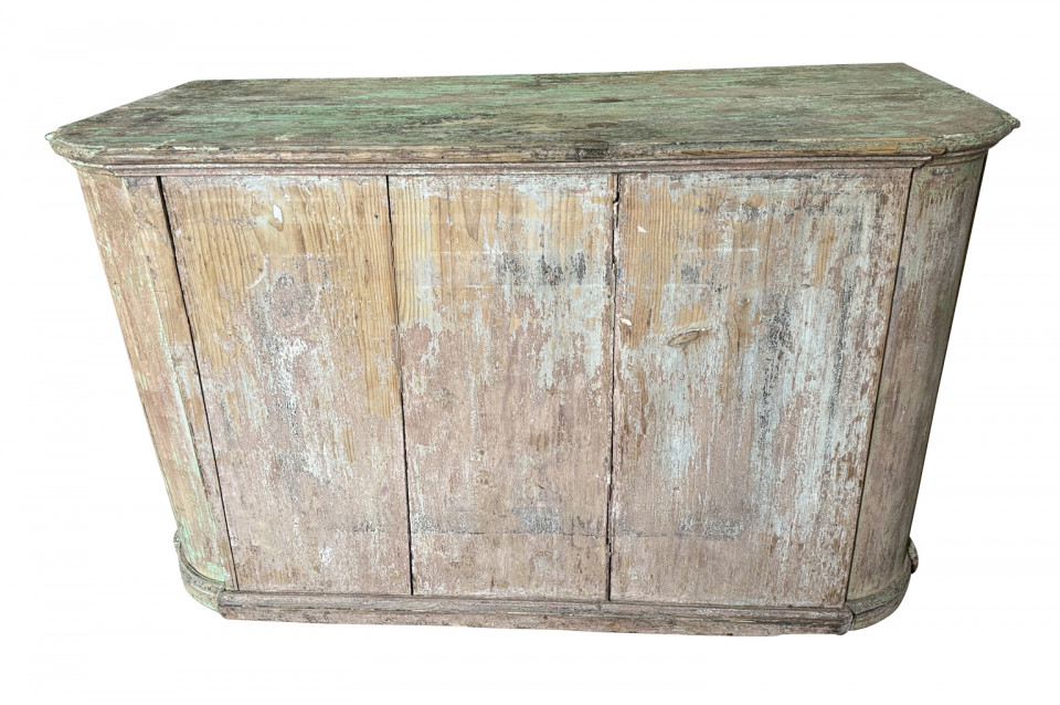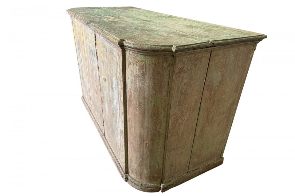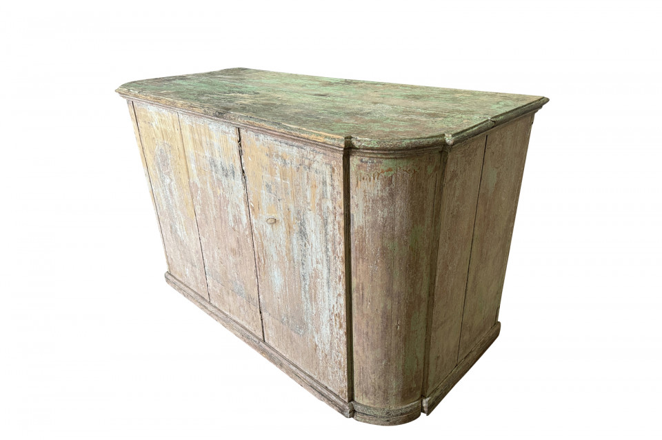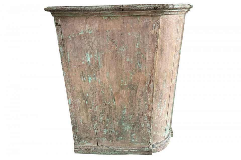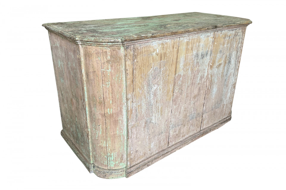 A charming 19th century Comptoir – Shop Counter from the South of France. Sturdily constructed from painted pine with traces of the original paint with a shaped top surface over a shaped cabinet with 2 drawers and double doors. Perfect as a kitchen island or bar counter.