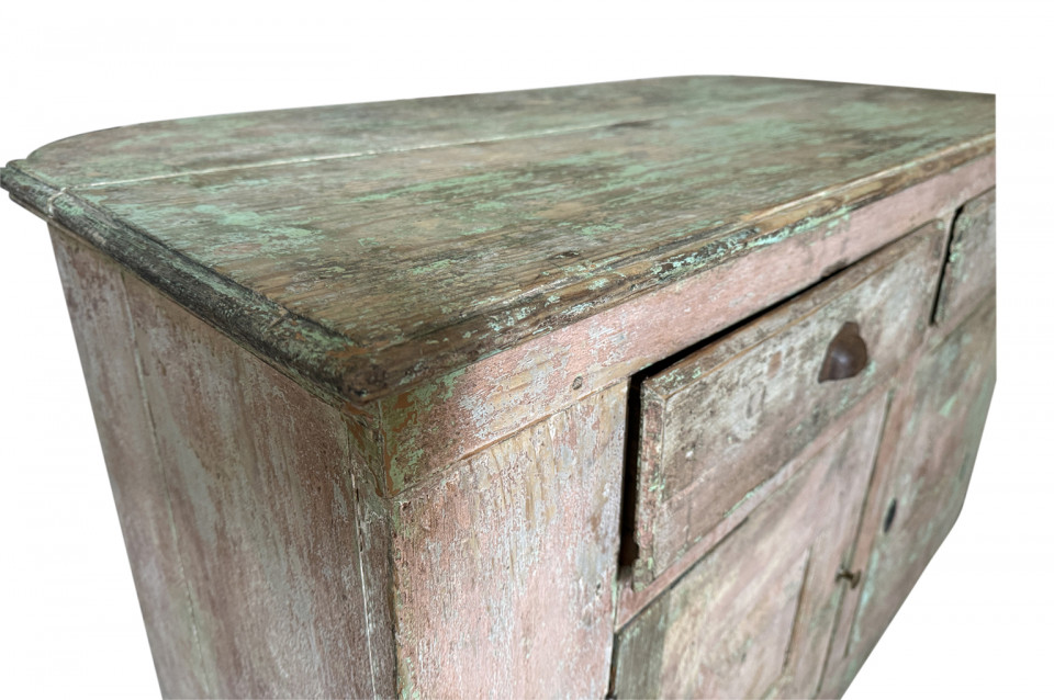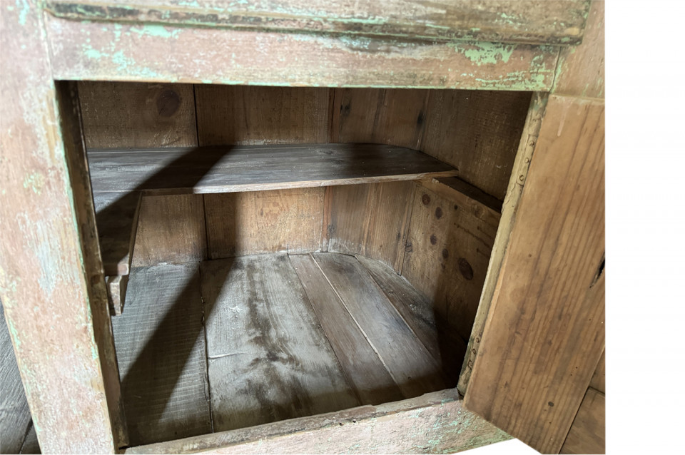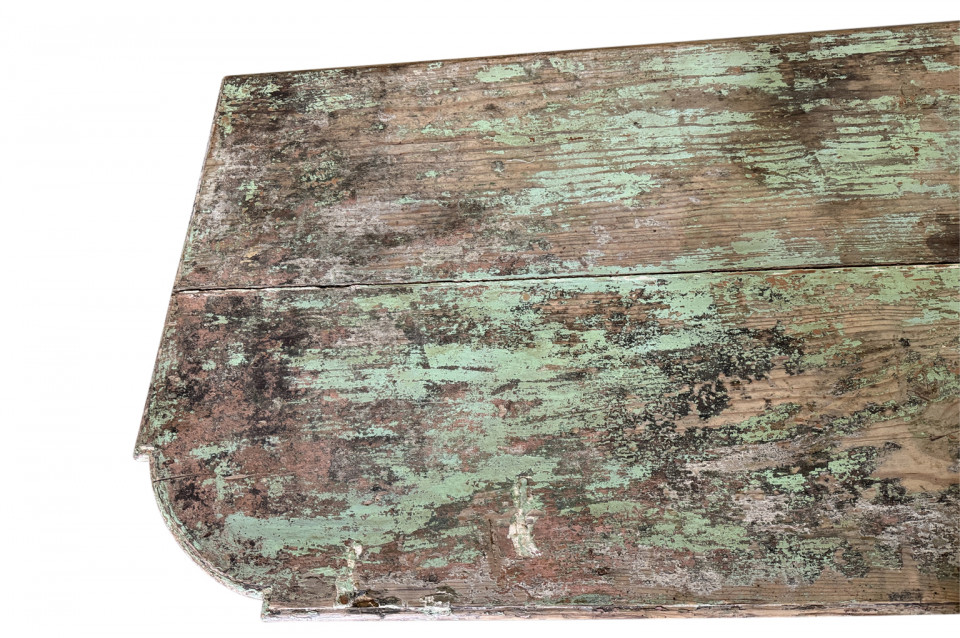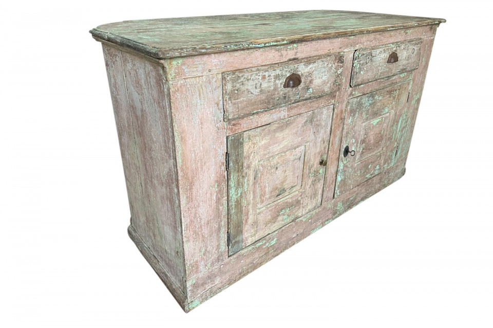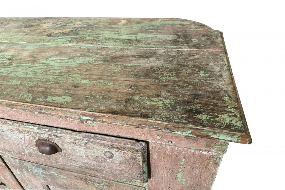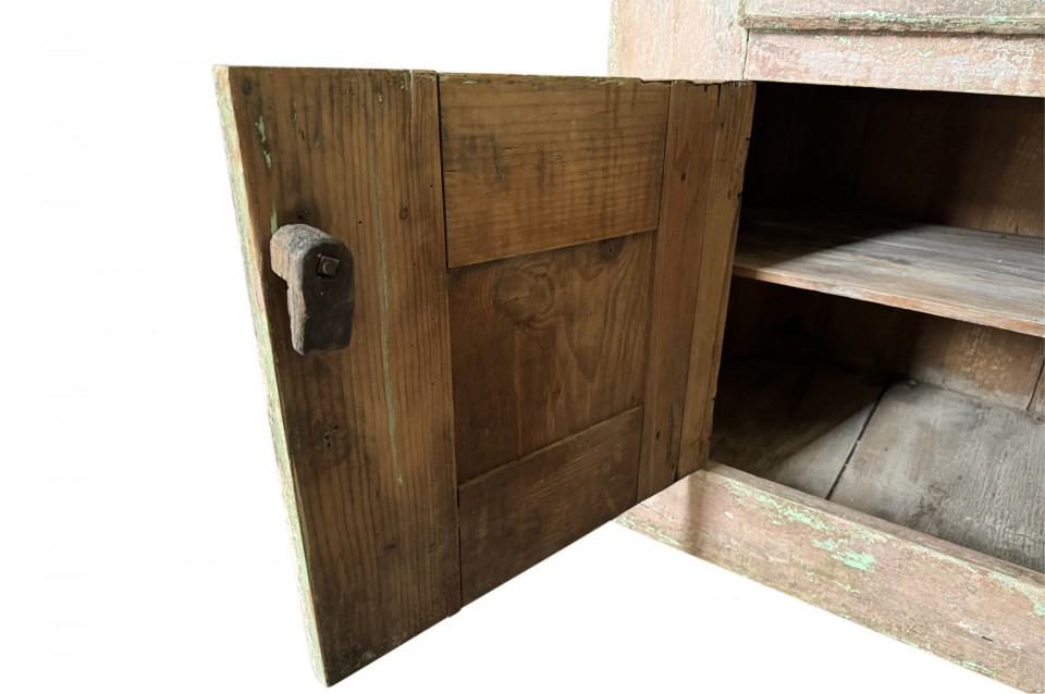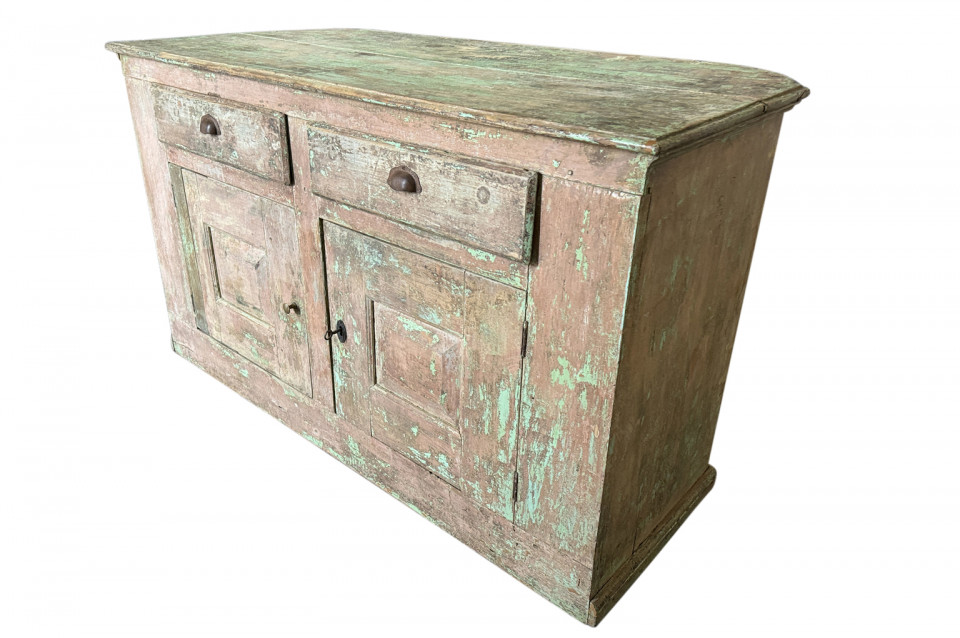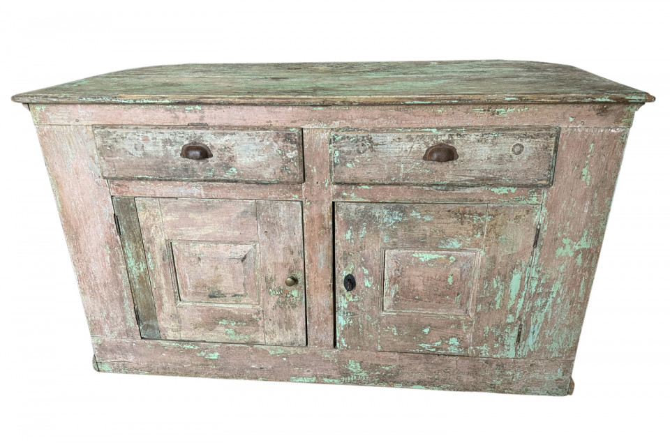 A charming 19th century Comptoir – Shop Counter from the South of France. Sturdily constructed from painted pine with traces of the original paint with a shaped top surface over a shaped cabinet with 2 drawers and double doors. Perfect as a kitchen island or bar counter.