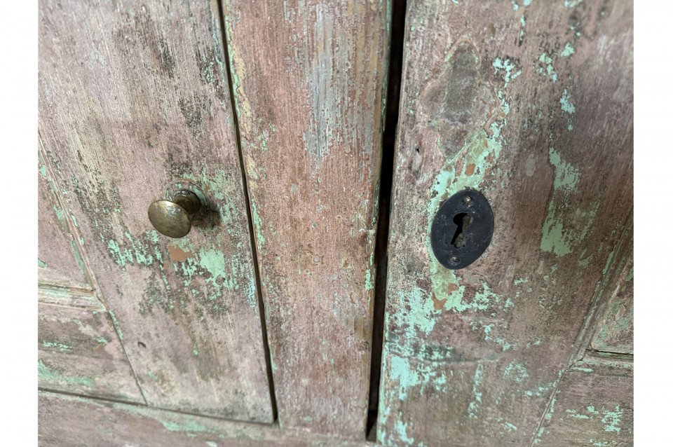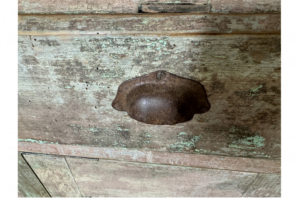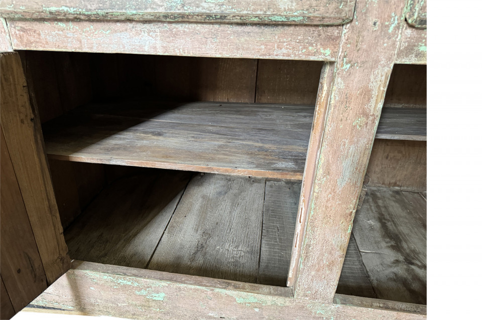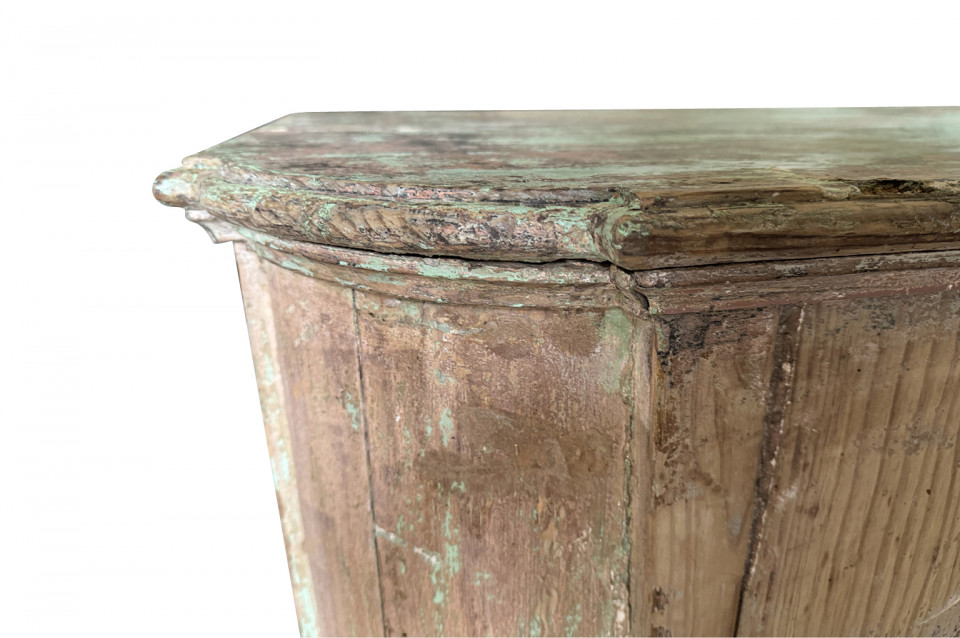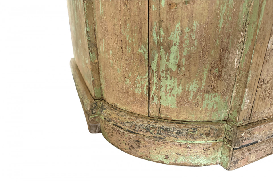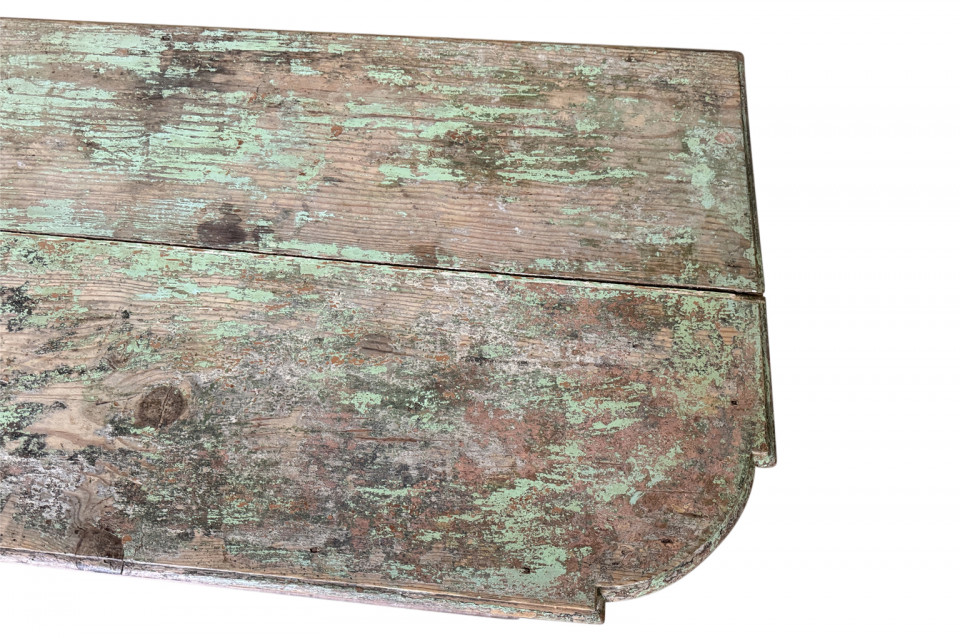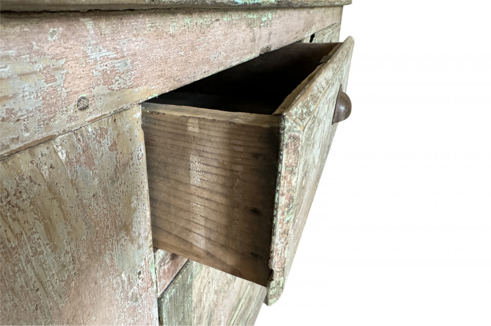 A charming 19th century Comptoir – Shop Counter from the South of France. Sturdily constructed from painted pine with traces of the original paint with a shaped top surface over a shaped cabinet with 2 drawers and double doors. Perfect as a kitchen island or bar counter.