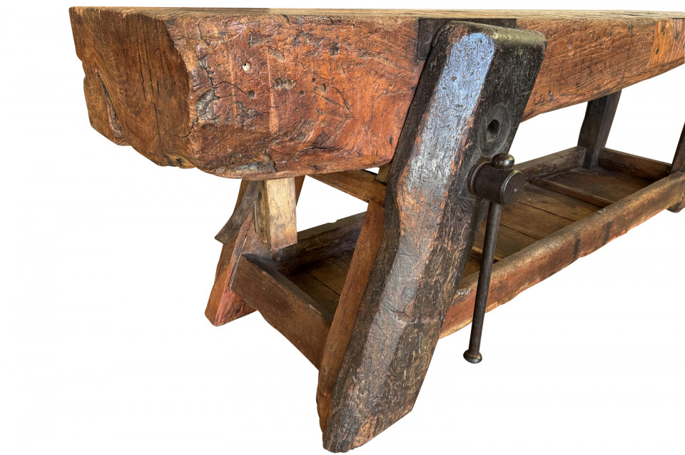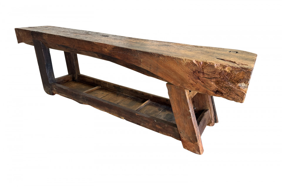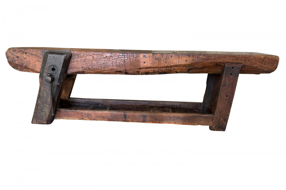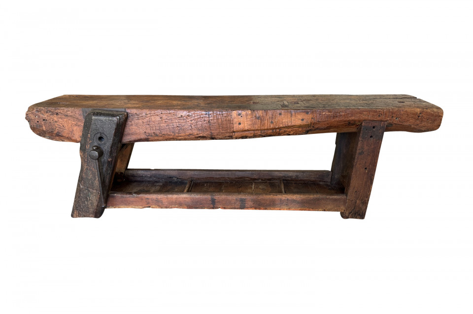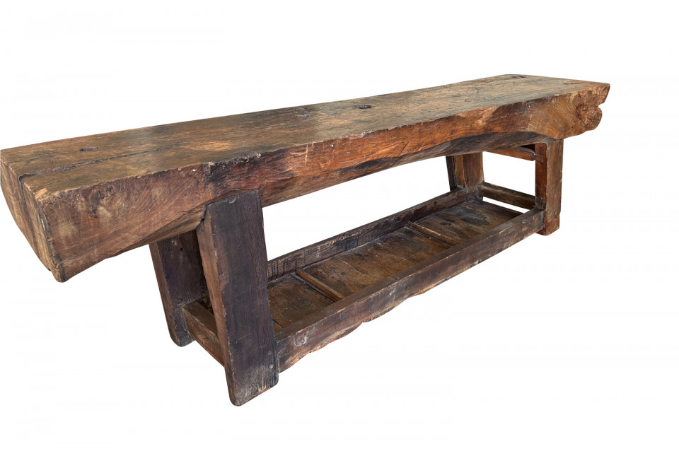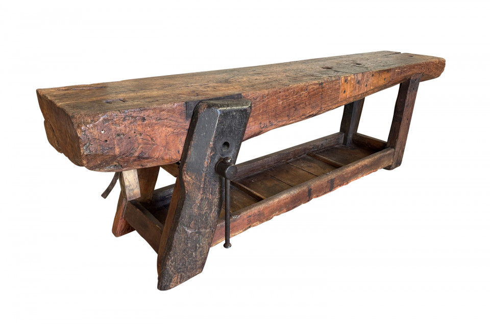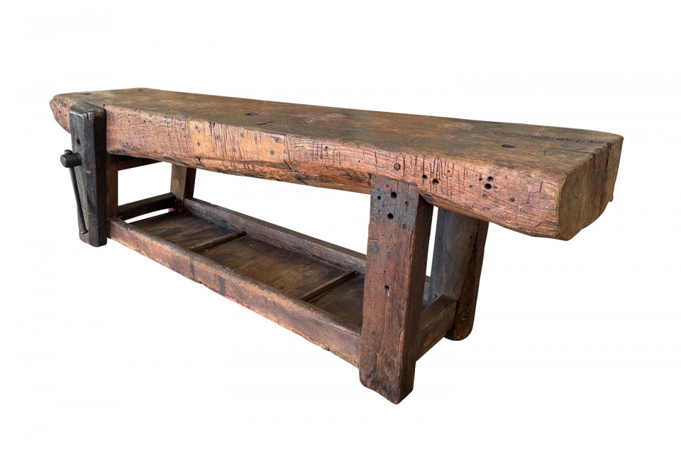 An outstanding and truly exceptional French early 19th century Etabli - Work Bench from the Ardeche region of France. Wonderfully constructed from handsome chestnut with a very thick work surface, impressive vice and lower shelf. Sensational patina. A perfect console table for rustic or contemporary surrounding.