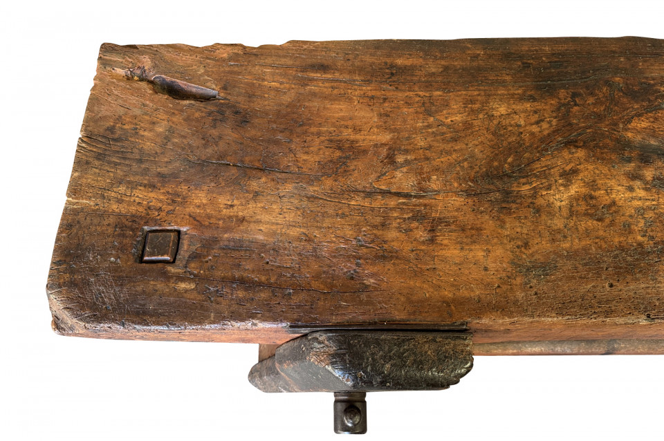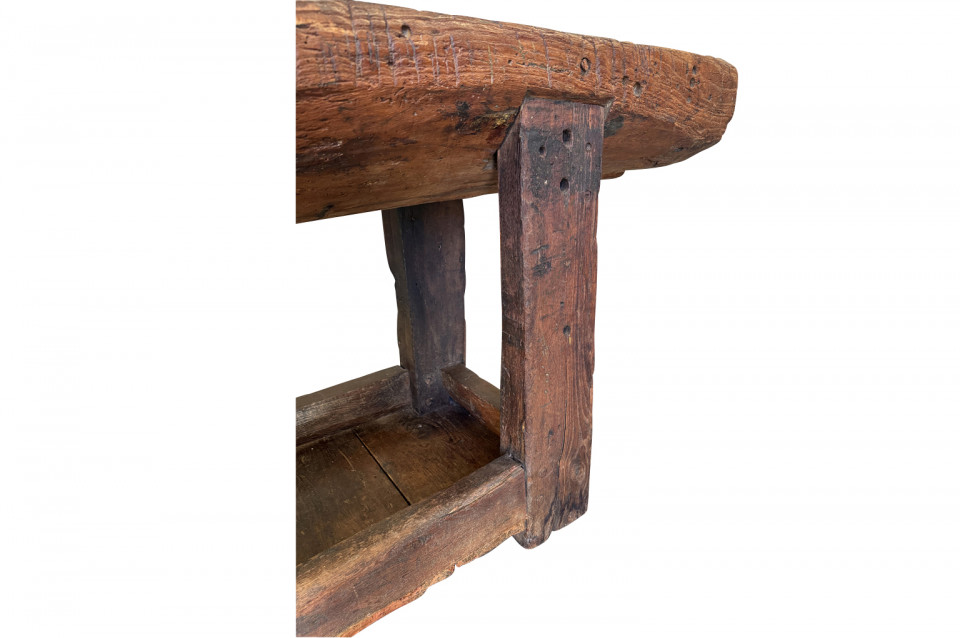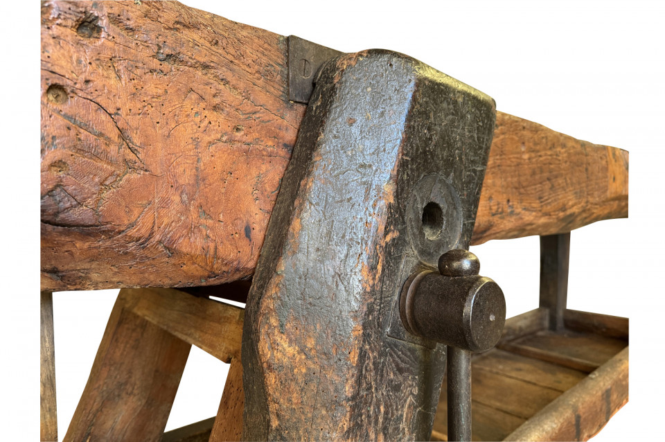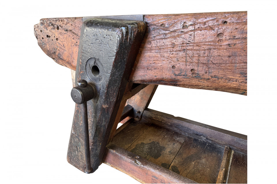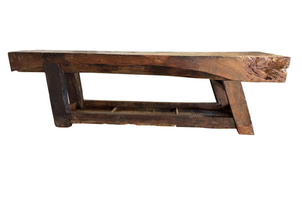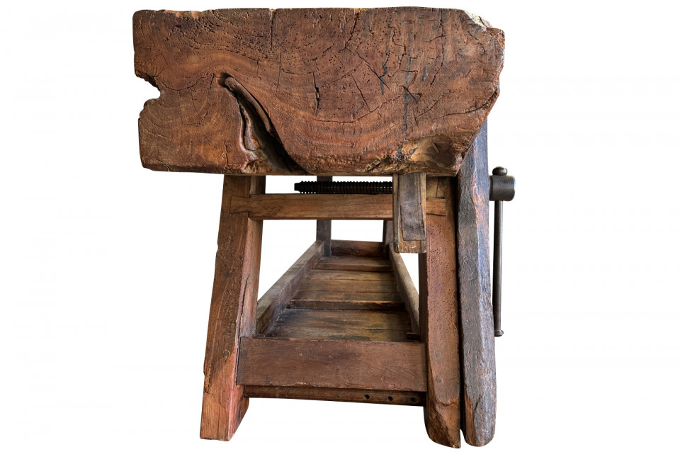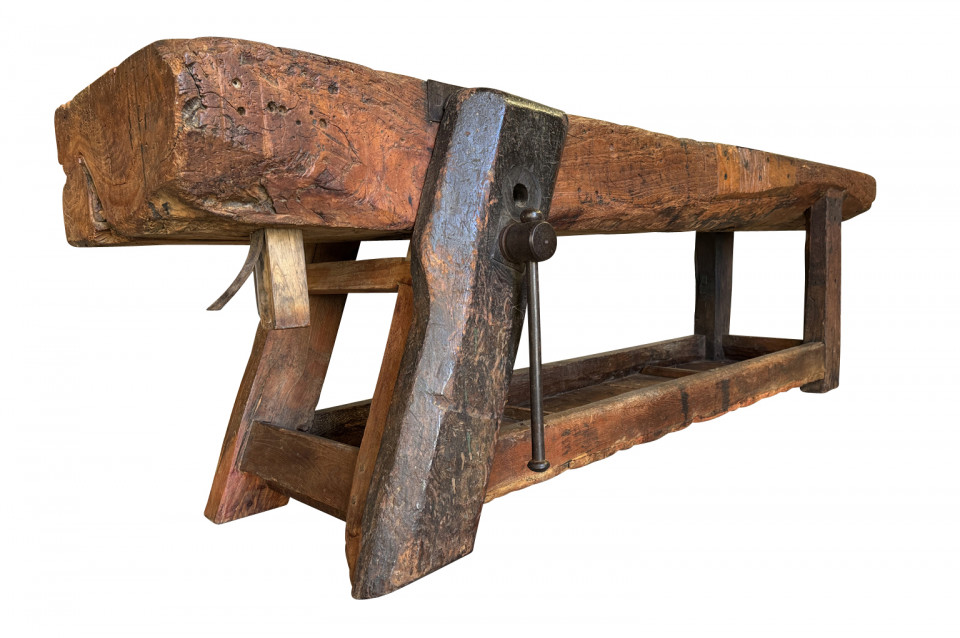 An outstanding and truly exceptional French early 19th century Etabli - Work Bench from the Ardeche region of France. Wonderfully constructed from handsome chestnut with a very thick work surface, impressive vice and lower shelf. Sensational patina. A perfect console table for rustic or contemporary surrounding.